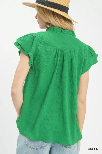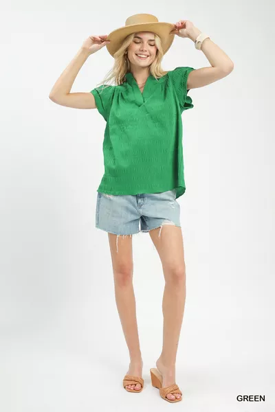 This Textured Flutter Sleeve Split Neck Top features a unique textured fabric for subtle dimension. It has a flattering split neckline and delicate flutter sleeves for a feminine touch. The relaxed fit ensures comfort while maintaining a polished silhouette. Soft and lightweight, it’s ideal for all-day wear in warm weather. Versatile and chic, it pairs easily with any casual bottom.