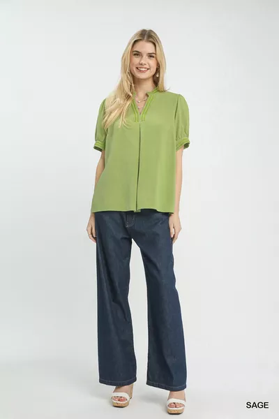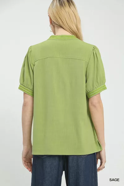 Umgee Embroidery Linen Puff Sleeve Blouse