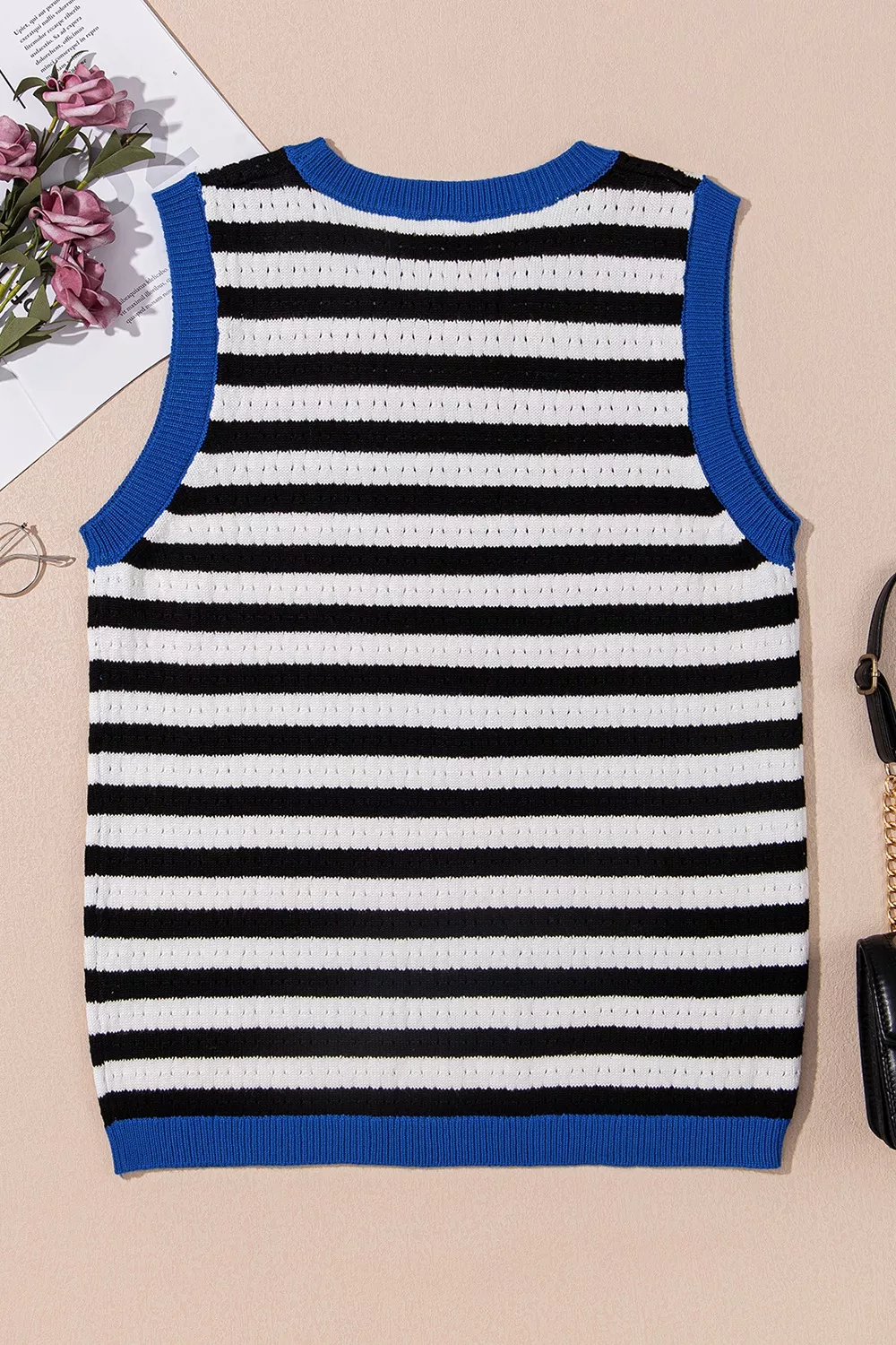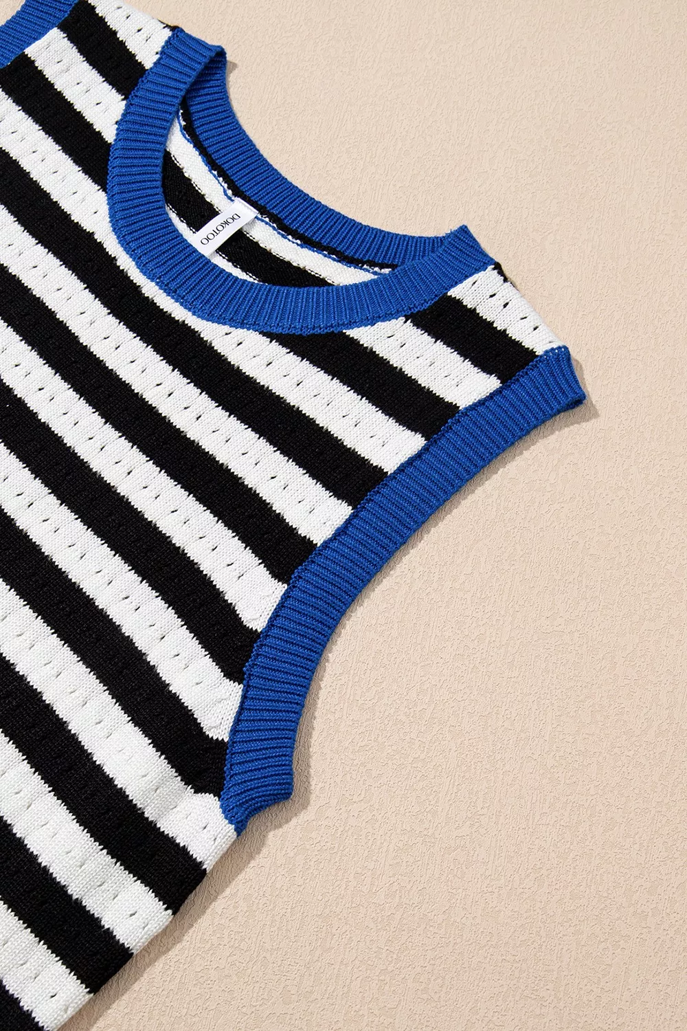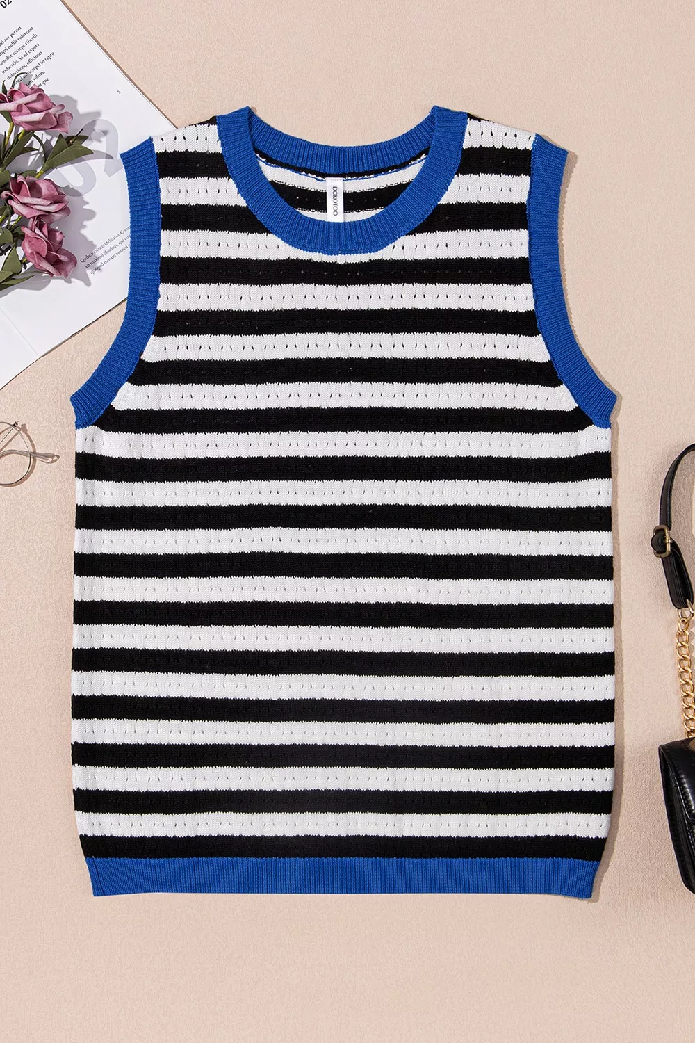 Stripe Pointelle Knit Contrast Trim Sleeveless Sweater Top