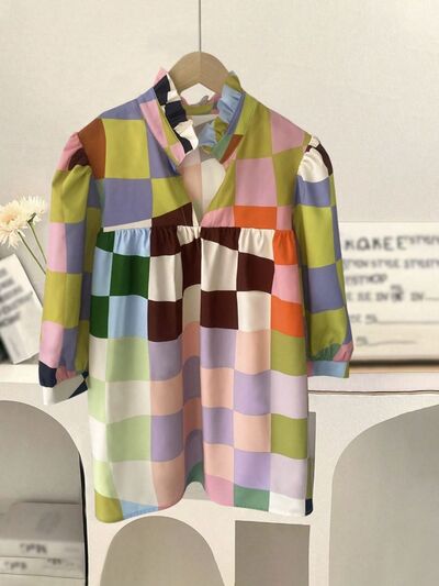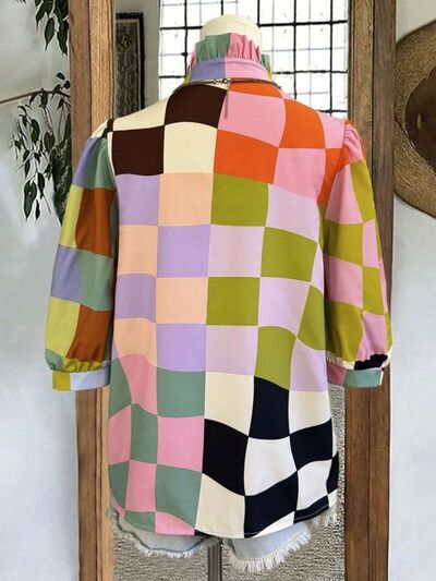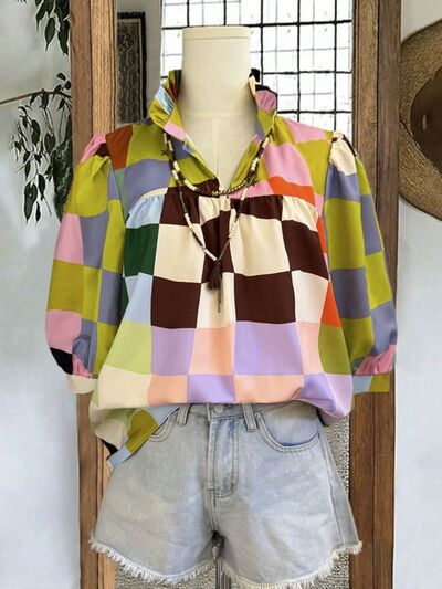 Plaid Ruffle Collar Half Sleeve Blouse