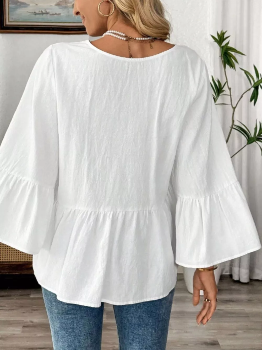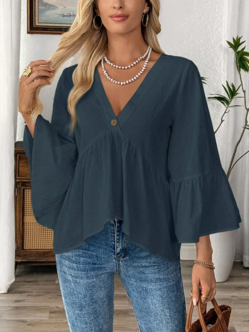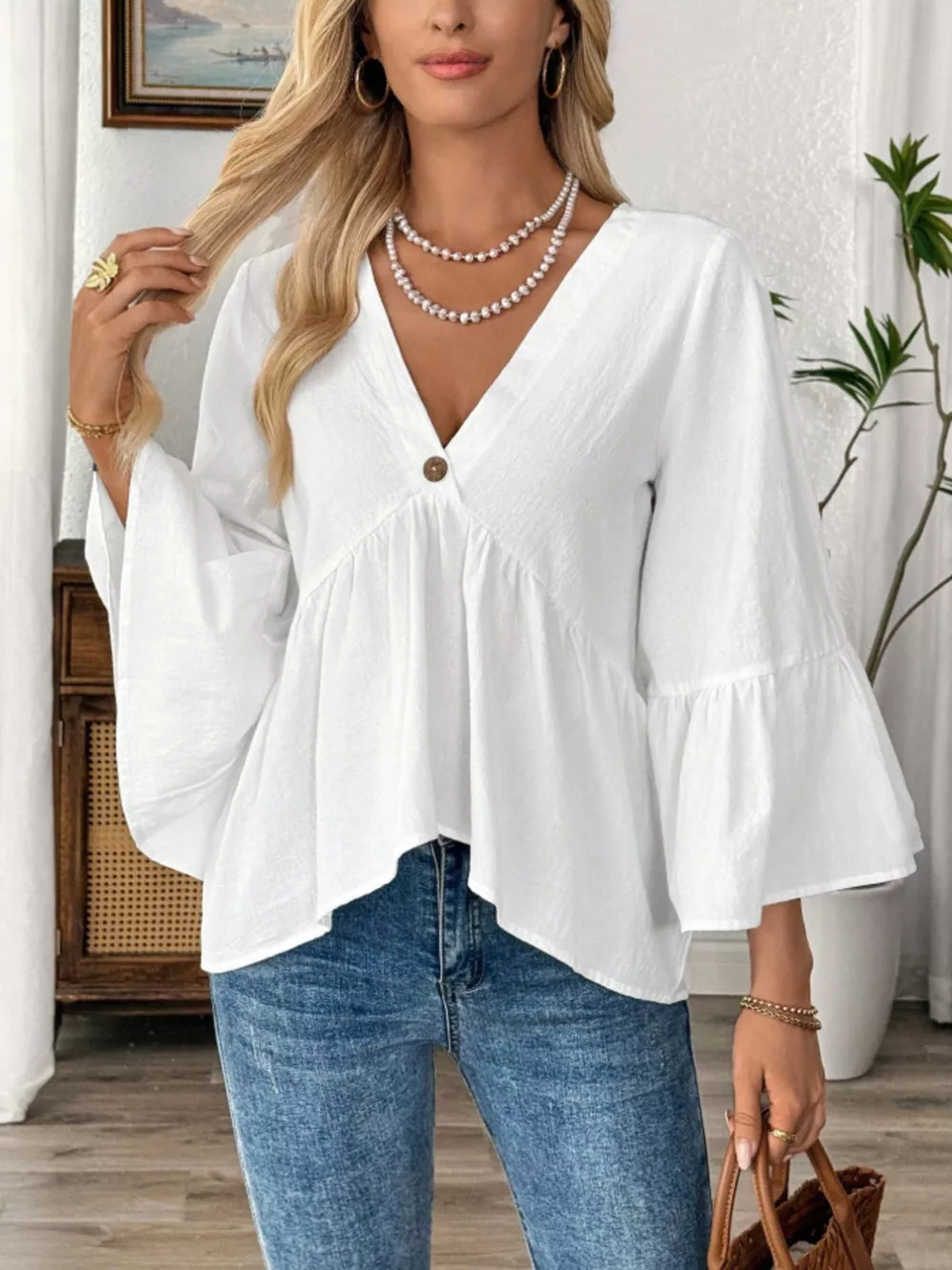 V-Neck Bell Sleeve Blouse