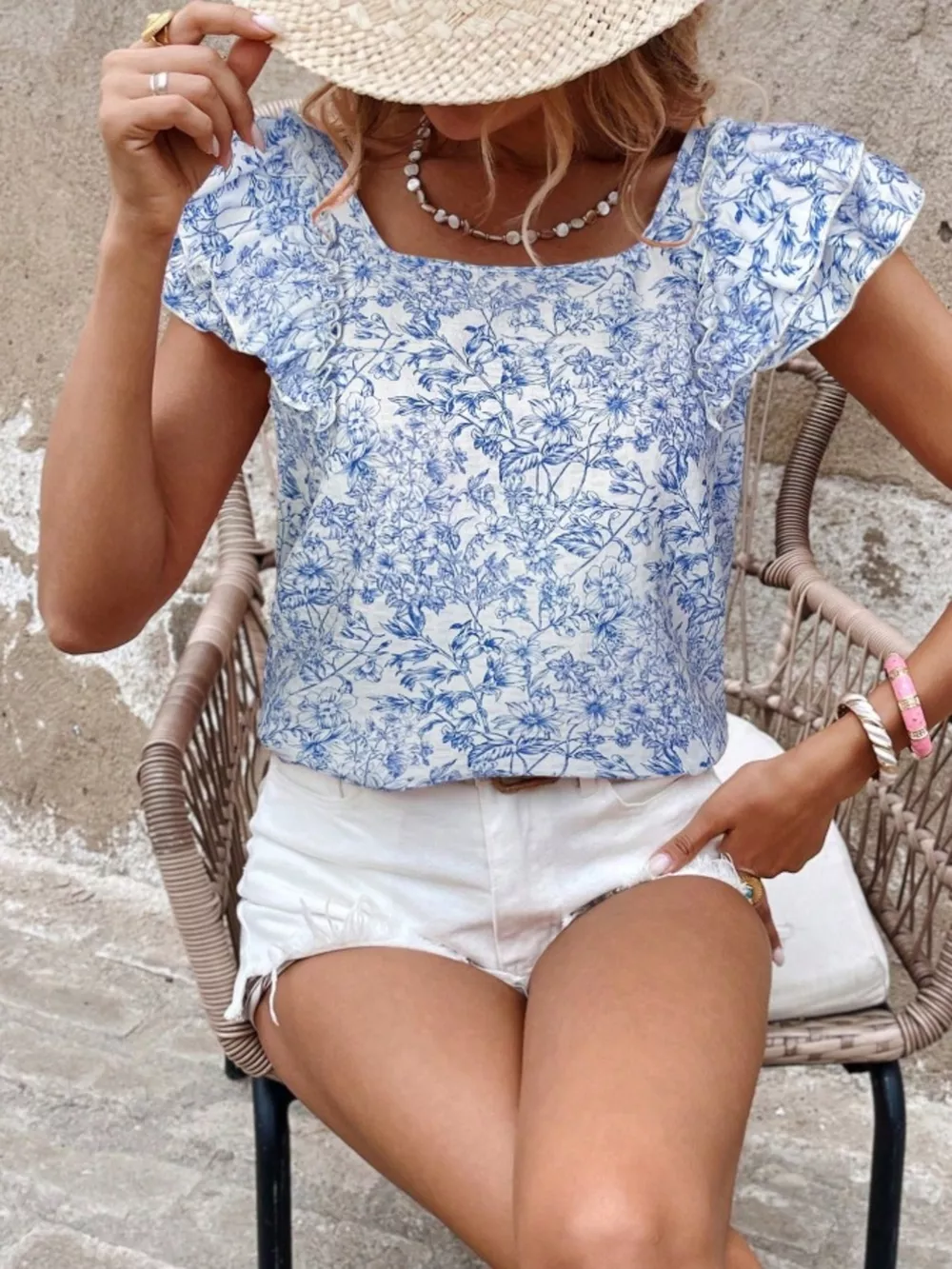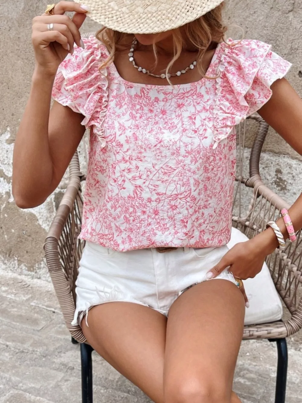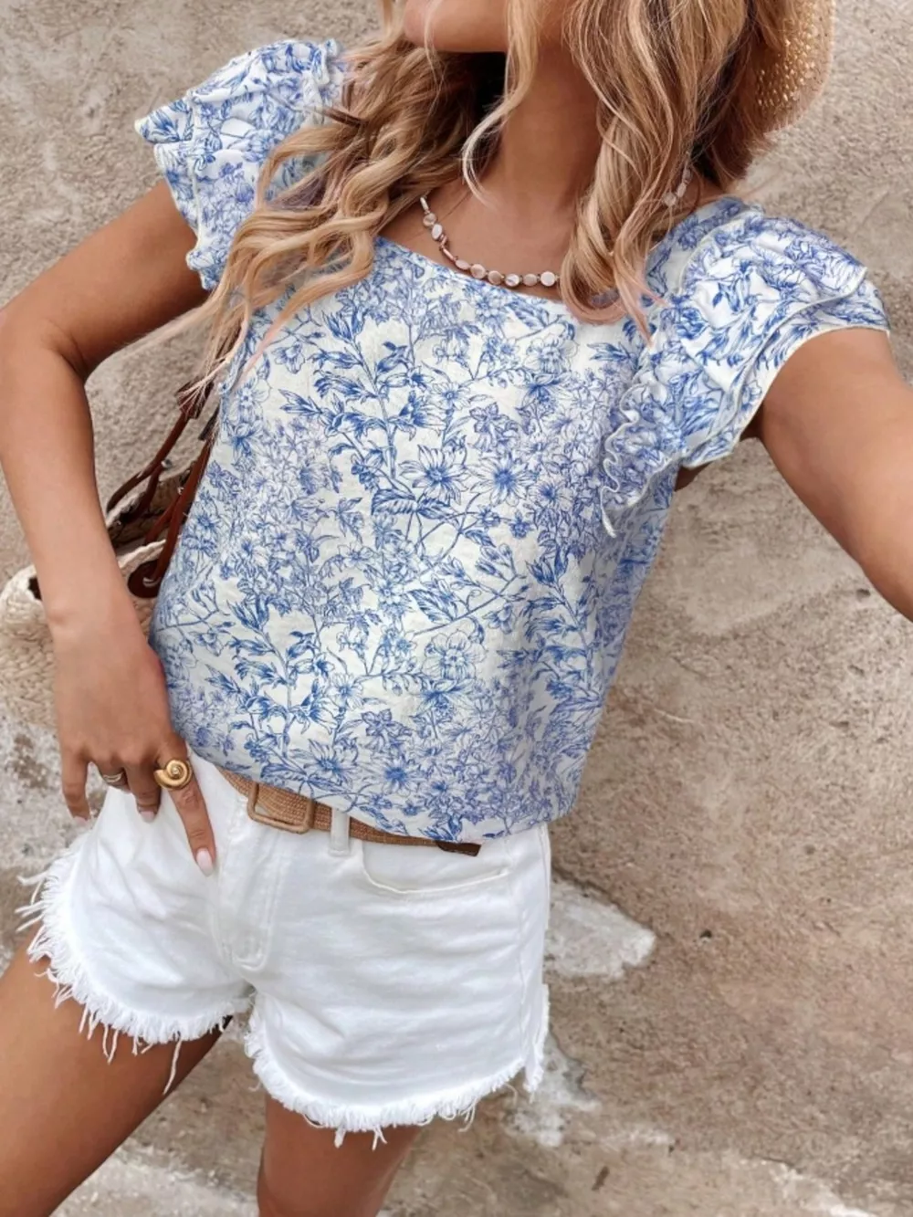 Floral Print Ruffle Trim Blouse