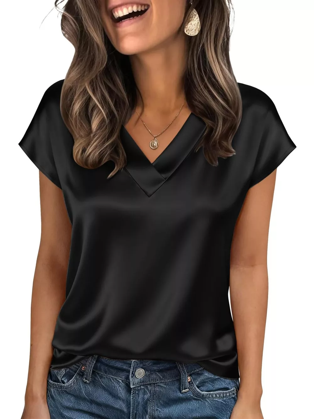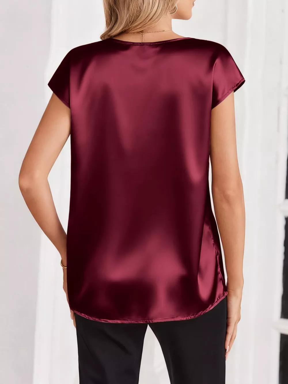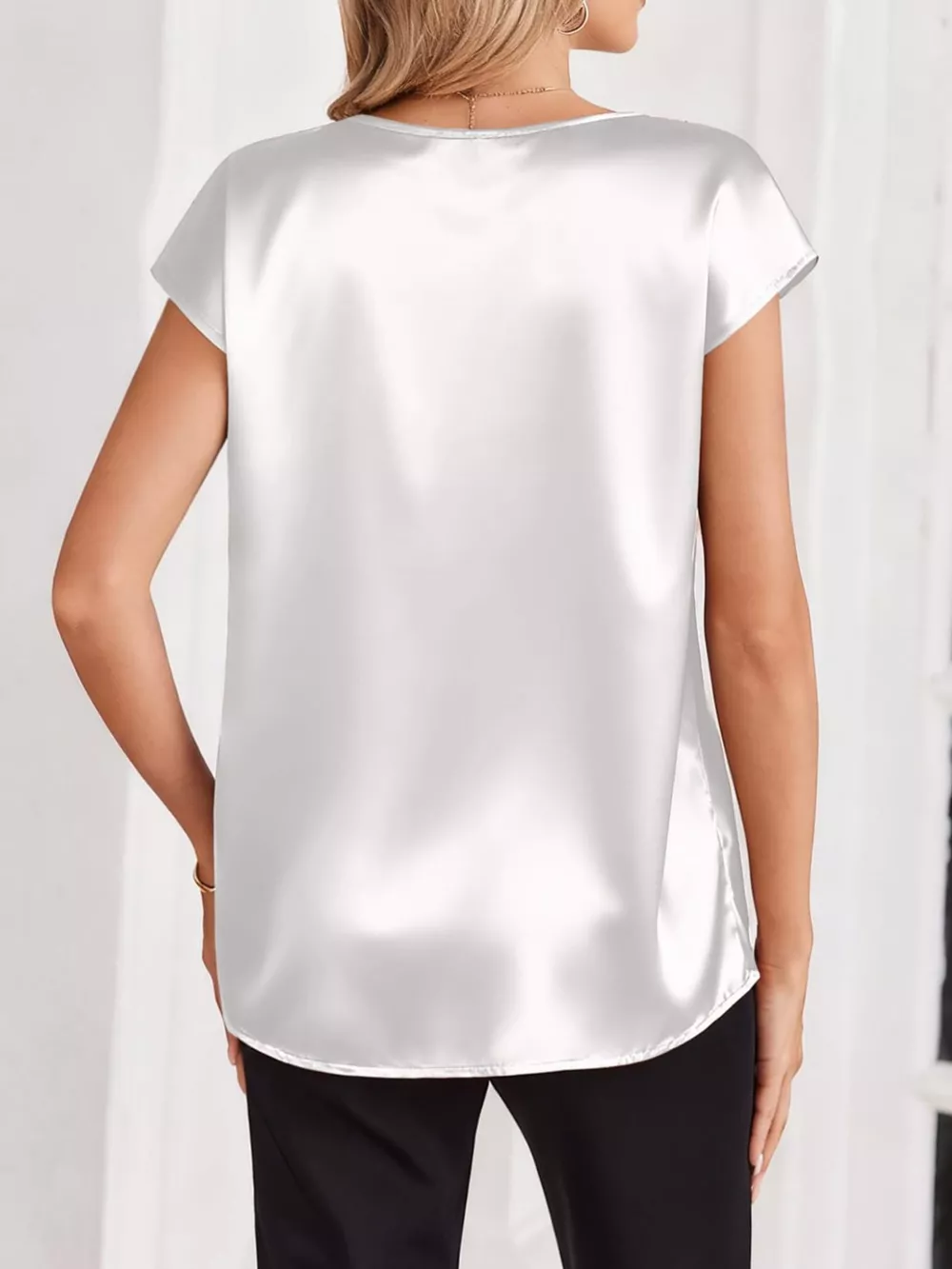 Satin V-Neck Cap Sleeve Blouse