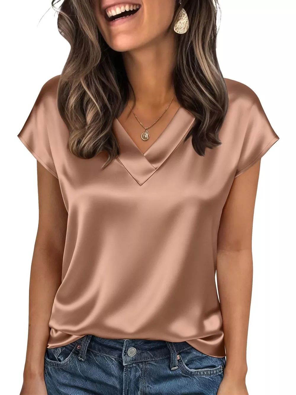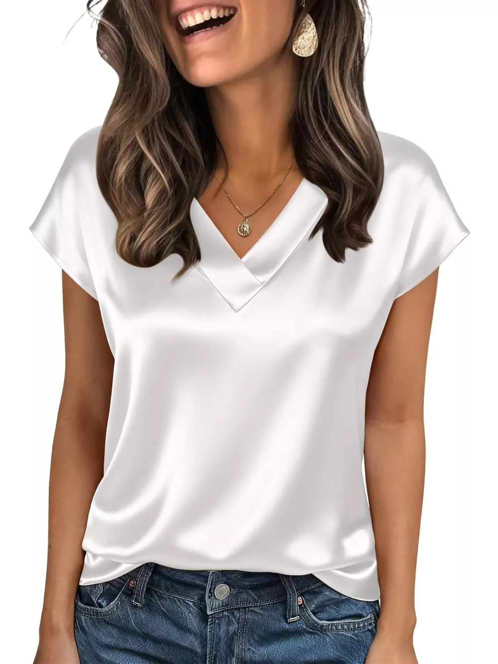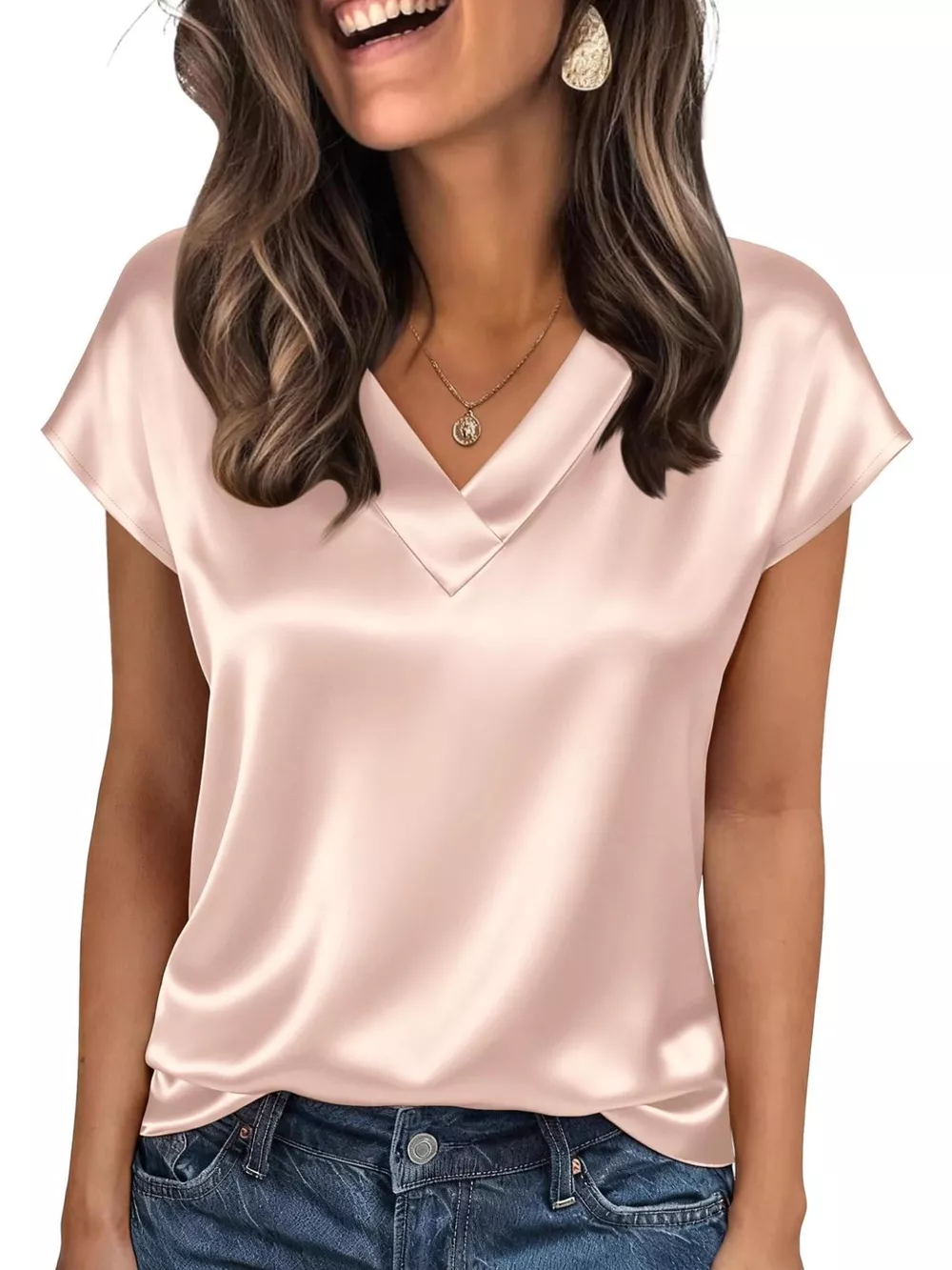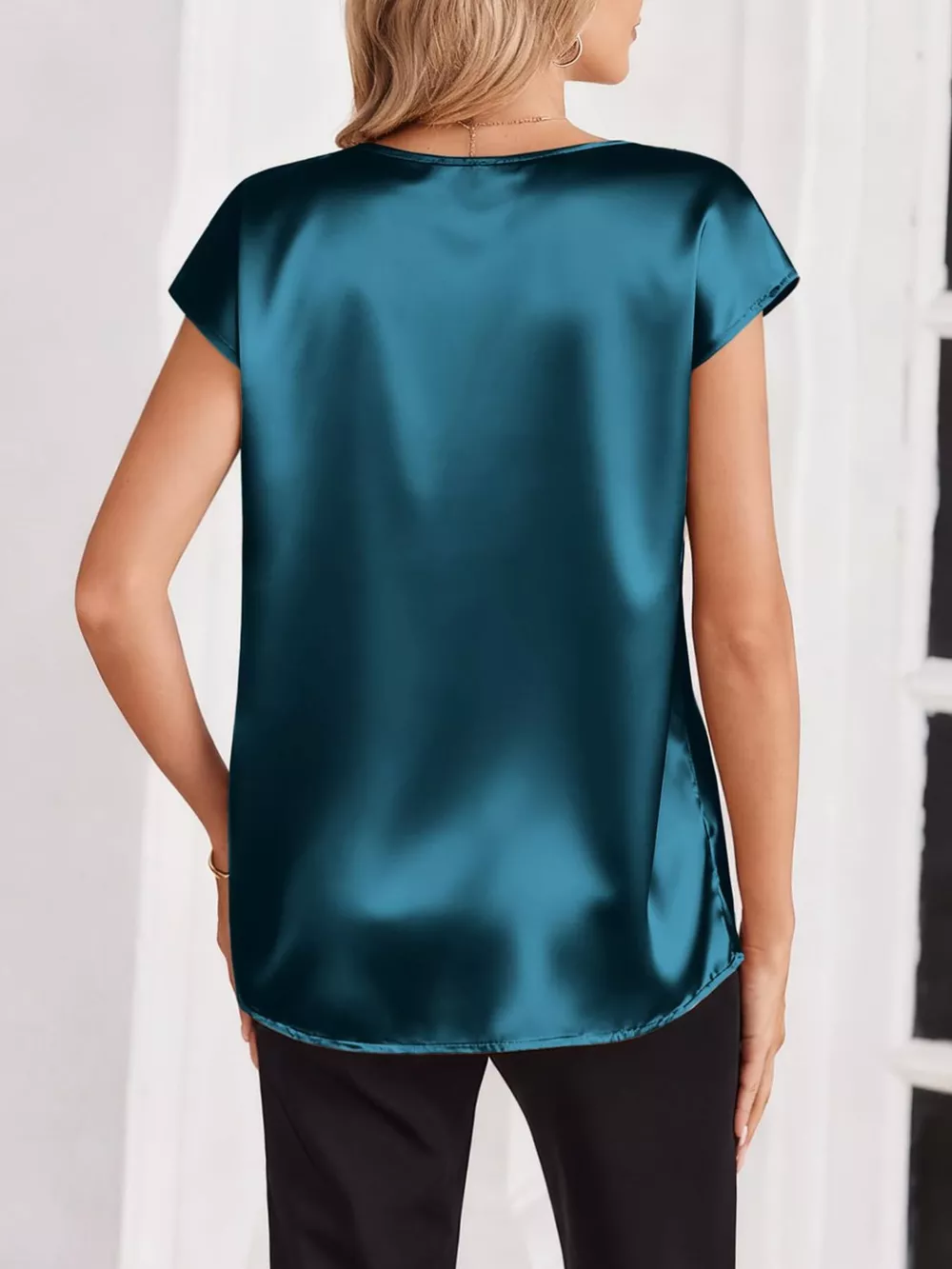 Satin V-Neck Cap Sleeve Blouse