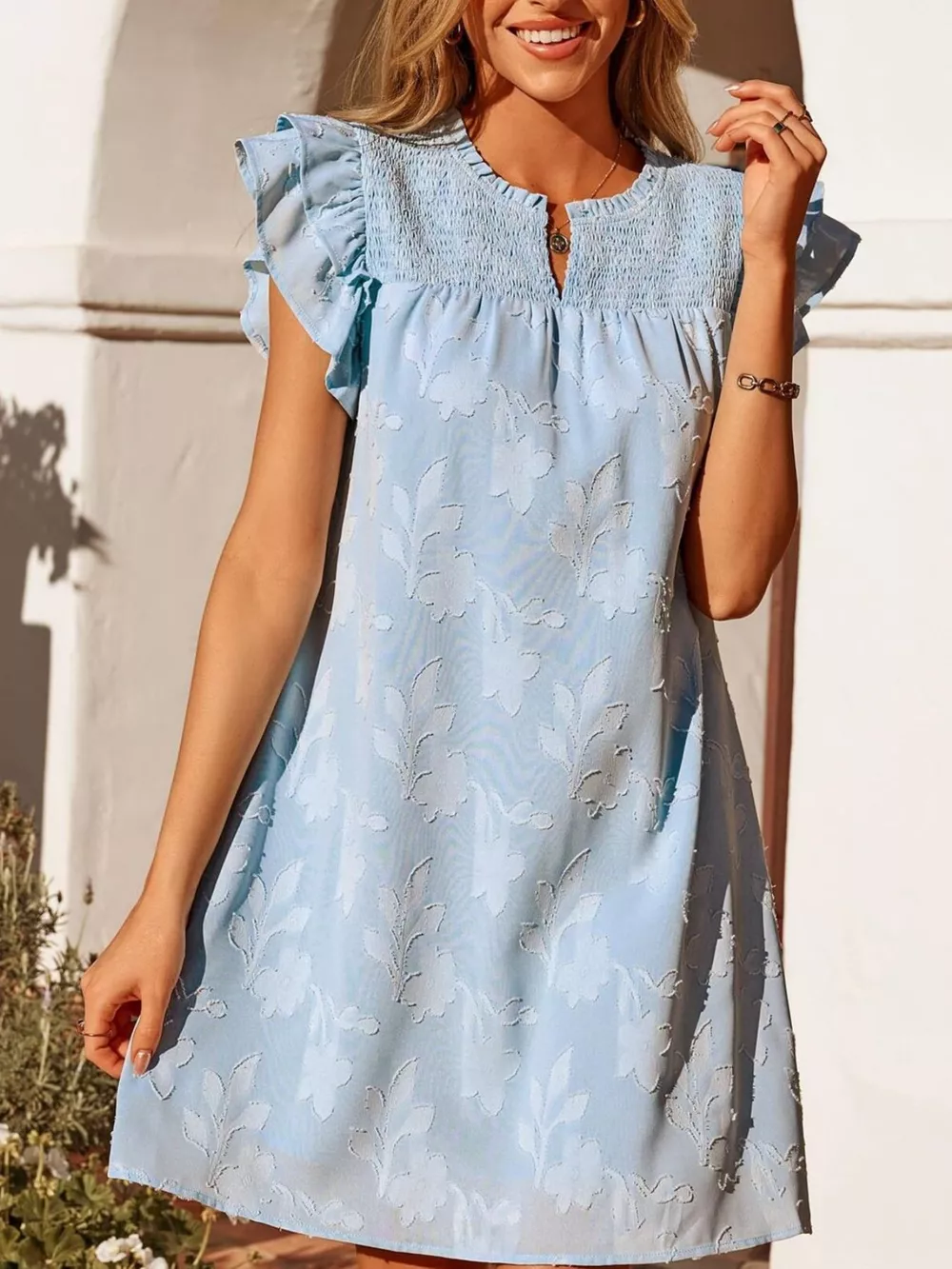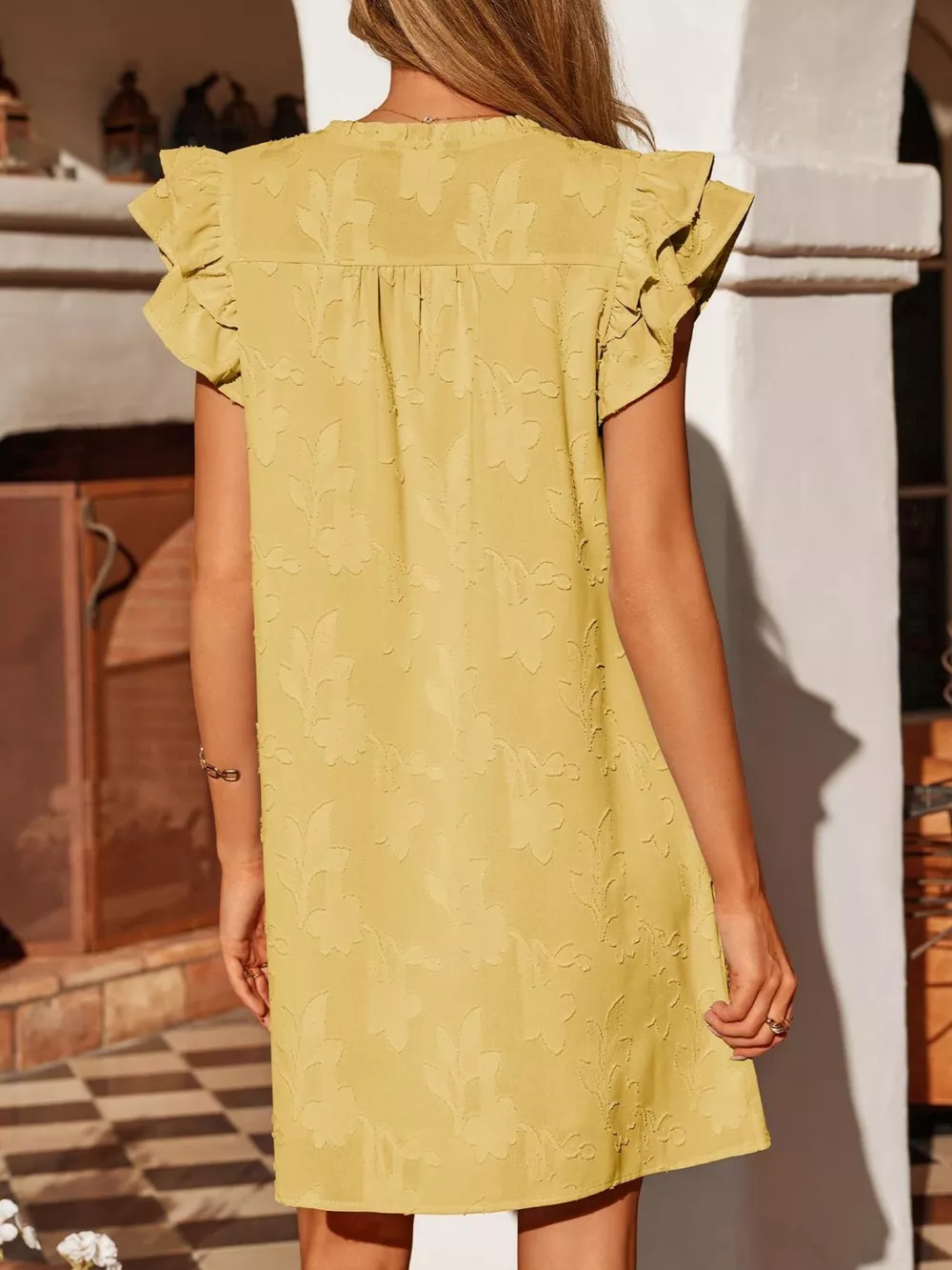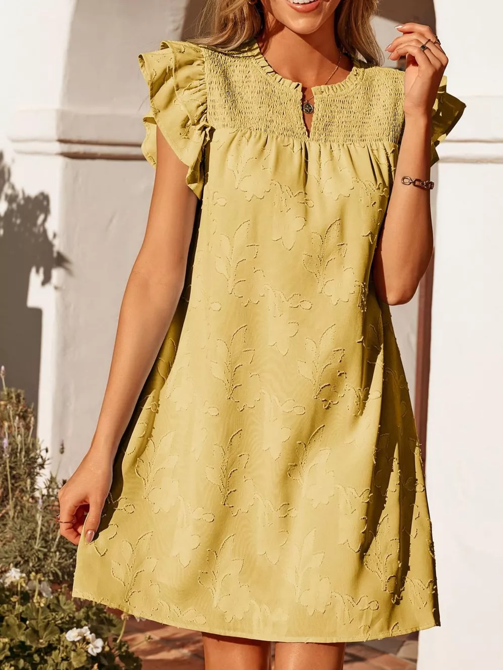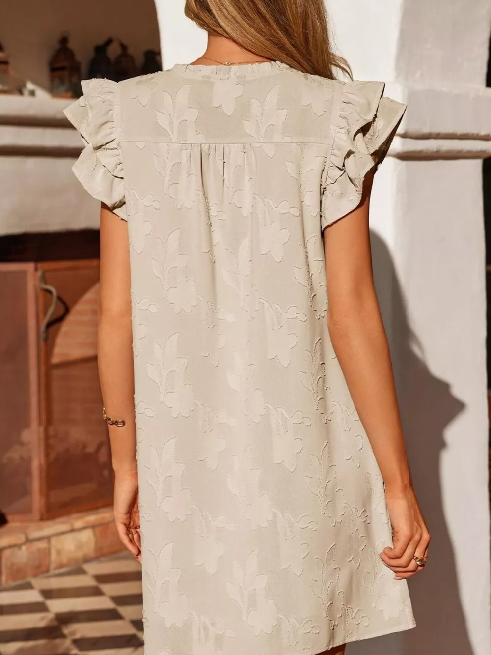 Floral Embossed Ruffle Sleeve Mini Dress
