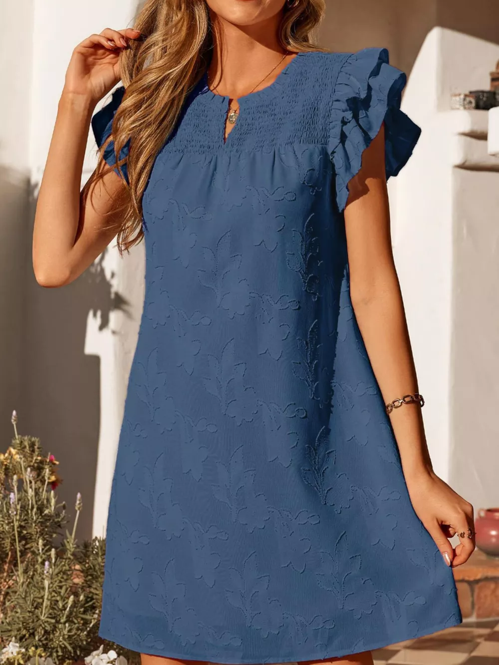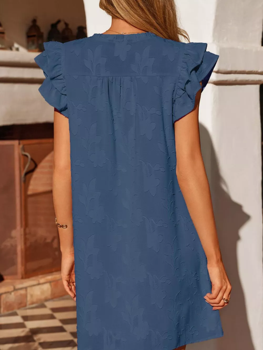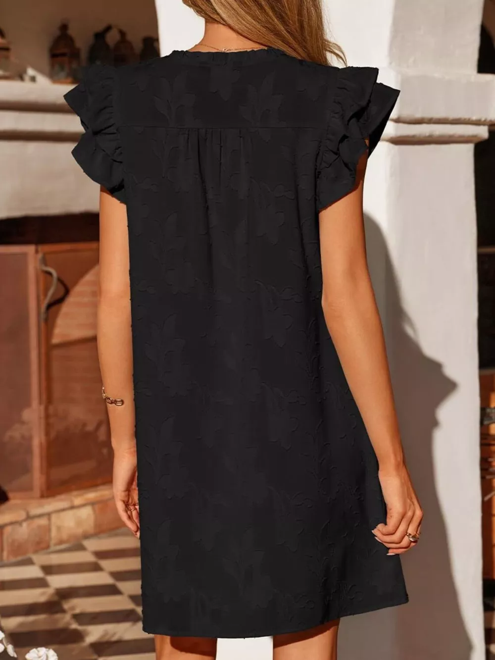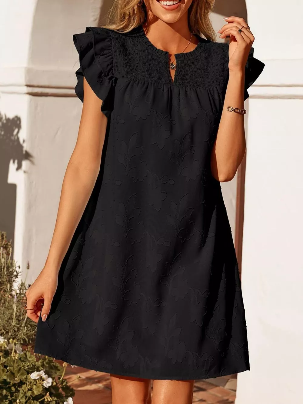 Floral Embossed Ruffle Sleeve Mini Dress