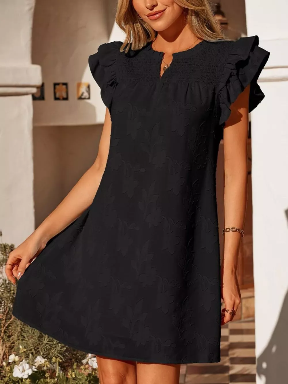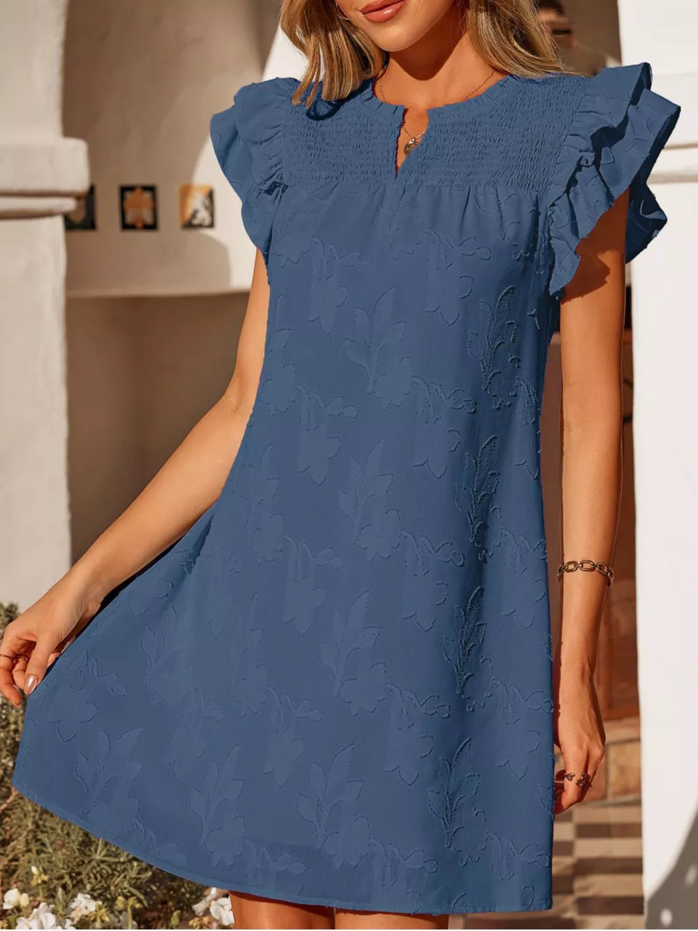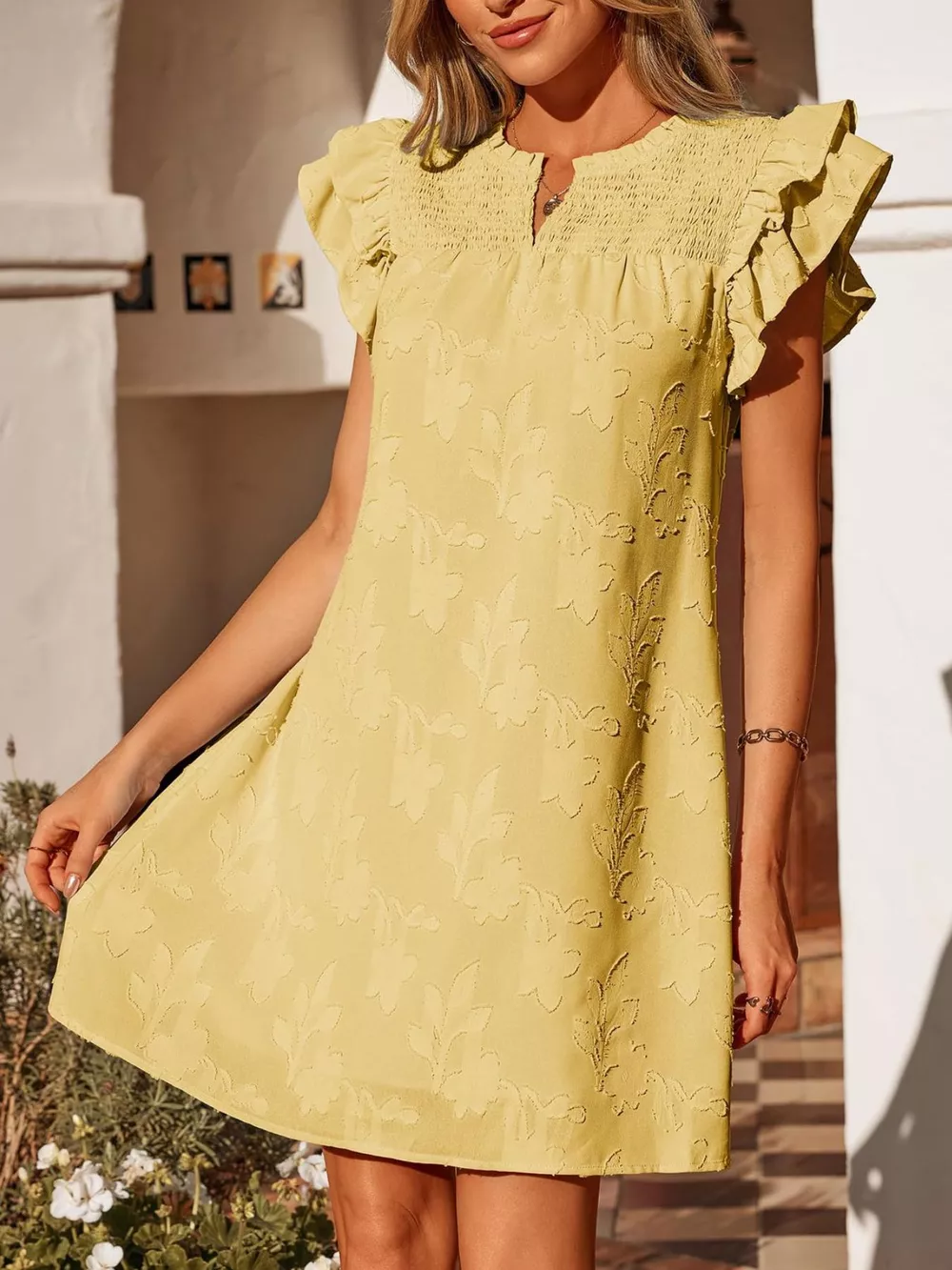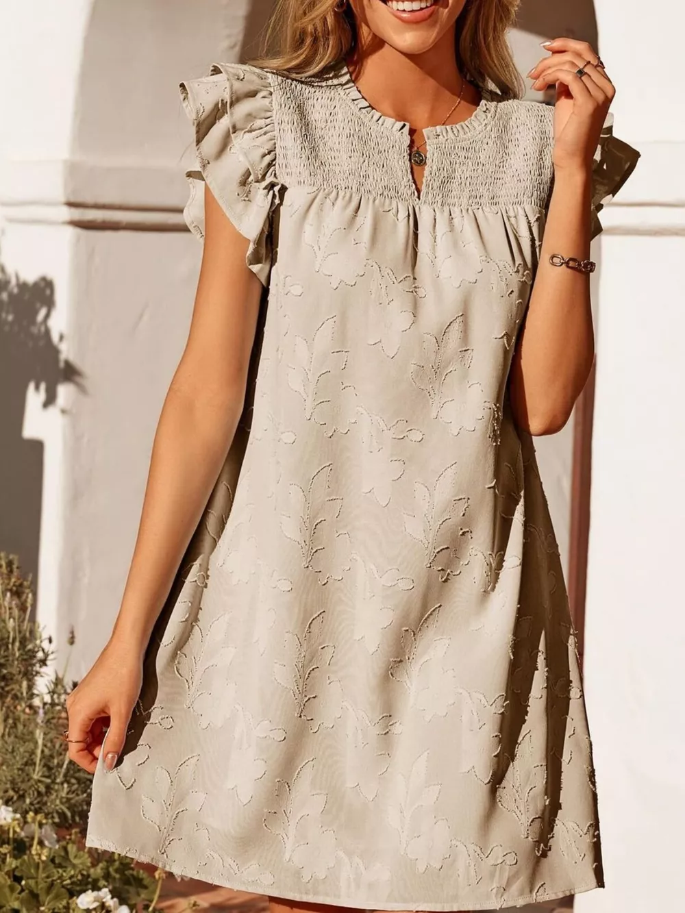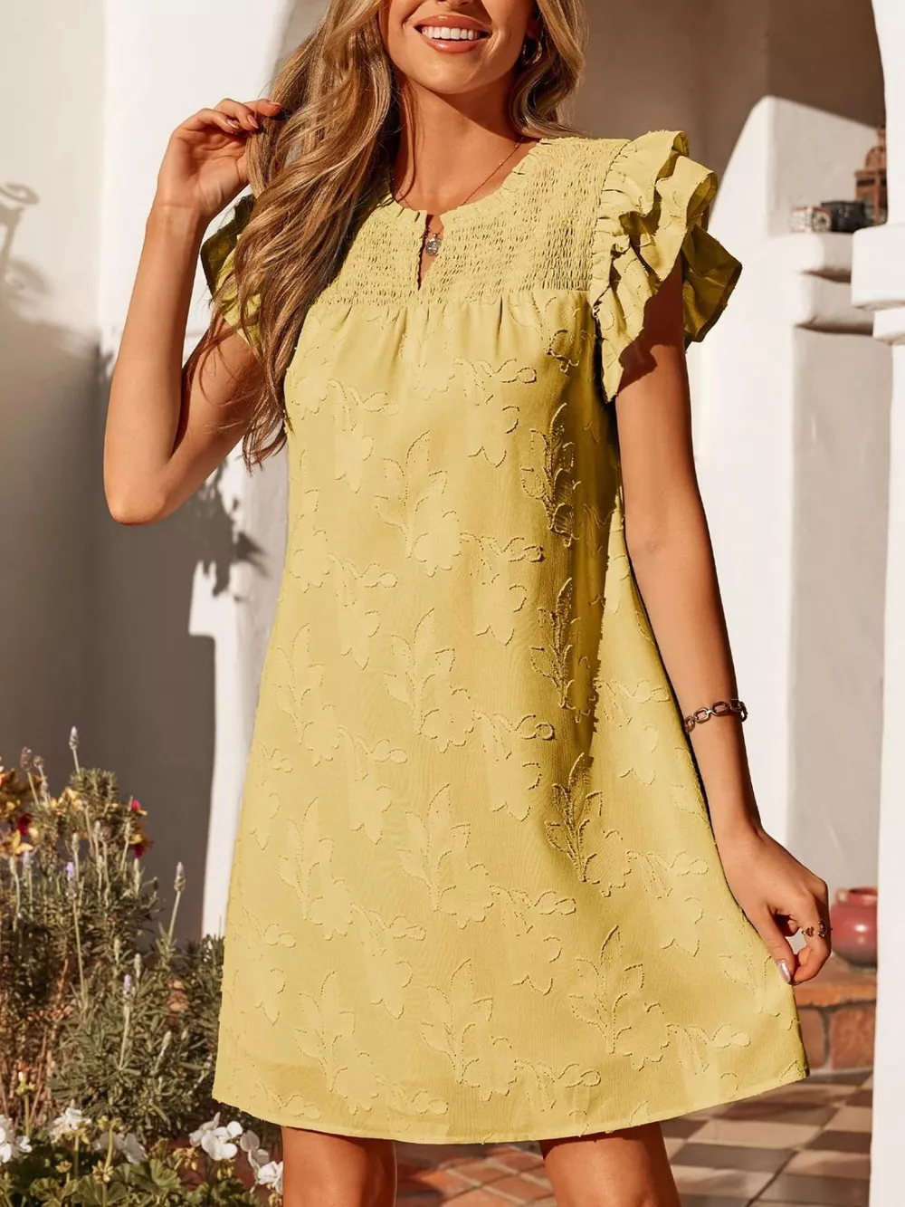 Floral Embossed Ruffle Sleeve Mini Dress