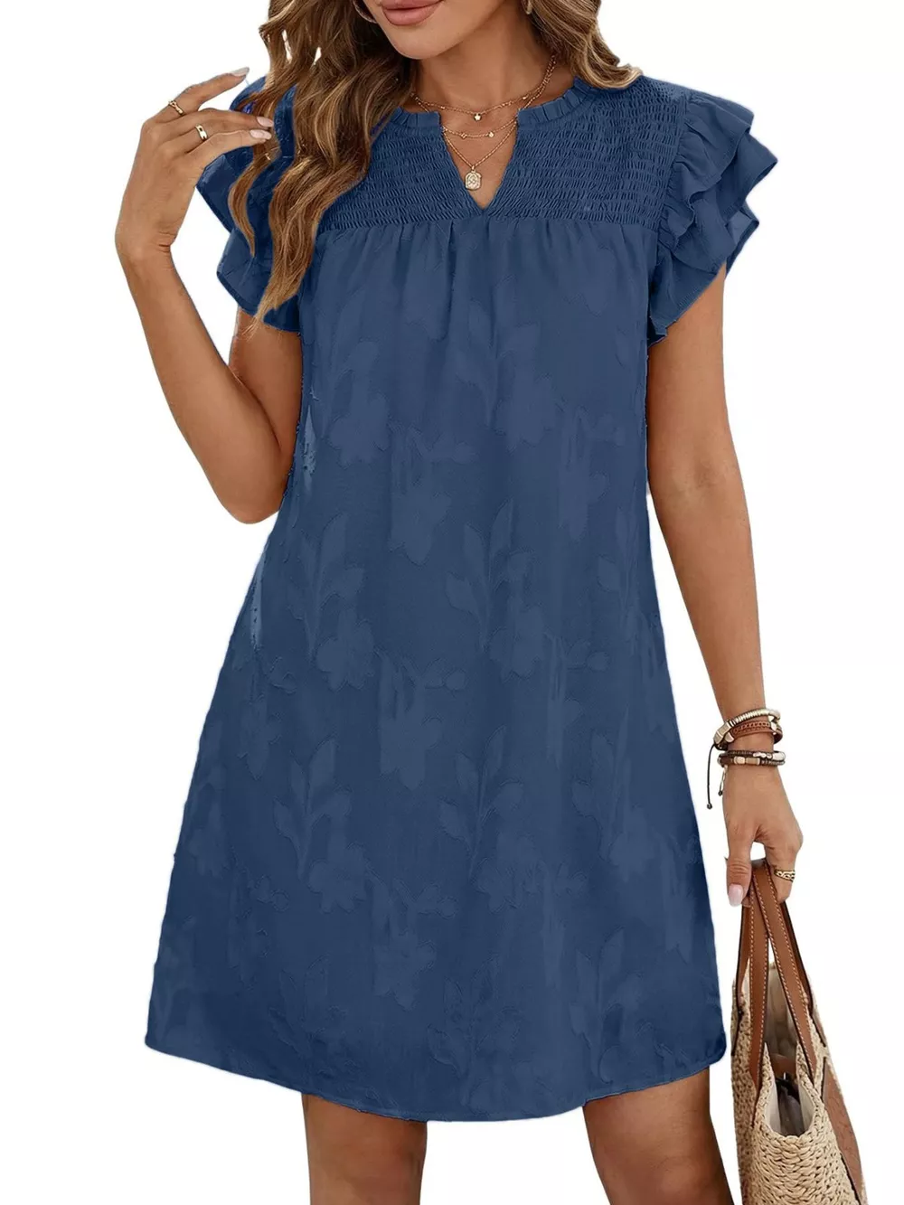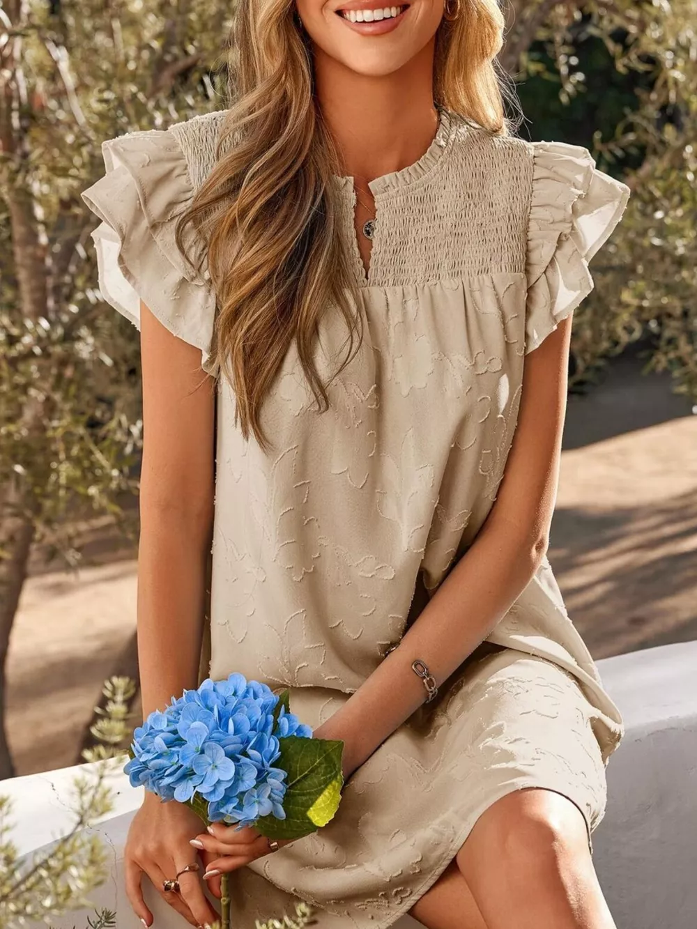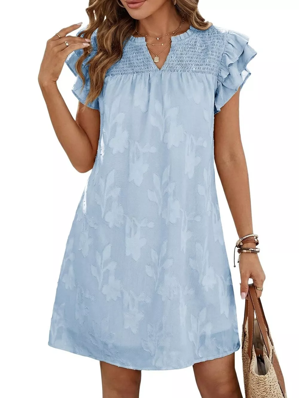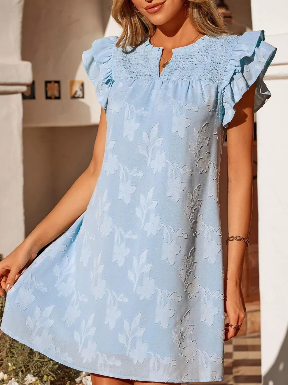 Floral Embossed Ruffle Sleeve Mini Dress