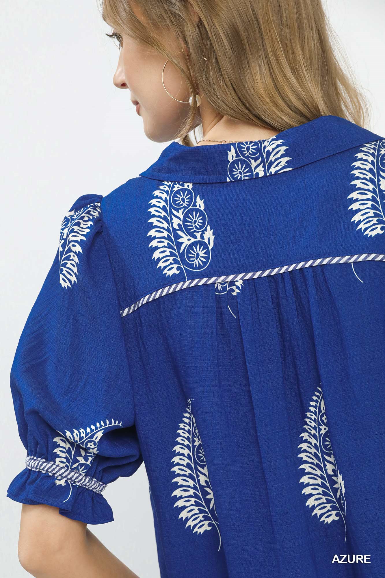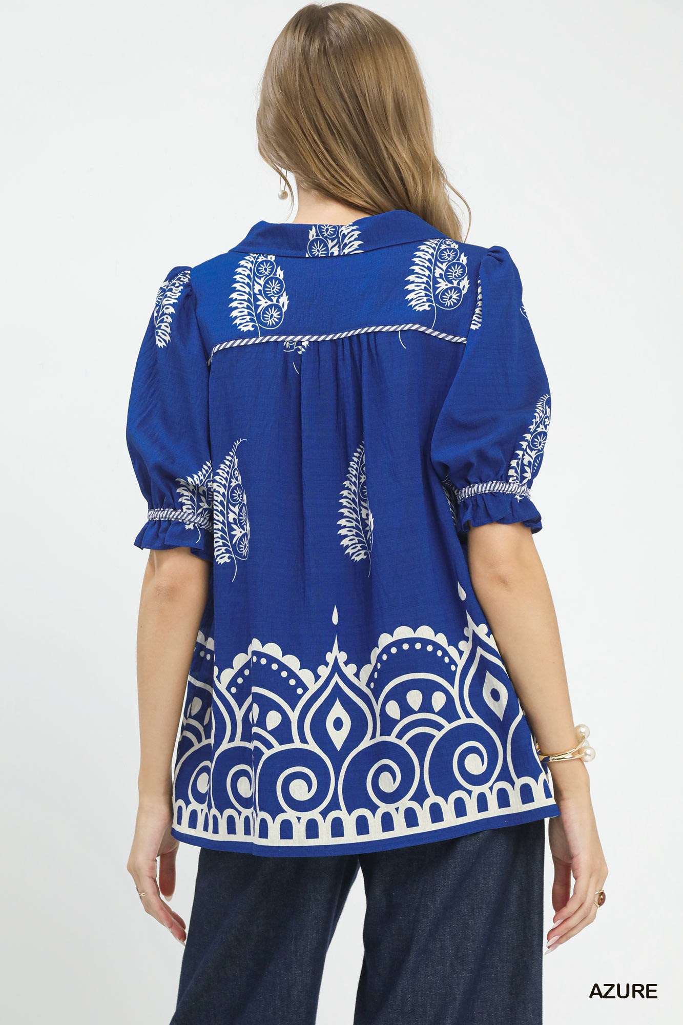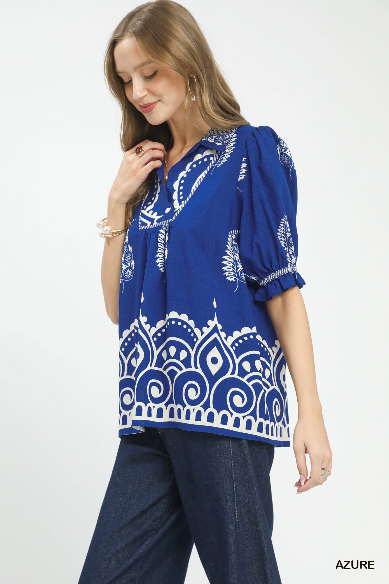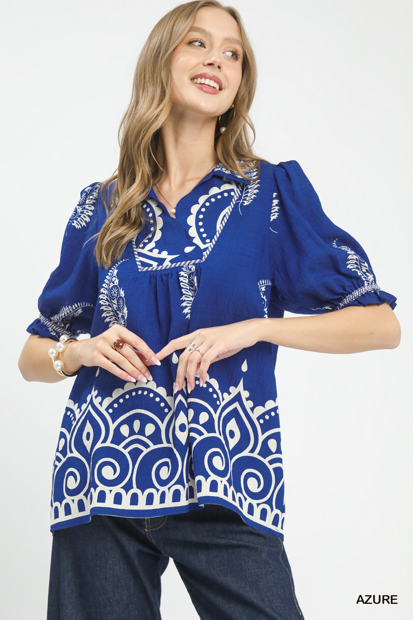 Umgee Printed Puff Sleeve Split Neck Top