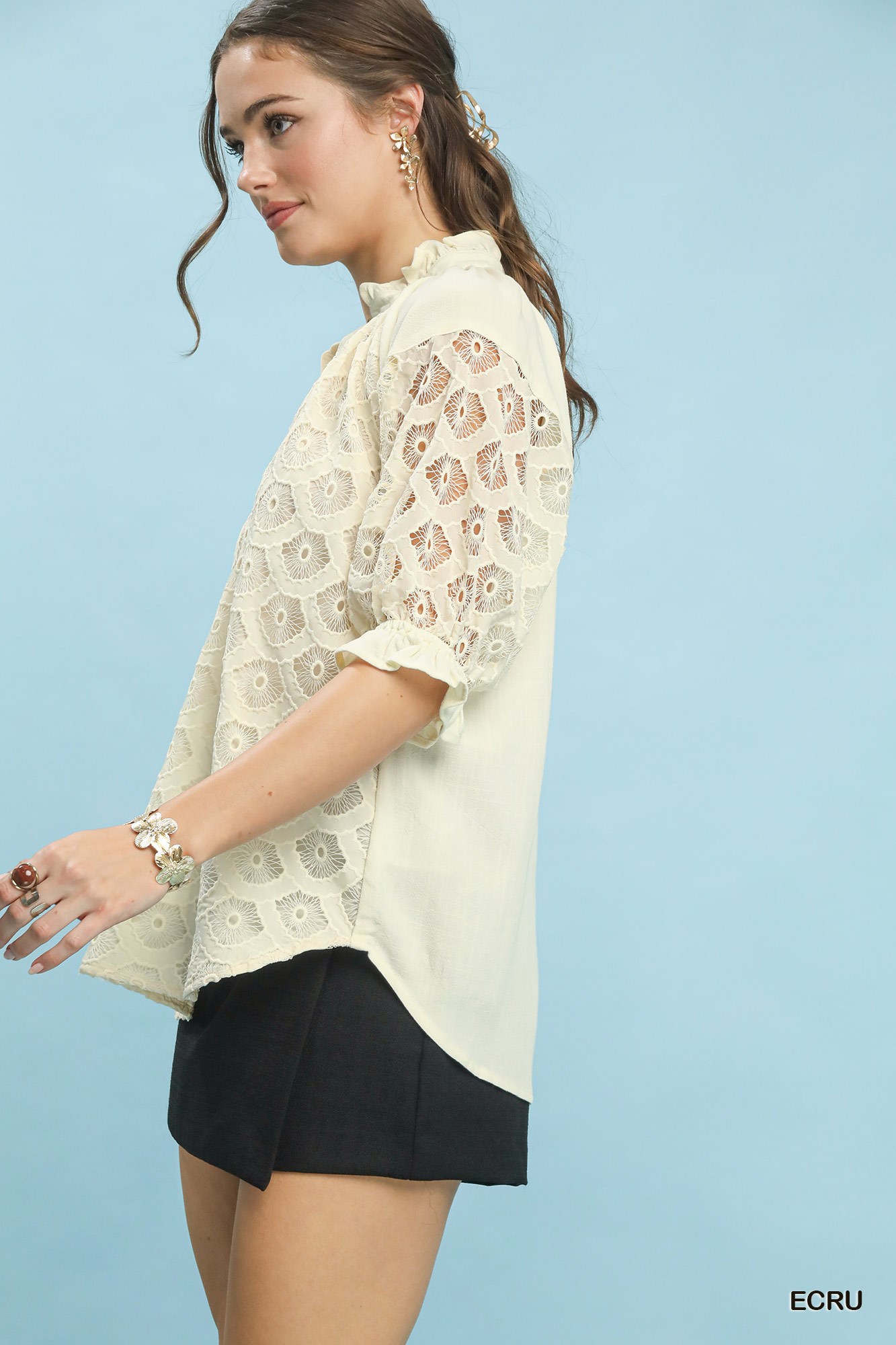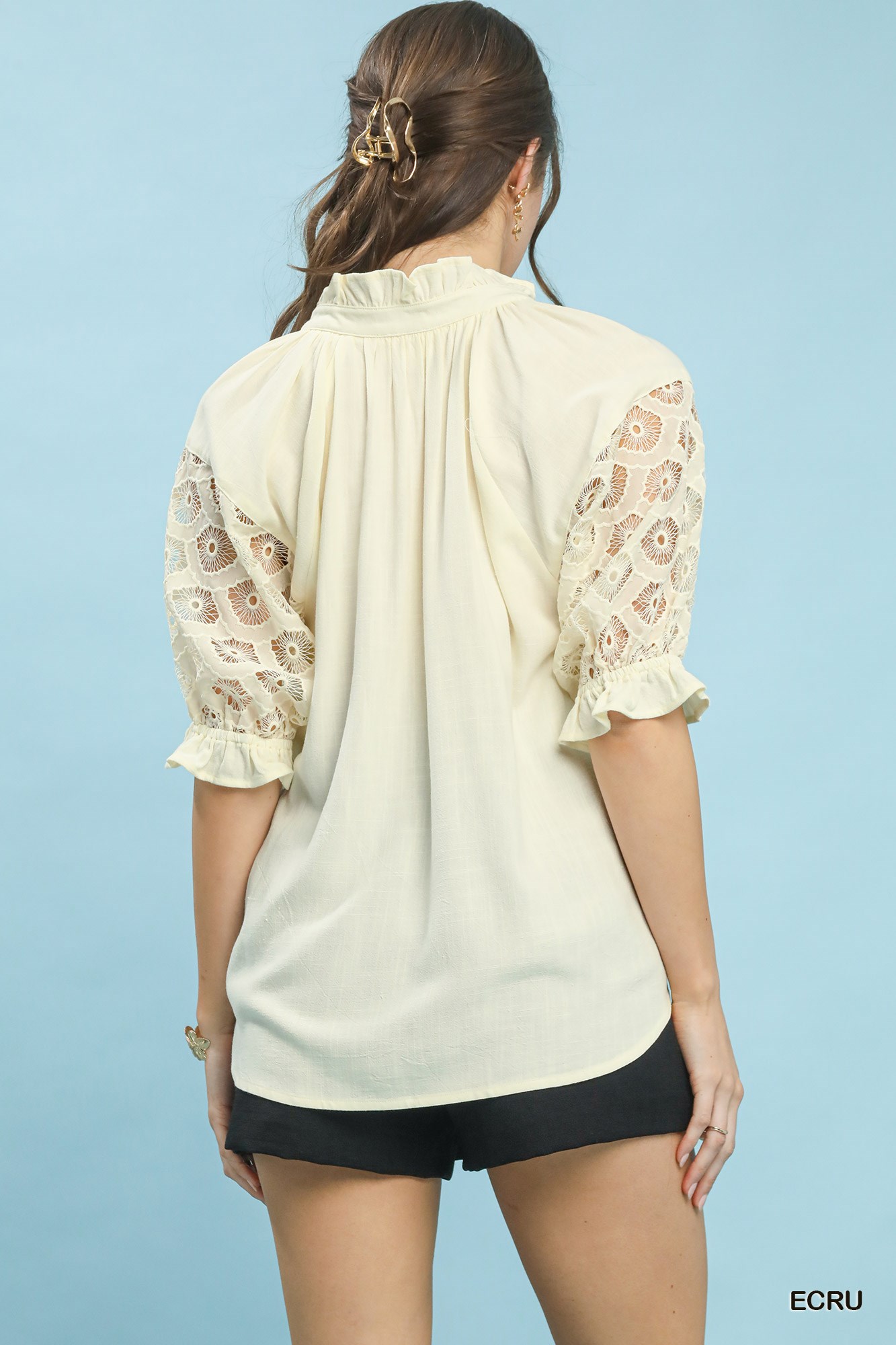 Umgee Linen V-Neck Lace Puff Sleeve Top