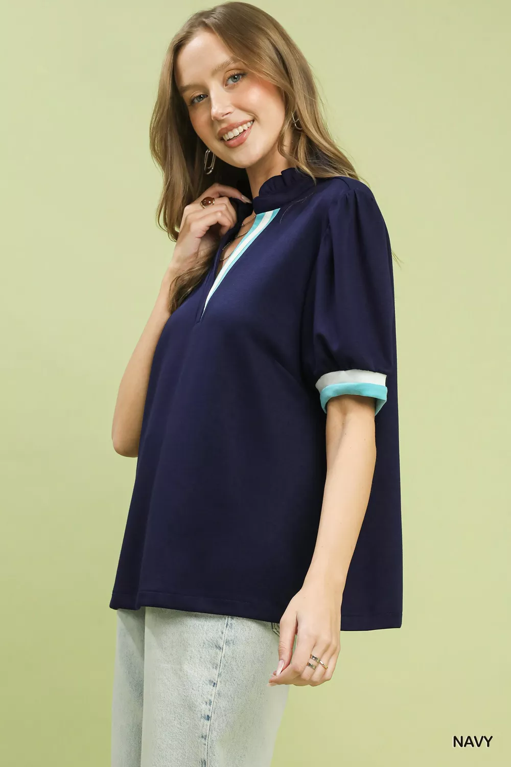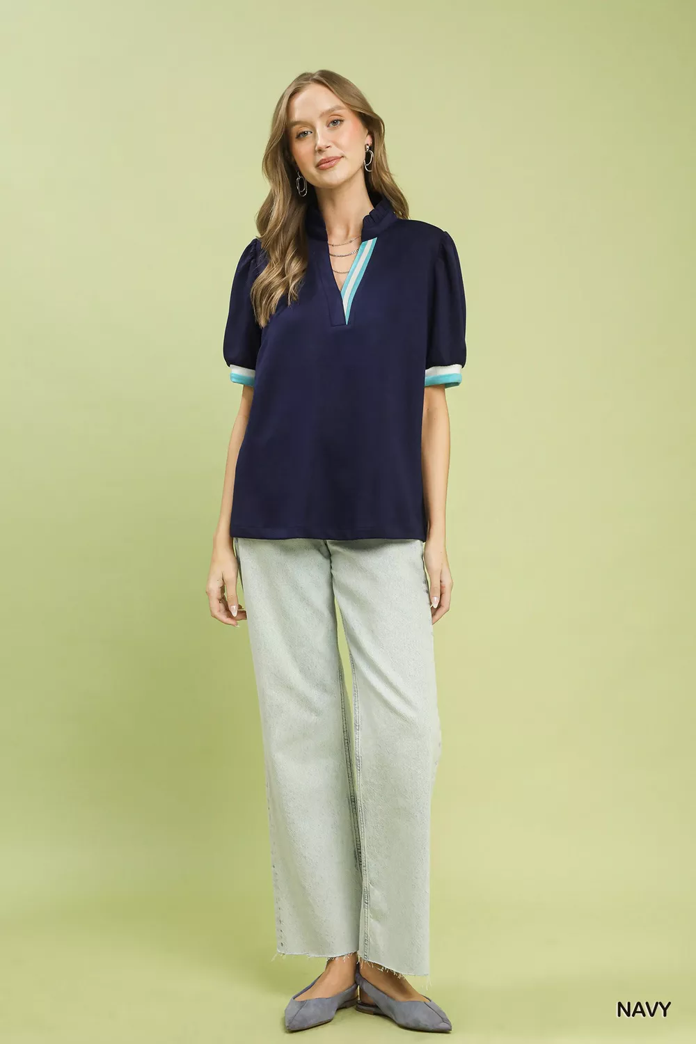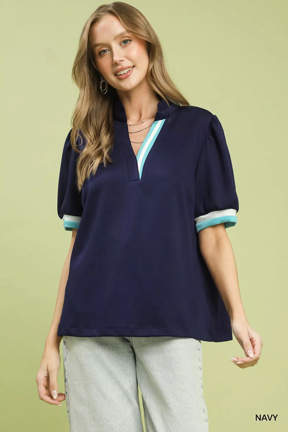 Umgee Luxe knit Contrast Trim Puff Sleeve Top