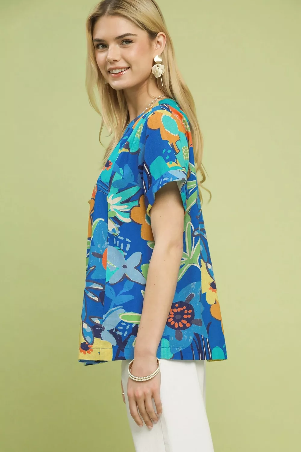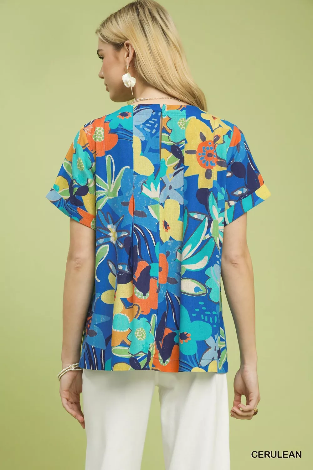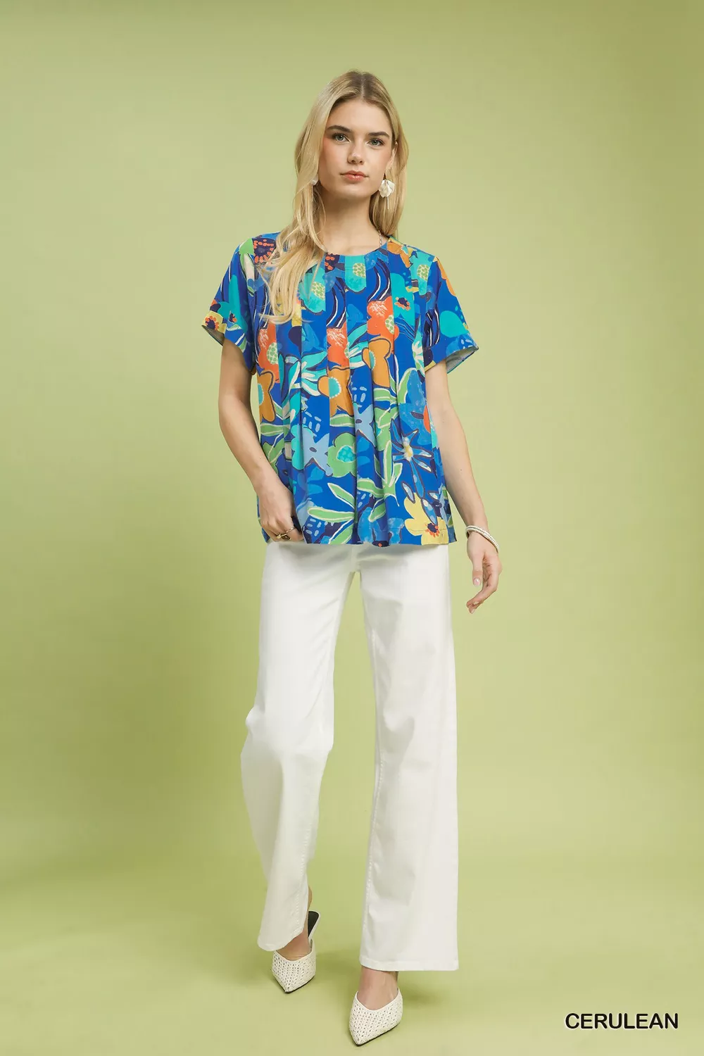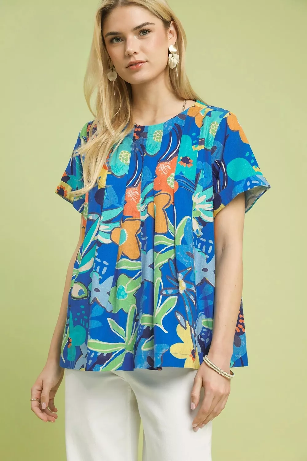 This blouse showcases a dreamy abstract floral print that blends artistic flair with soft femininity. Designed with a gentle rounded neckline and short sleeves for a relaxed, everyday-friendly silhouette, it features elegant pleating throughout to create beautiful movement and subtle dimension. Finished with a delicate back keyhole button closure for easy wear, this unlined style is lightweight and breathable, perfect for warm days and layering. Effortlessly stylish and versatile, it pairs easily with pants, skirts, and shorts for casual outings, office wear, or weekend gatherings.