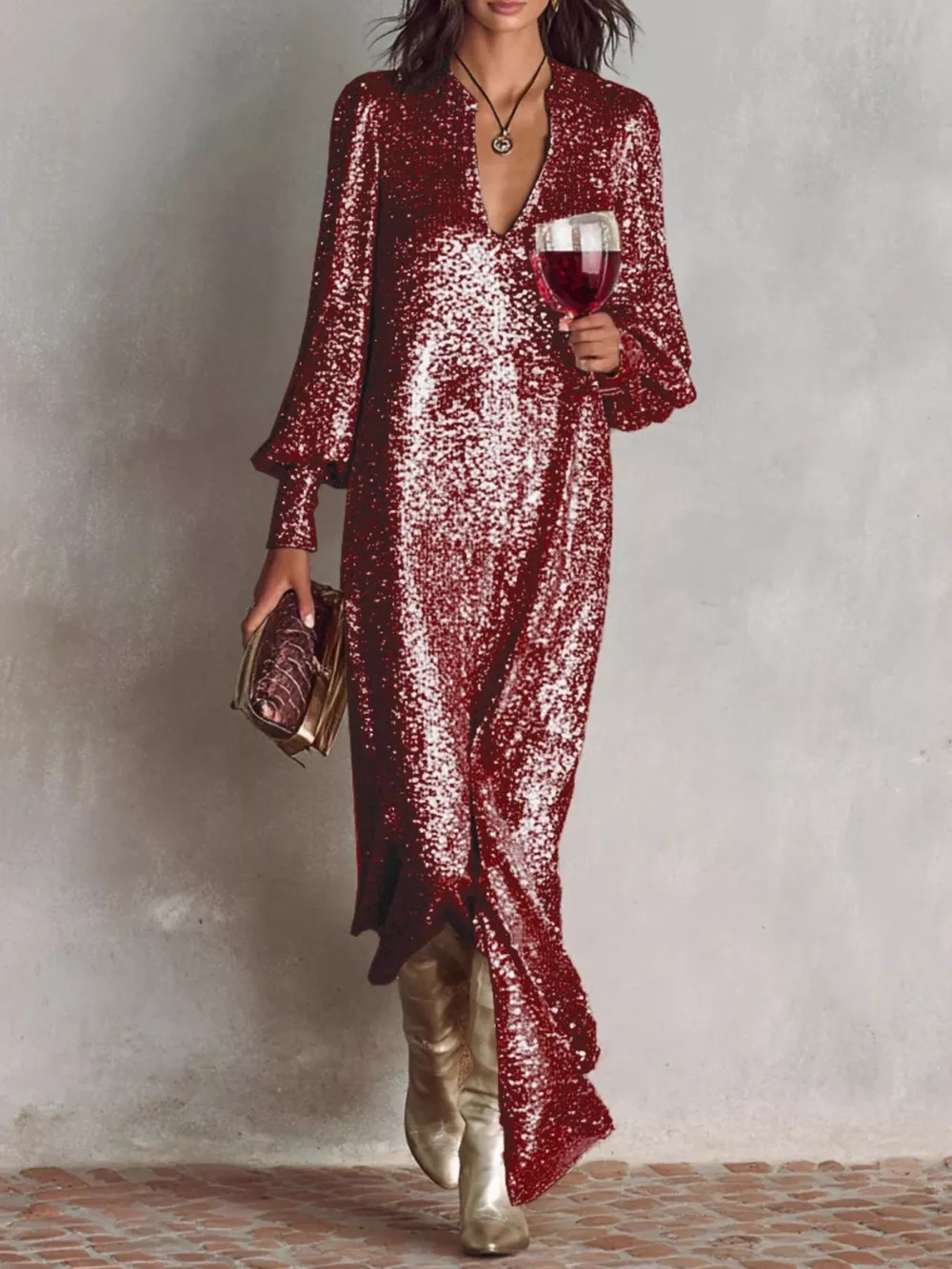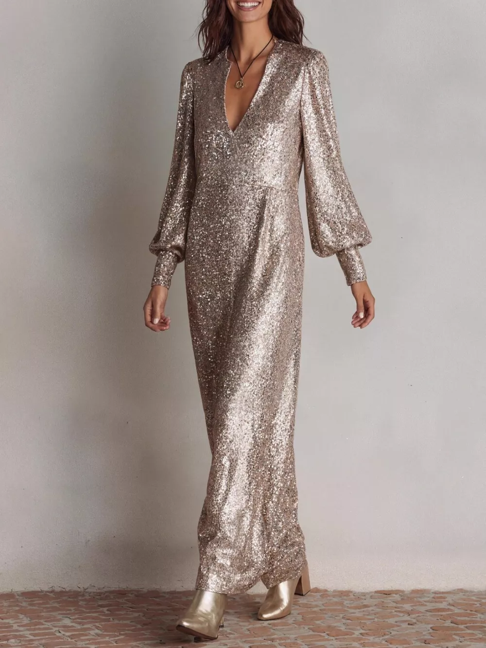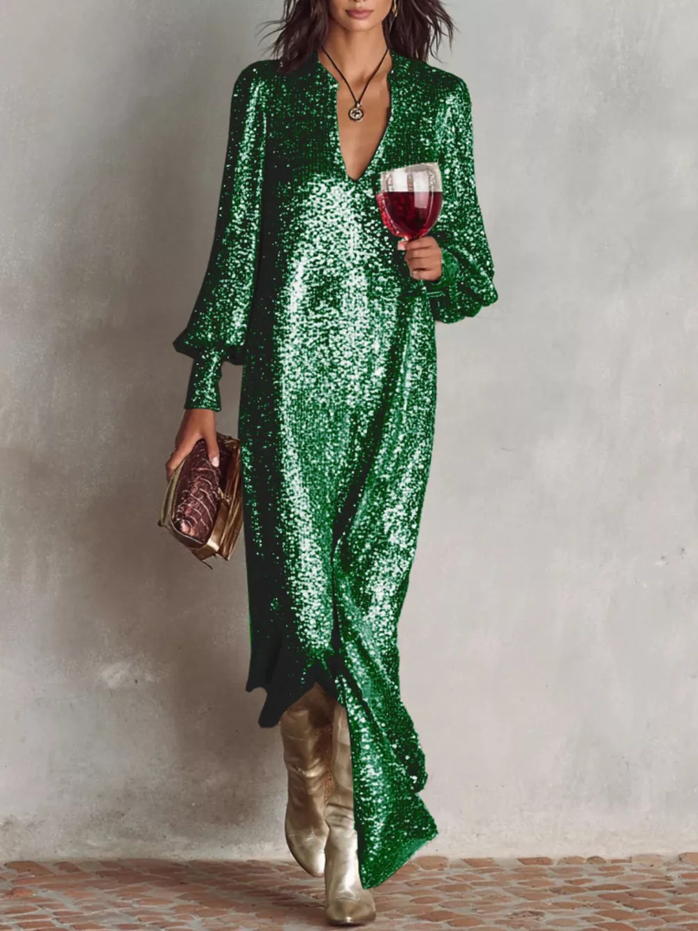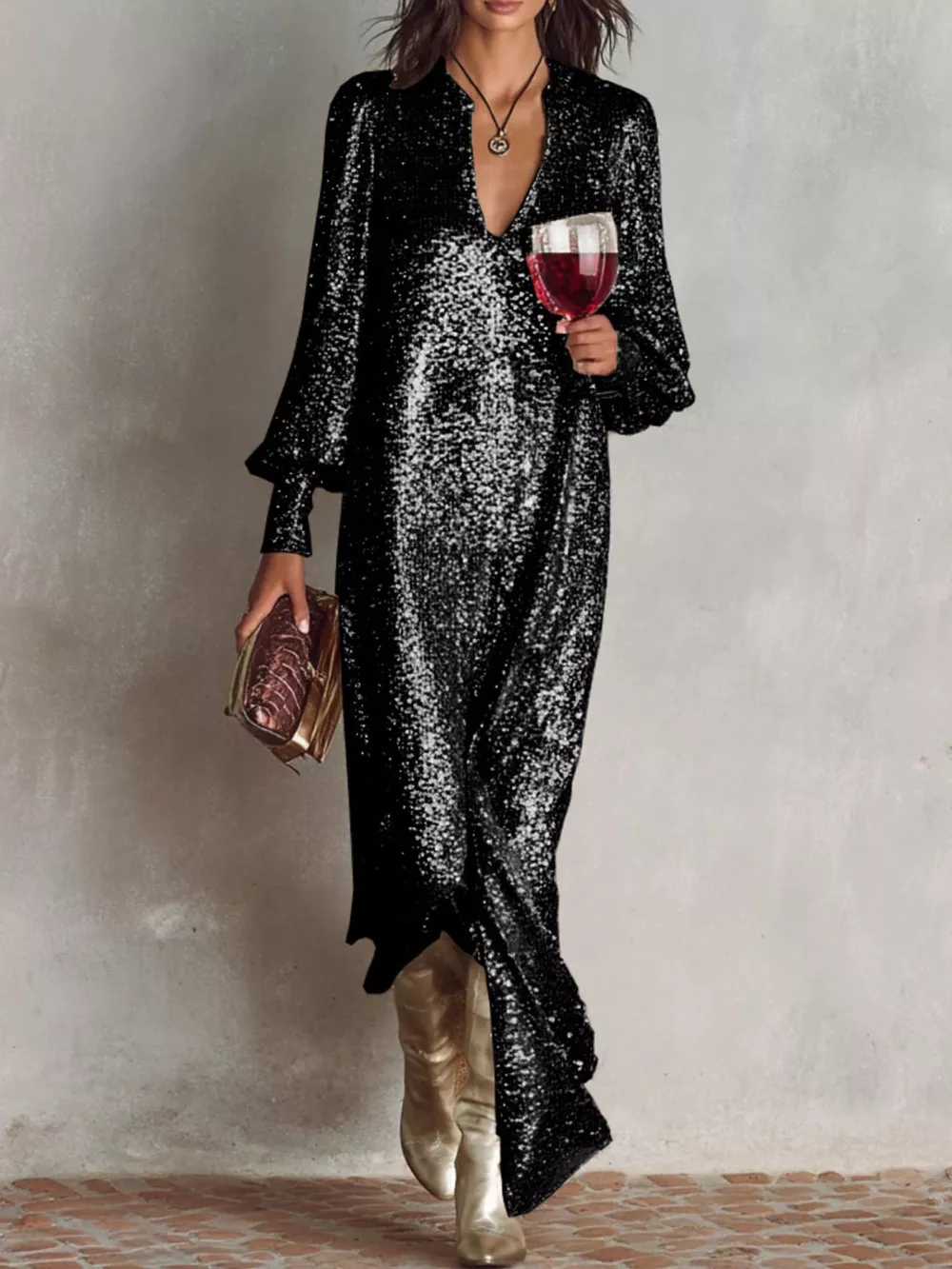 Sequin Notched Lantern Sleeve Maxi Dress