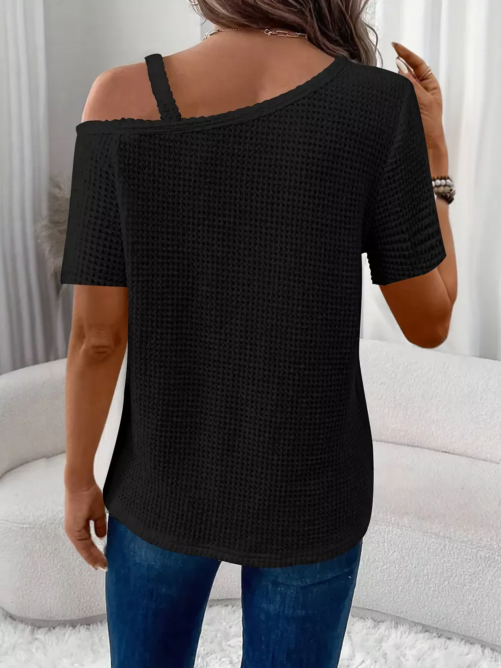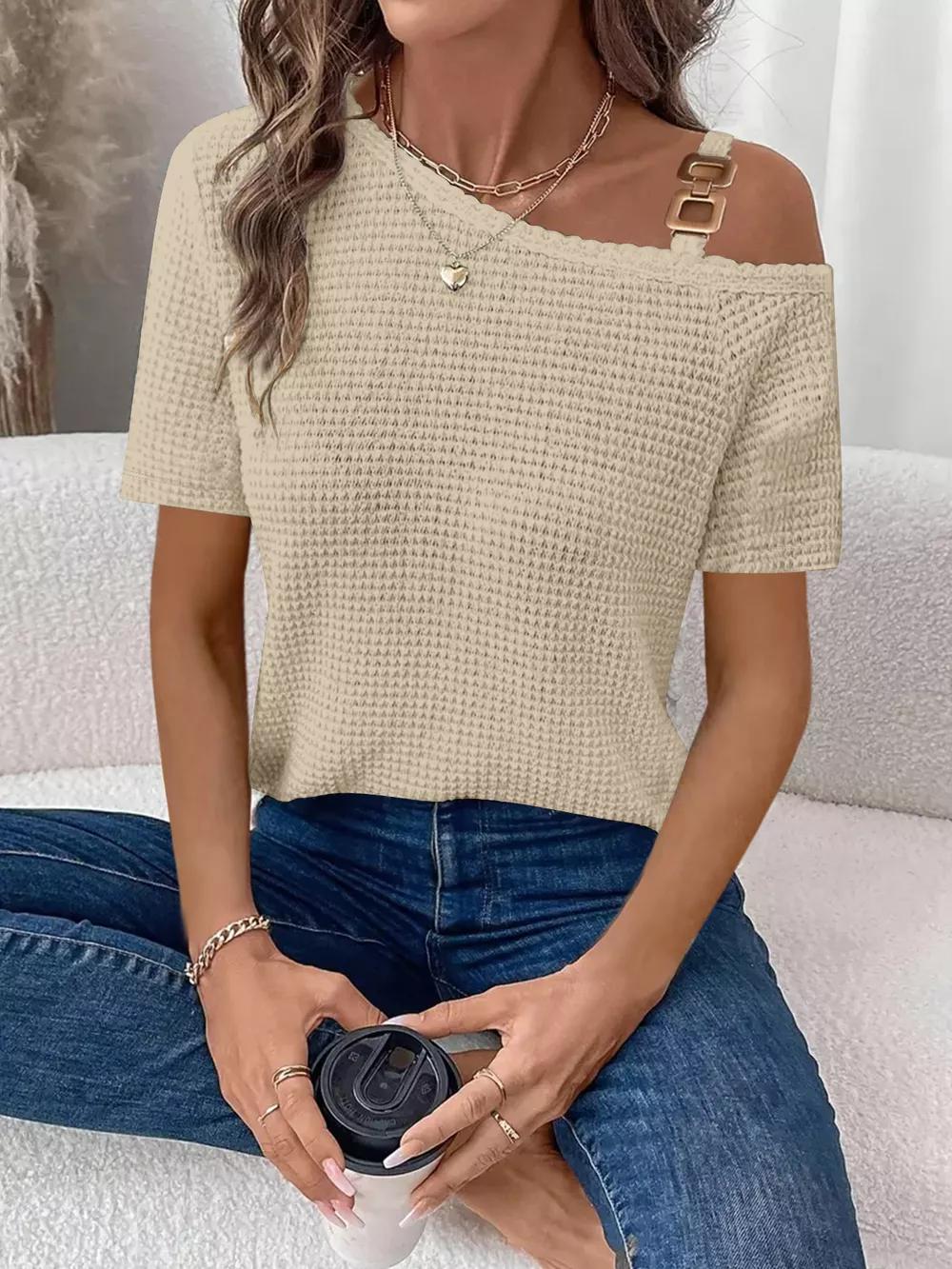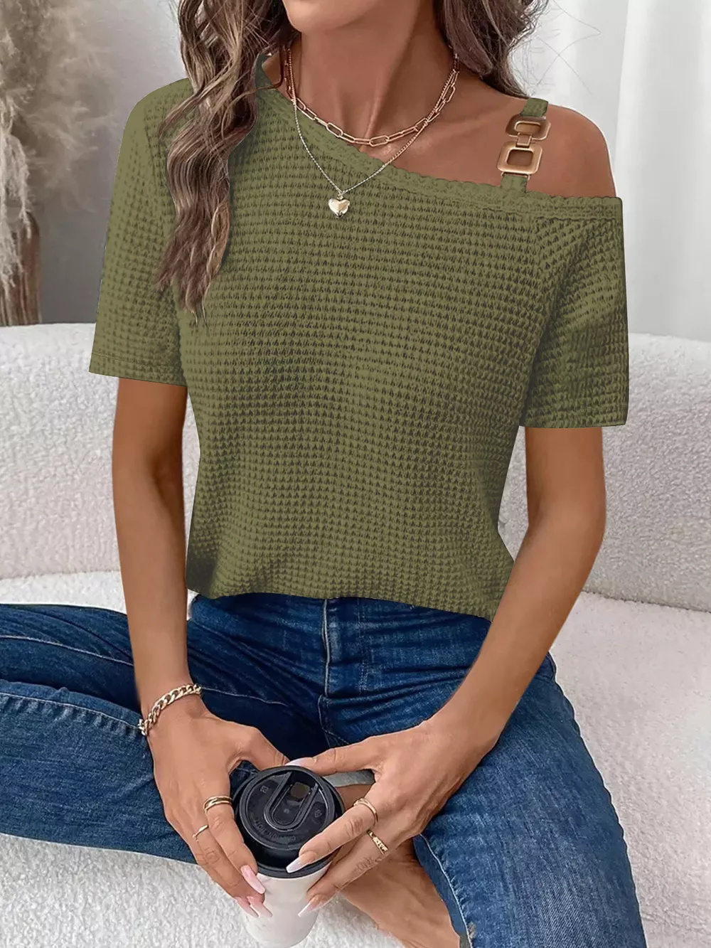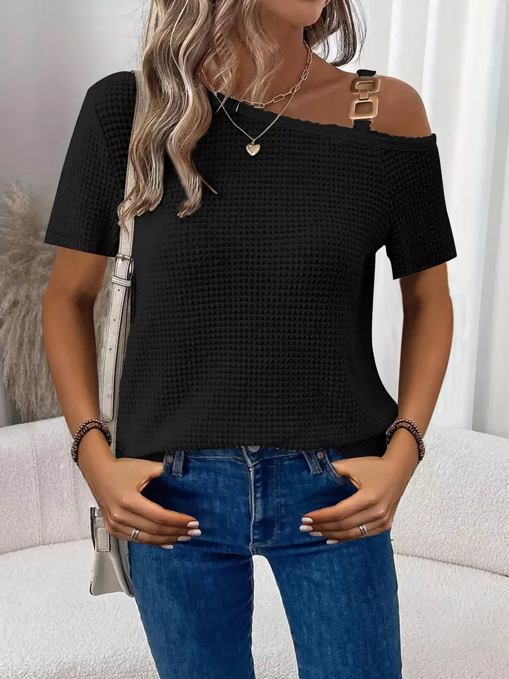 One-Shoulder Chain Detail Waffle Knit T-Shirt