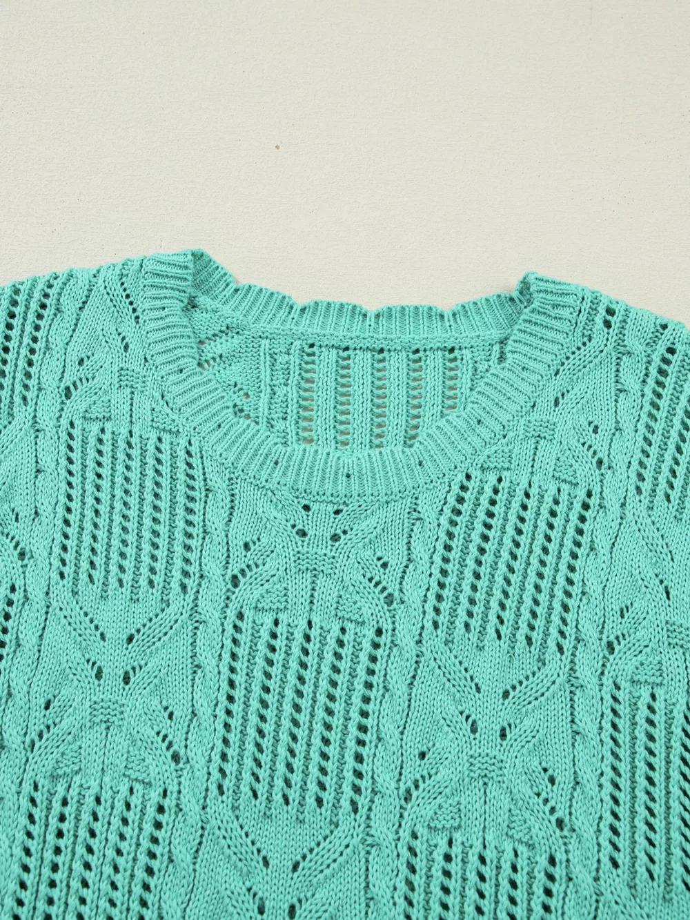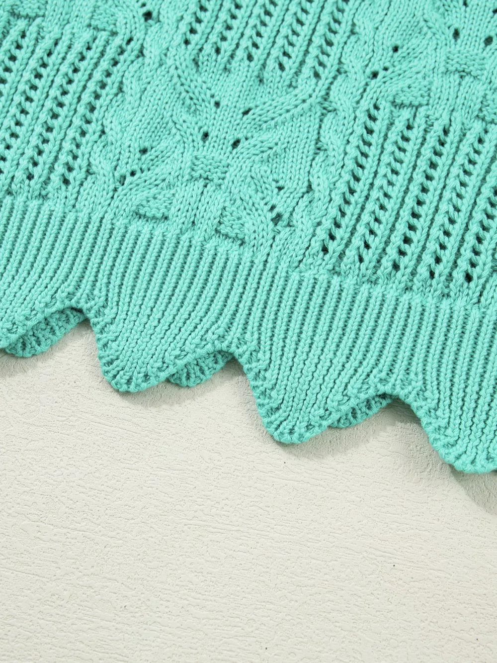 Pointelle Knit Patterned Scalloped Trim Short Sleeve Sweater