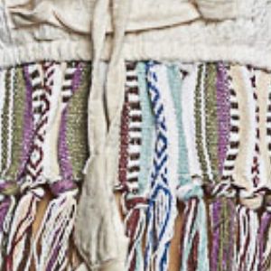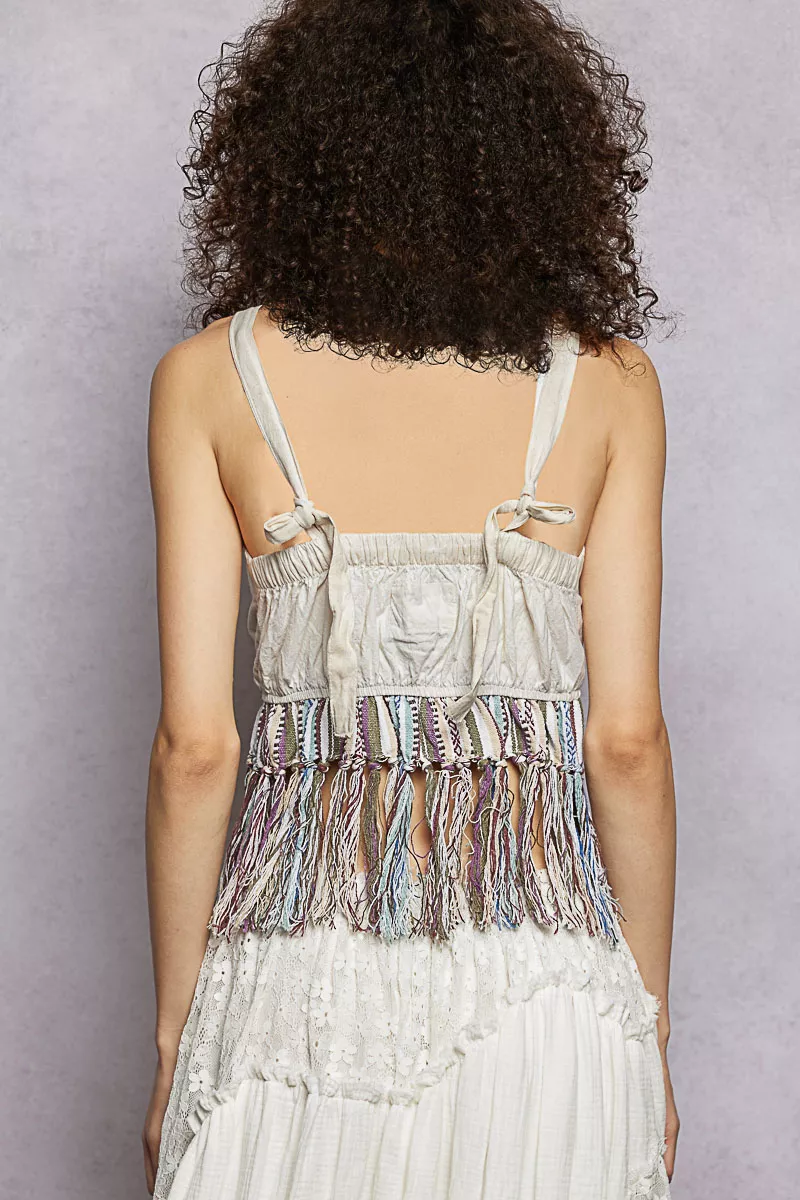 A delicate bra-top–style piece featuring handmade playful fringe at the hem, accented with lace and trim details. Finished with a front tie closure for an adjustable fit, this piece offers a charming, feminine look with a soft, natural feel.