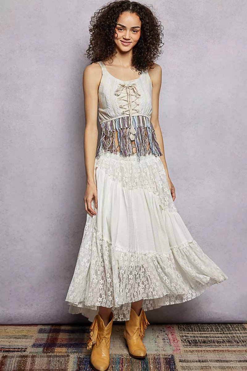 POL Lace-Up Fringe Hem Tank with Lace Detail