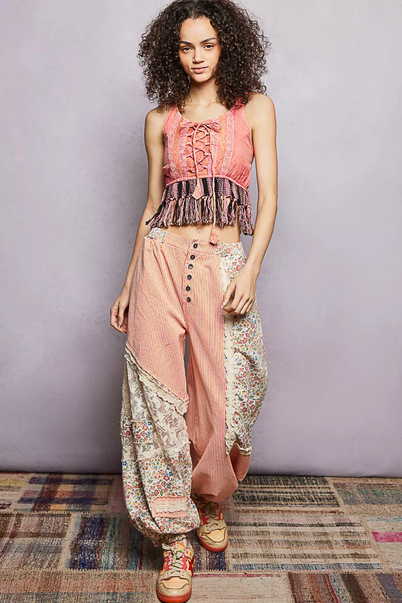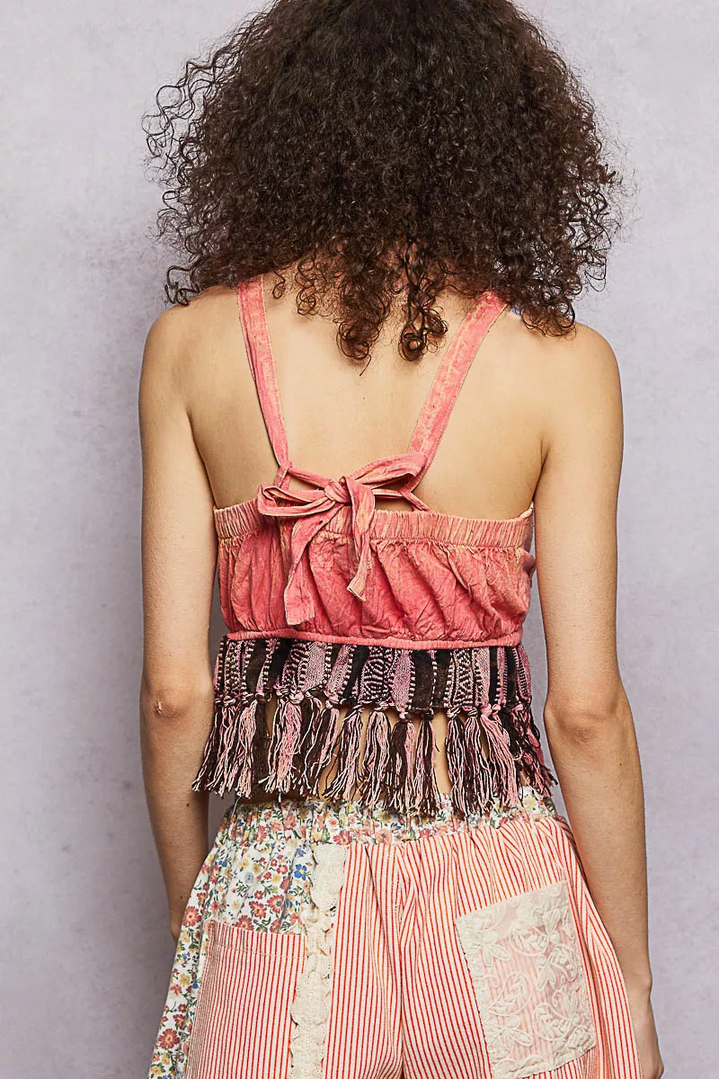 POL Lace-Up Fringe Hem Tank with Lace Detail