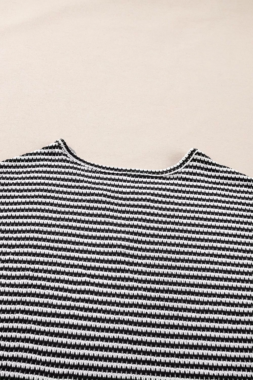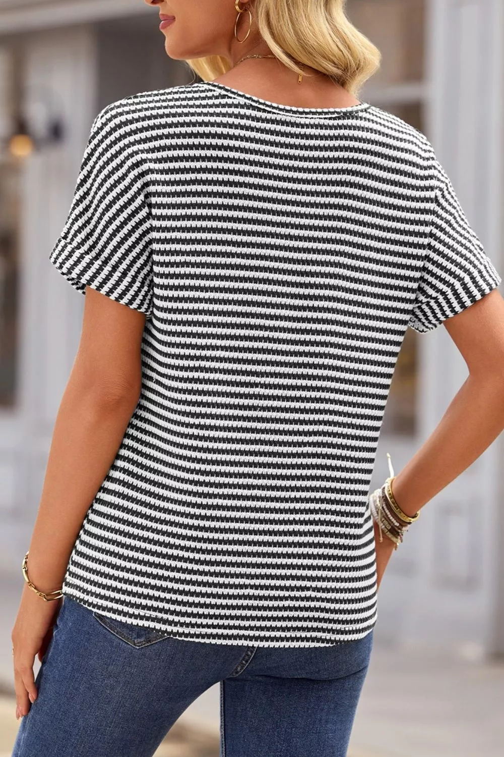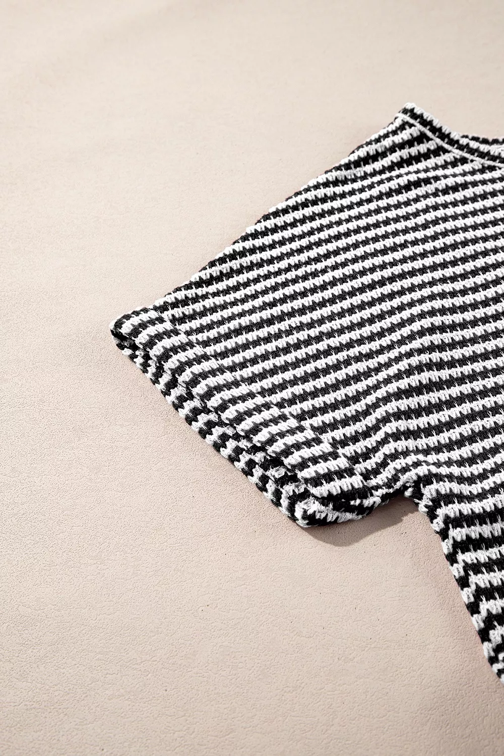 Stripe Textured Knit Notched Neck Cuffed Short Sleeve Top