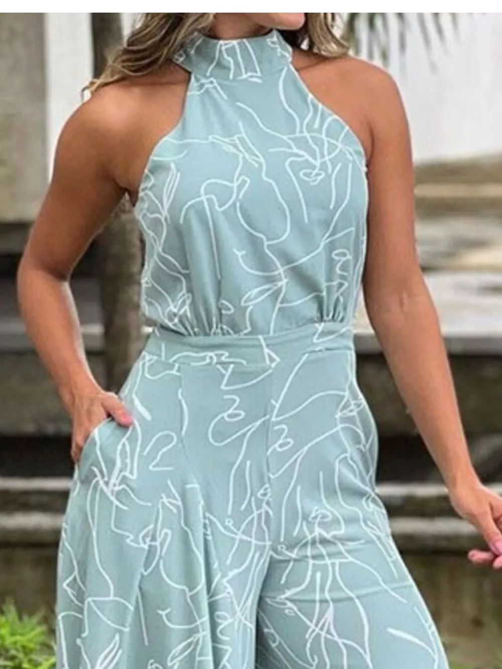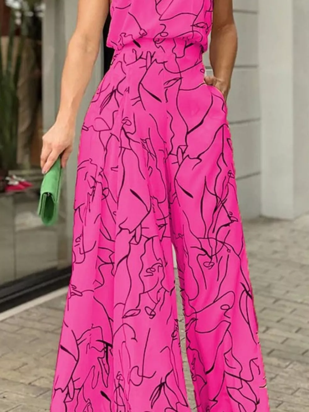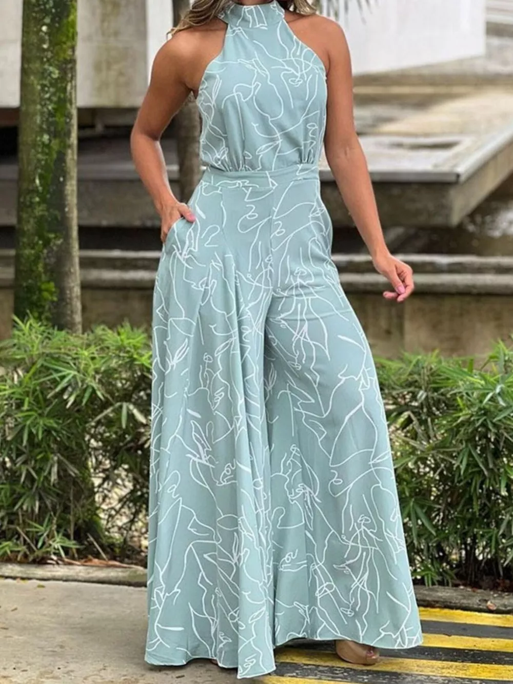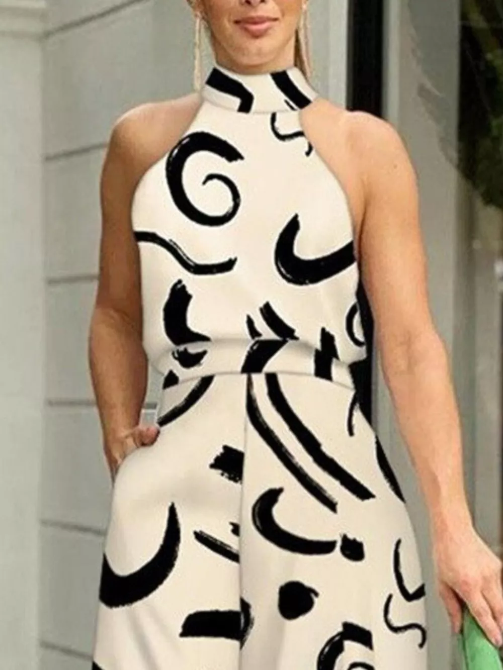 Halter Neck Abstract Print Wide Leg Jumpsuit