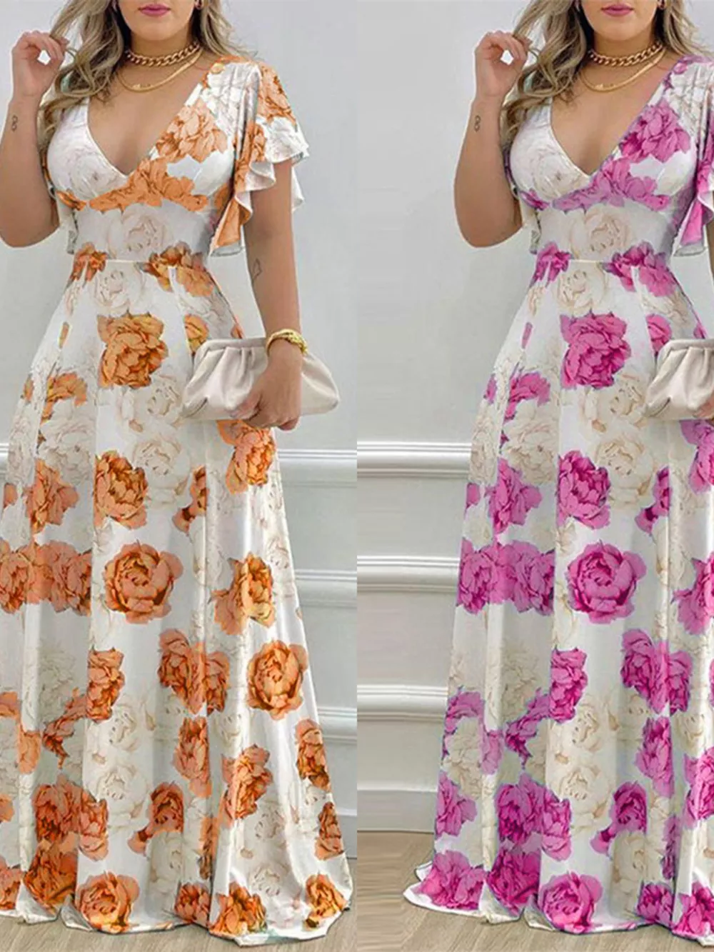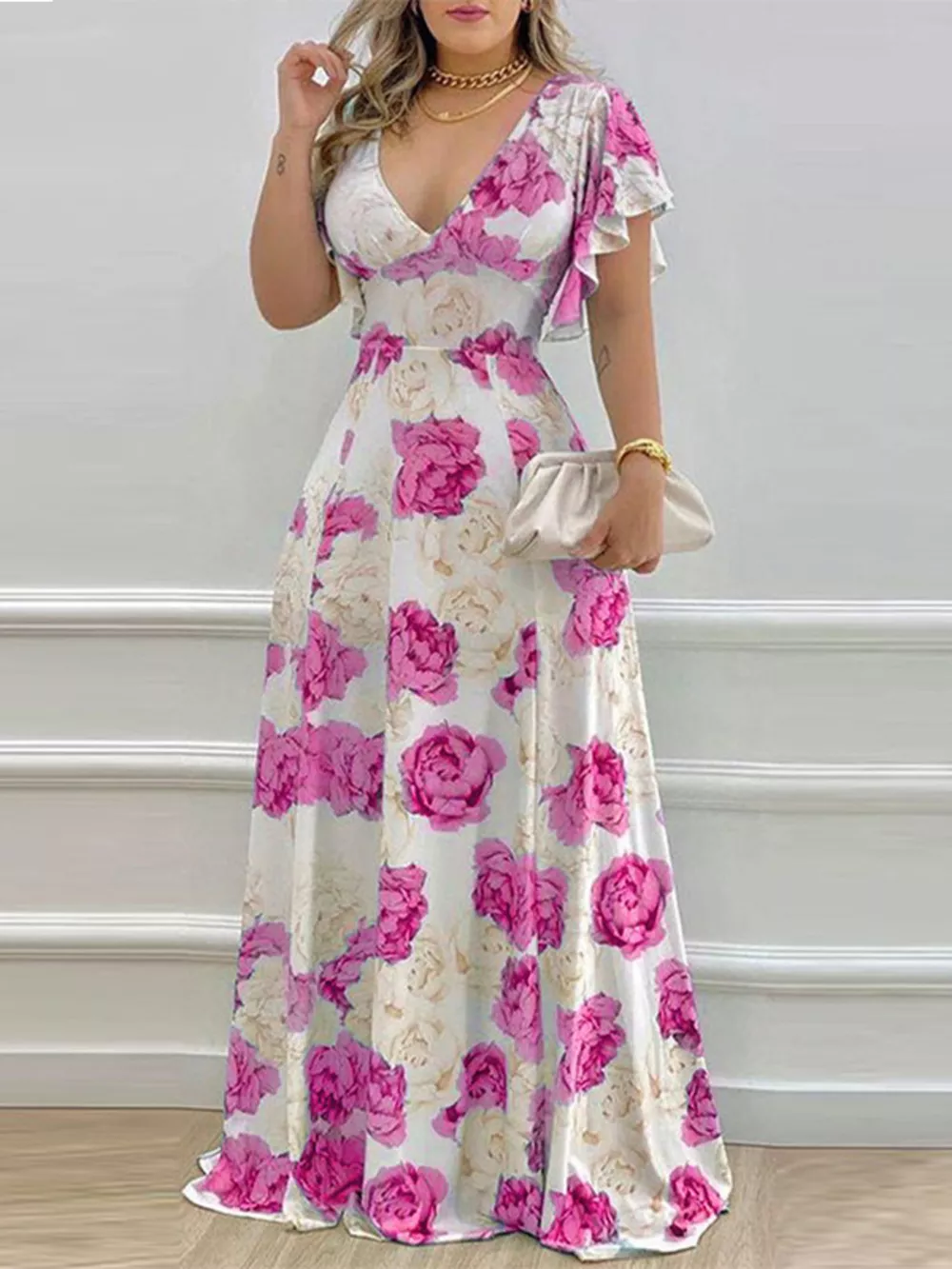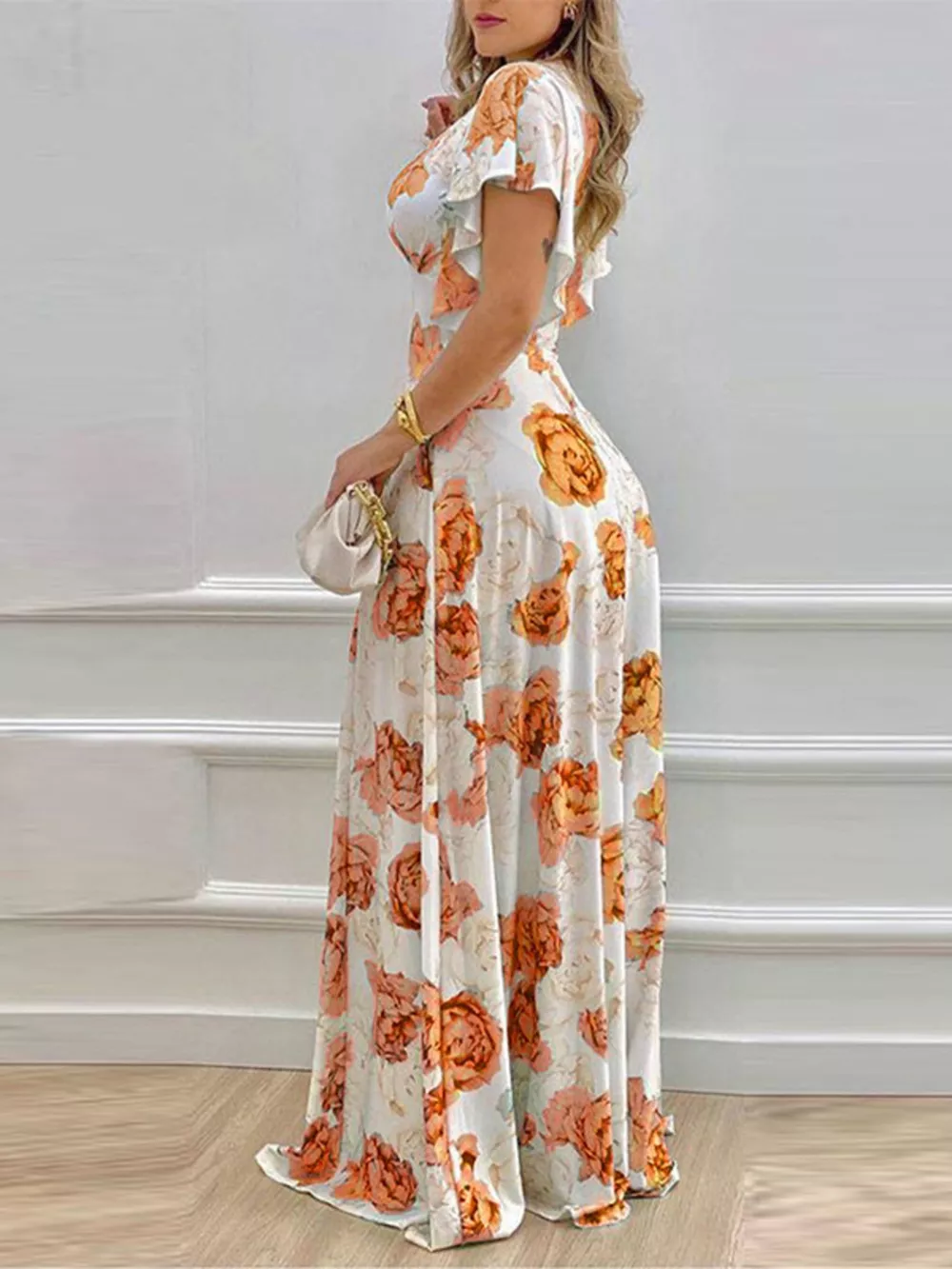 Floral Print V-Neck Ruffle Sleeve Maxi Dress