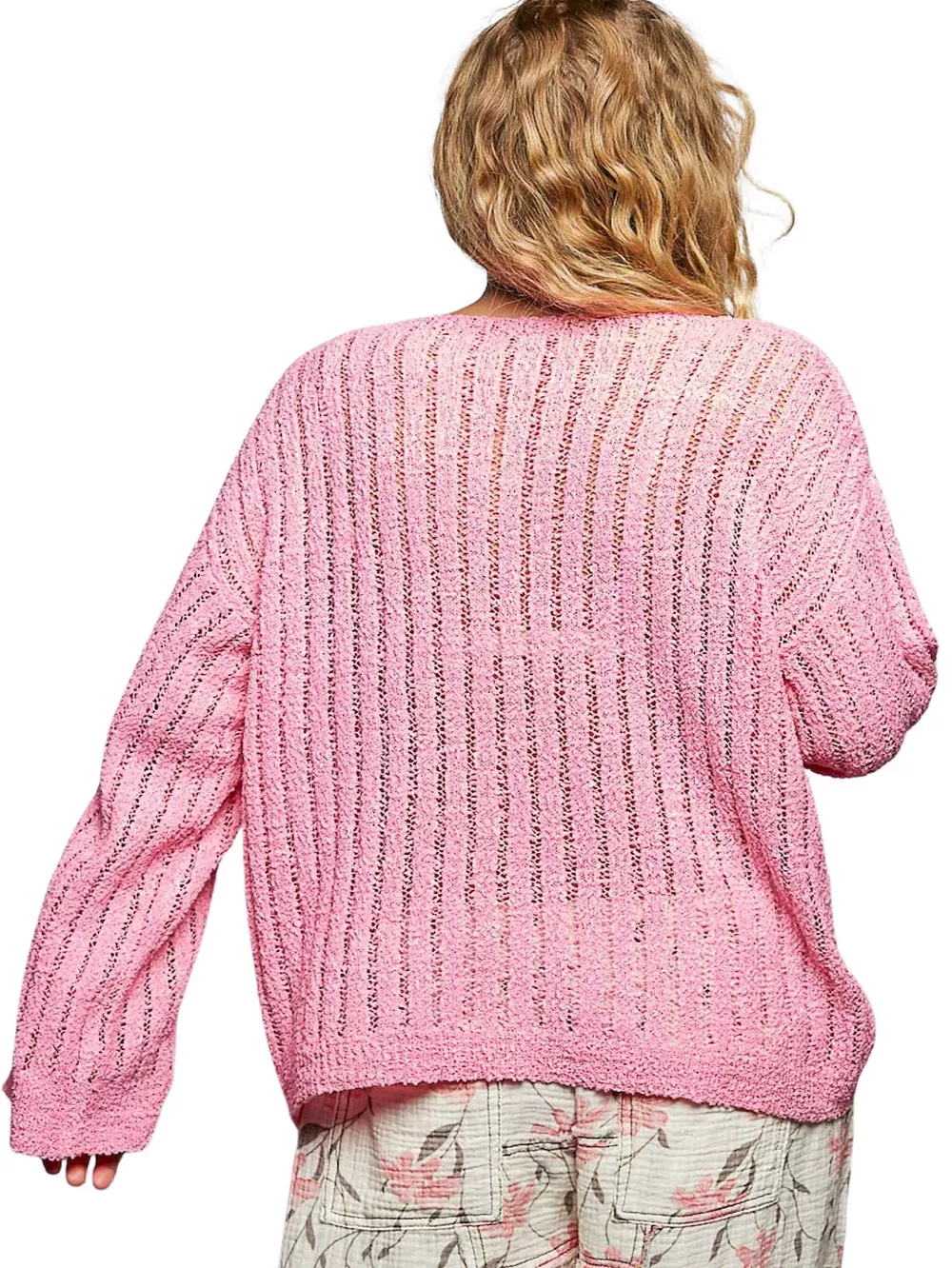Designed in round neck long sleeve relaxed fit open weave sweater top in acrylic. Features a lightweight open-weave construction that offers breathability while maintaining a cozy feel. The relaxed fit creates an effortless drape, perfect for layering over tanks or bralettes. Finished with a soft acrylic texture that provides comfort and easy care, making it a versatile piece for everyday styling.