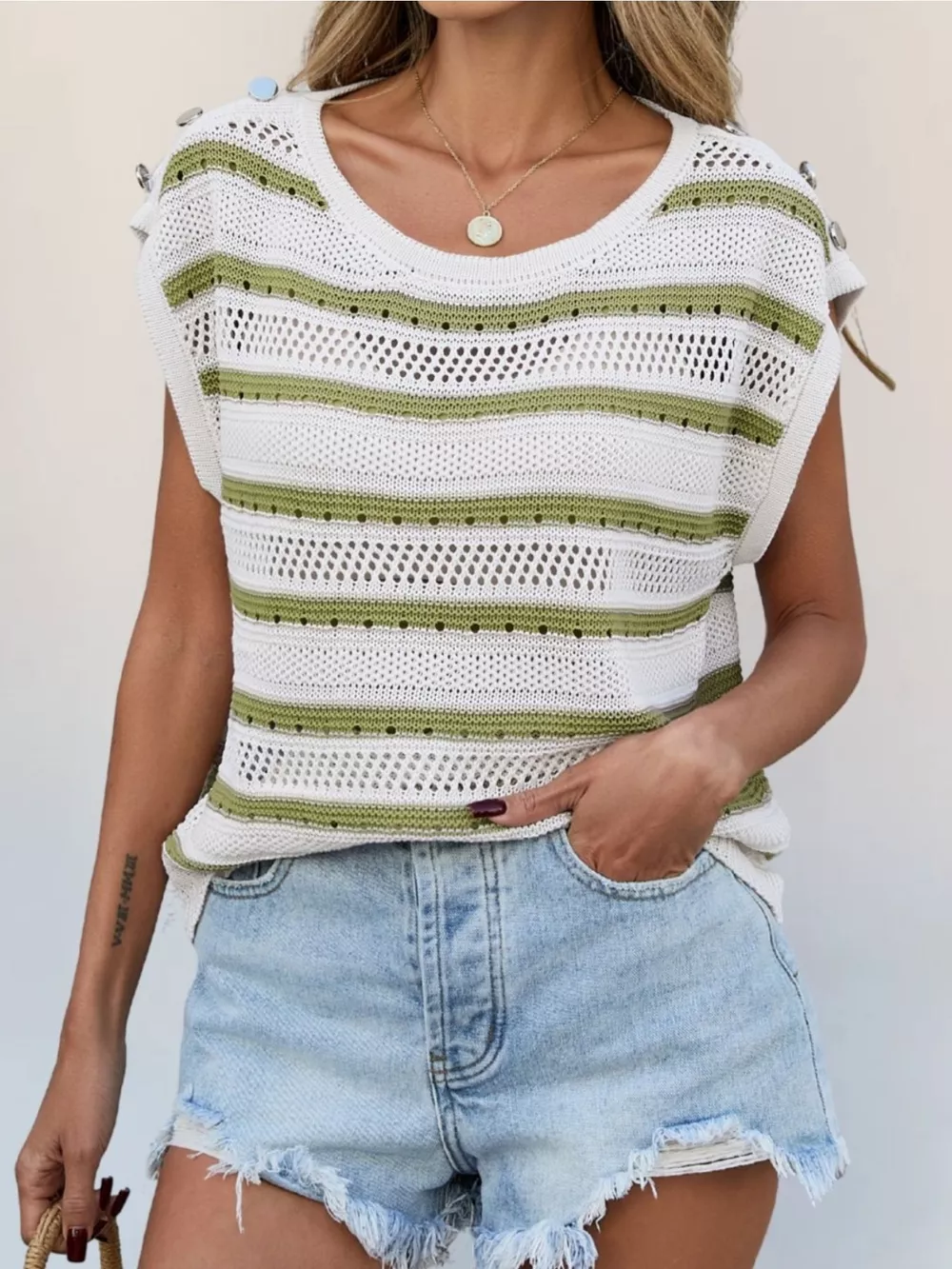 Openwork Round Neck Cap Sleeve Knit Top
