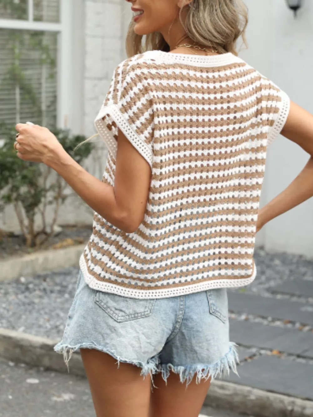 Striped Short Sleeve Crochet Knit Top
