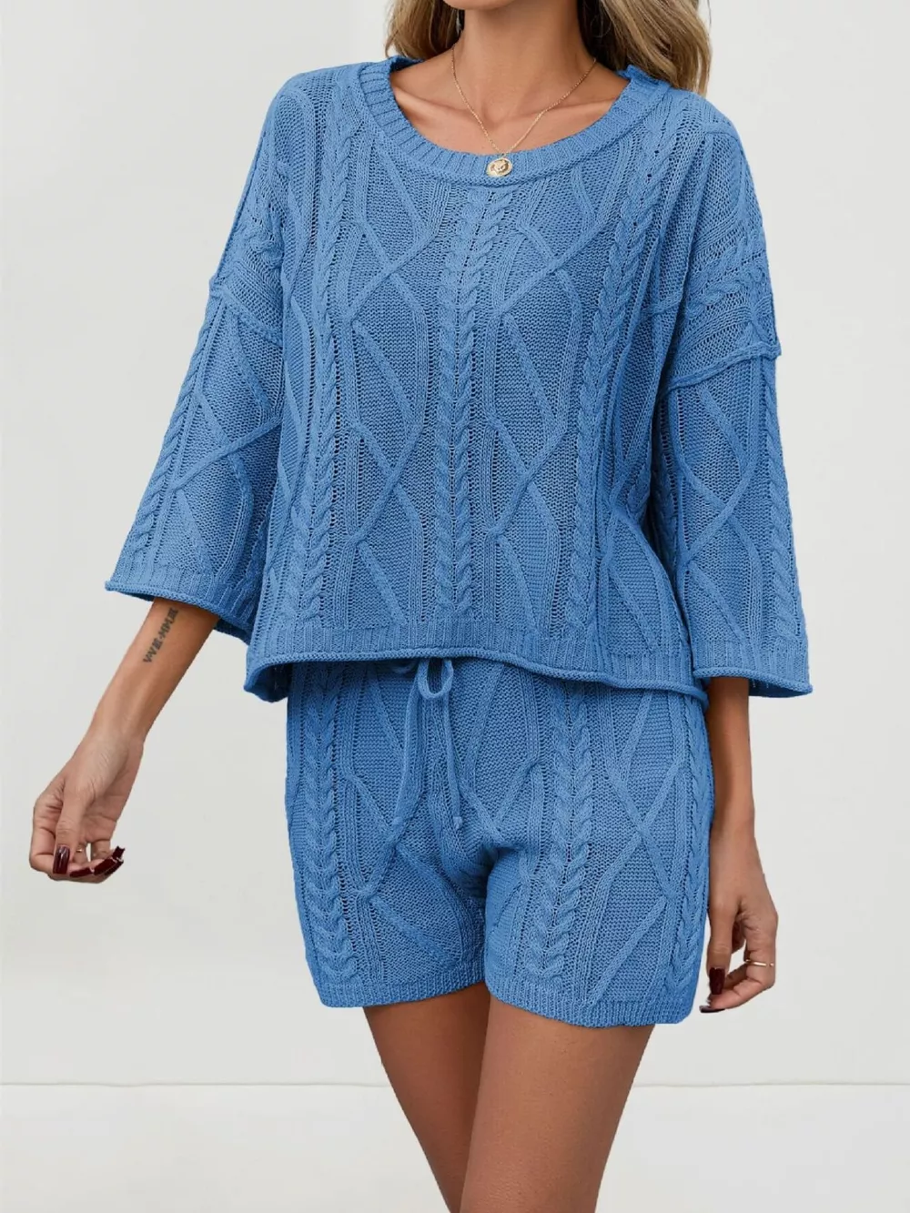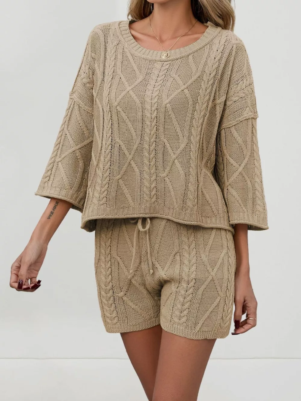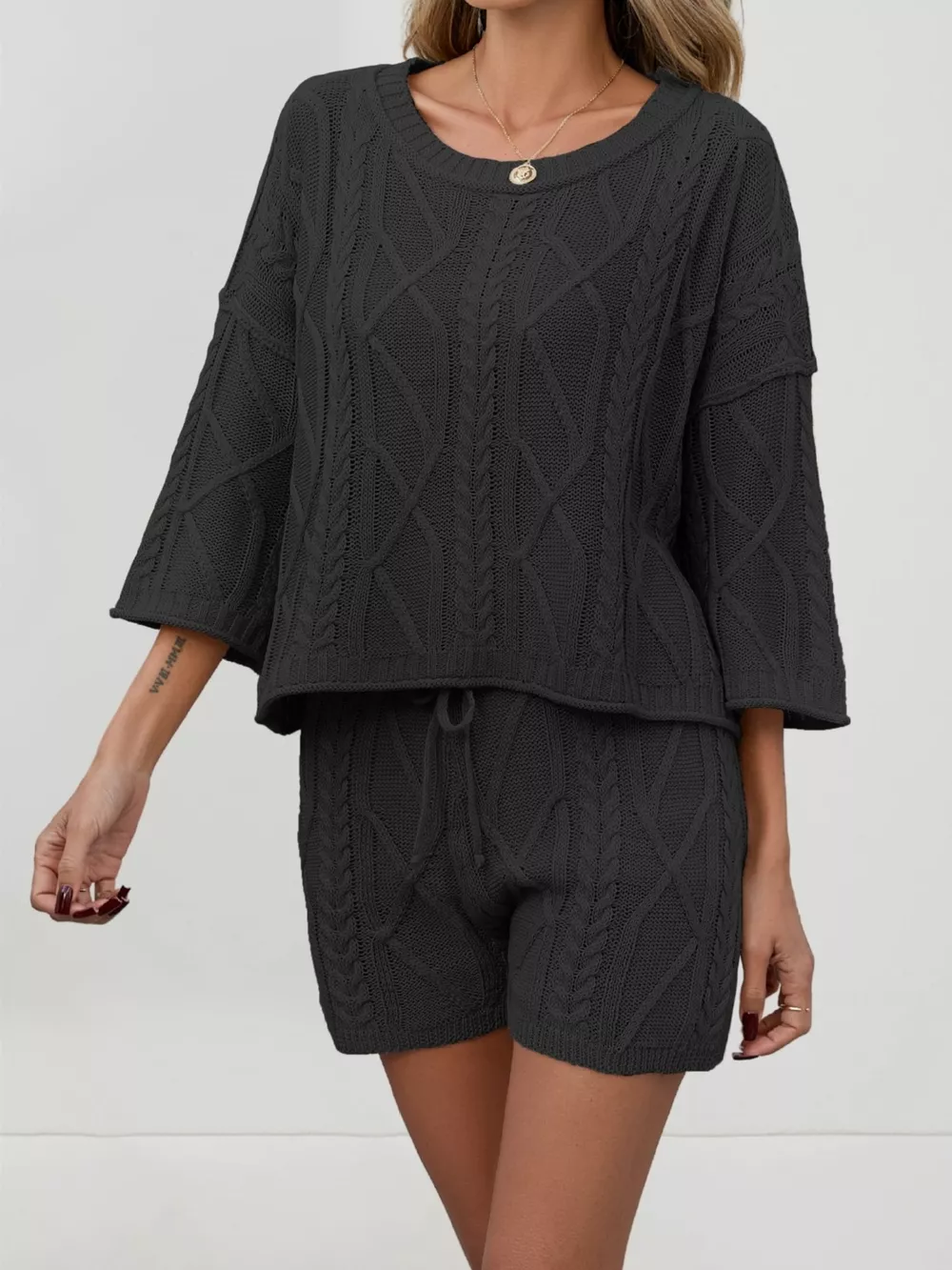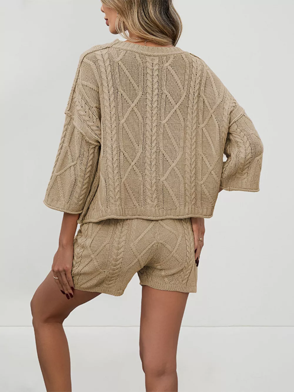 Cable Knit Round Neck Top and Shorts Sweater Set