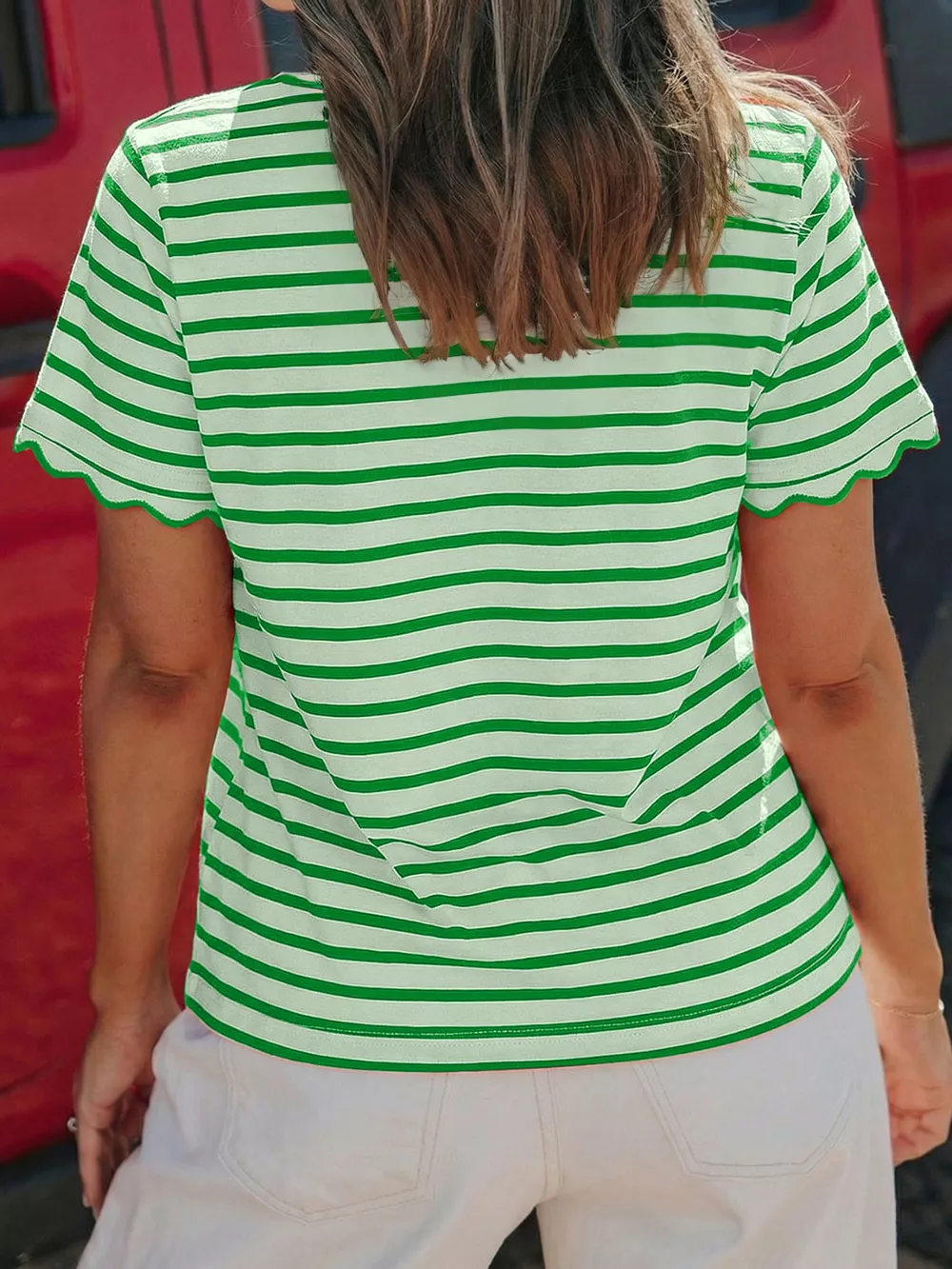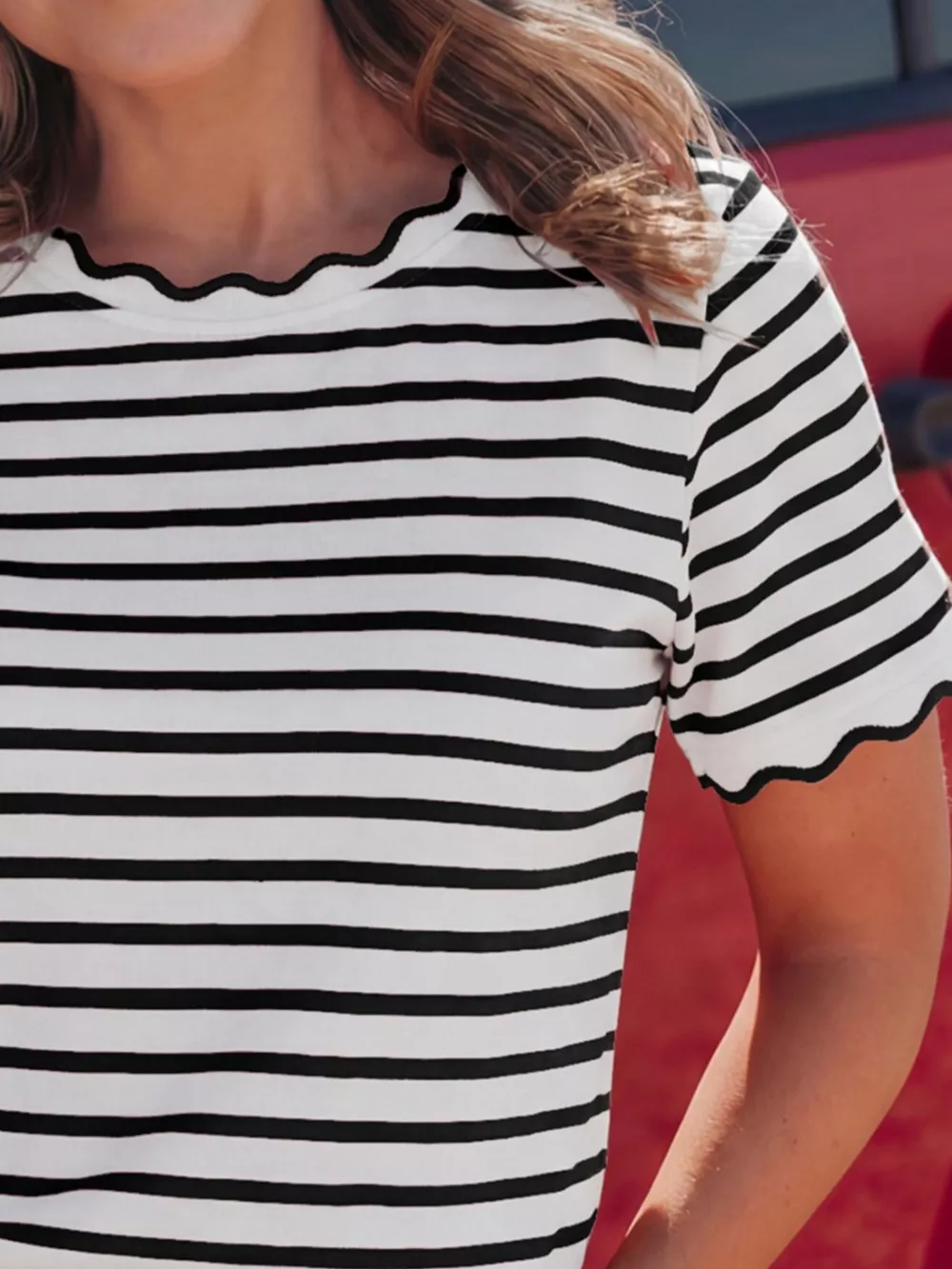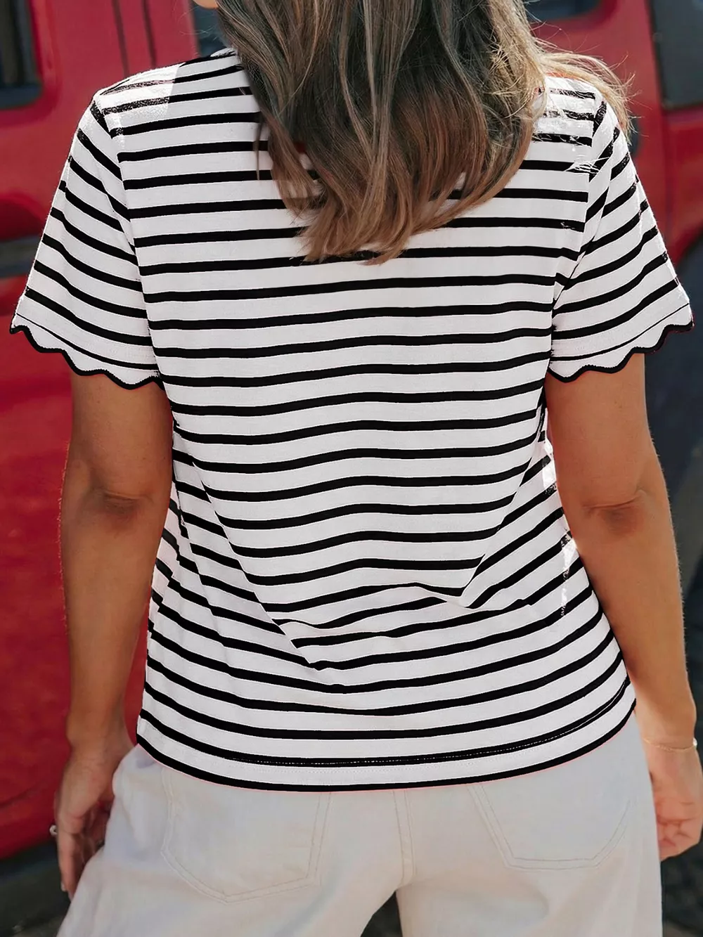 Striped Scallop-Trimmed Round Neck T-Shirt