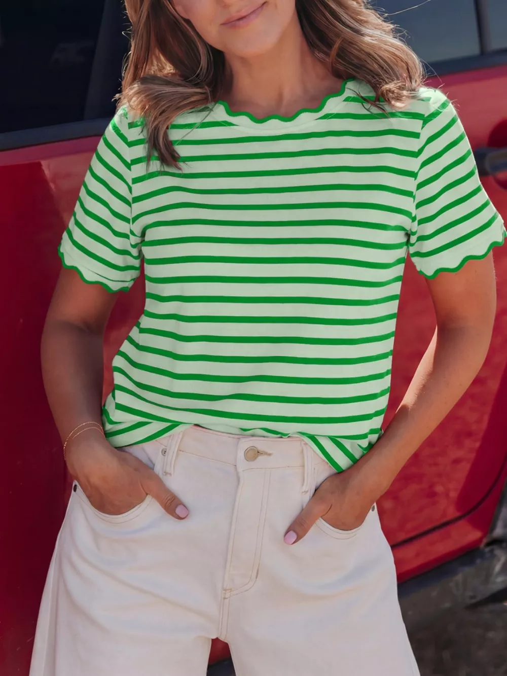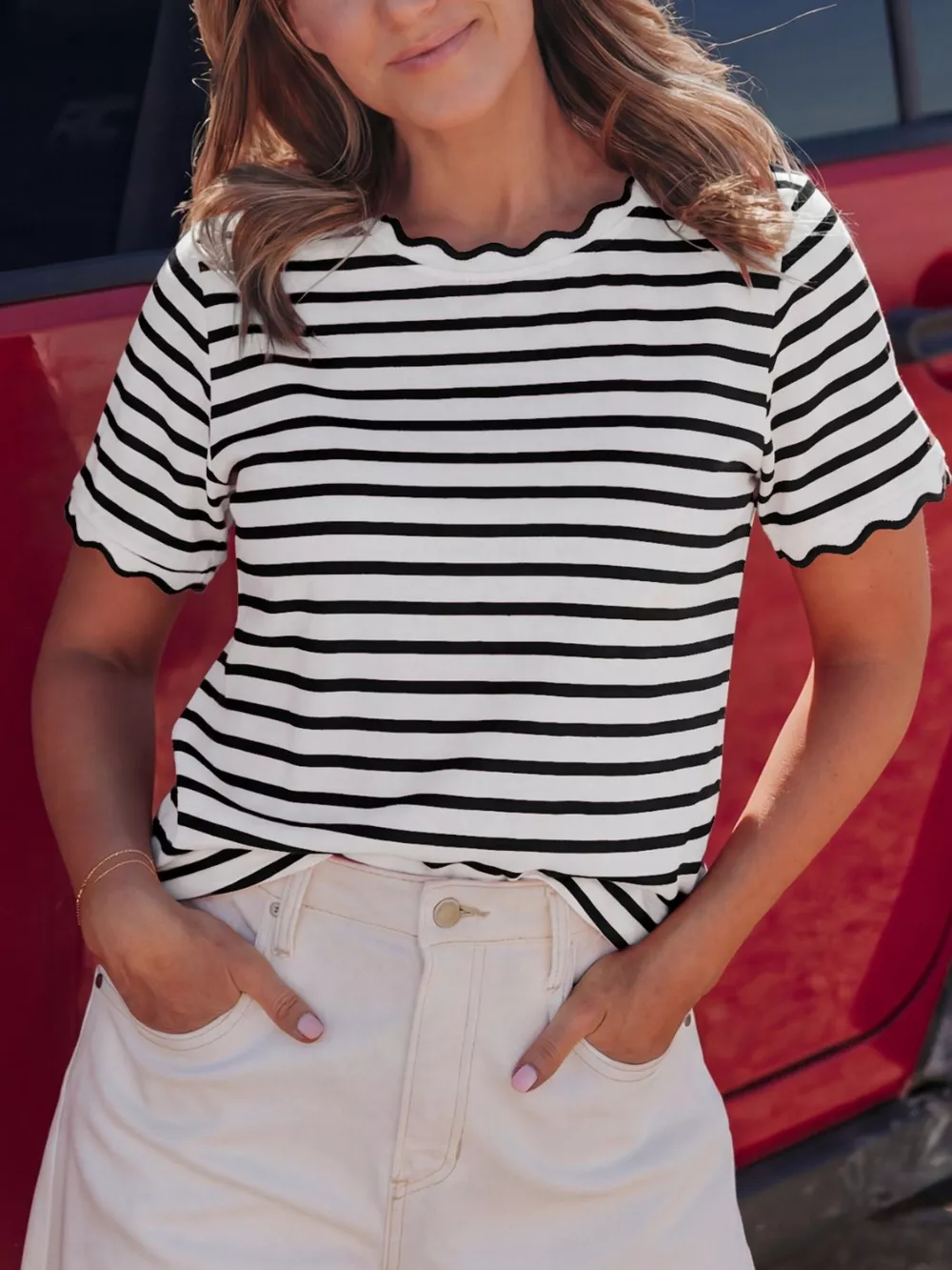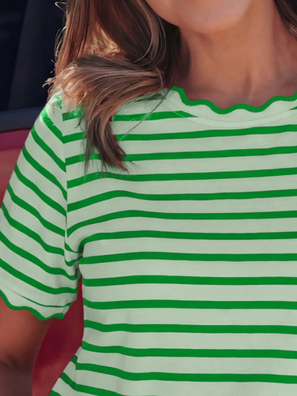 Striped Scallop-Trimmed Round Neck T-Shirt