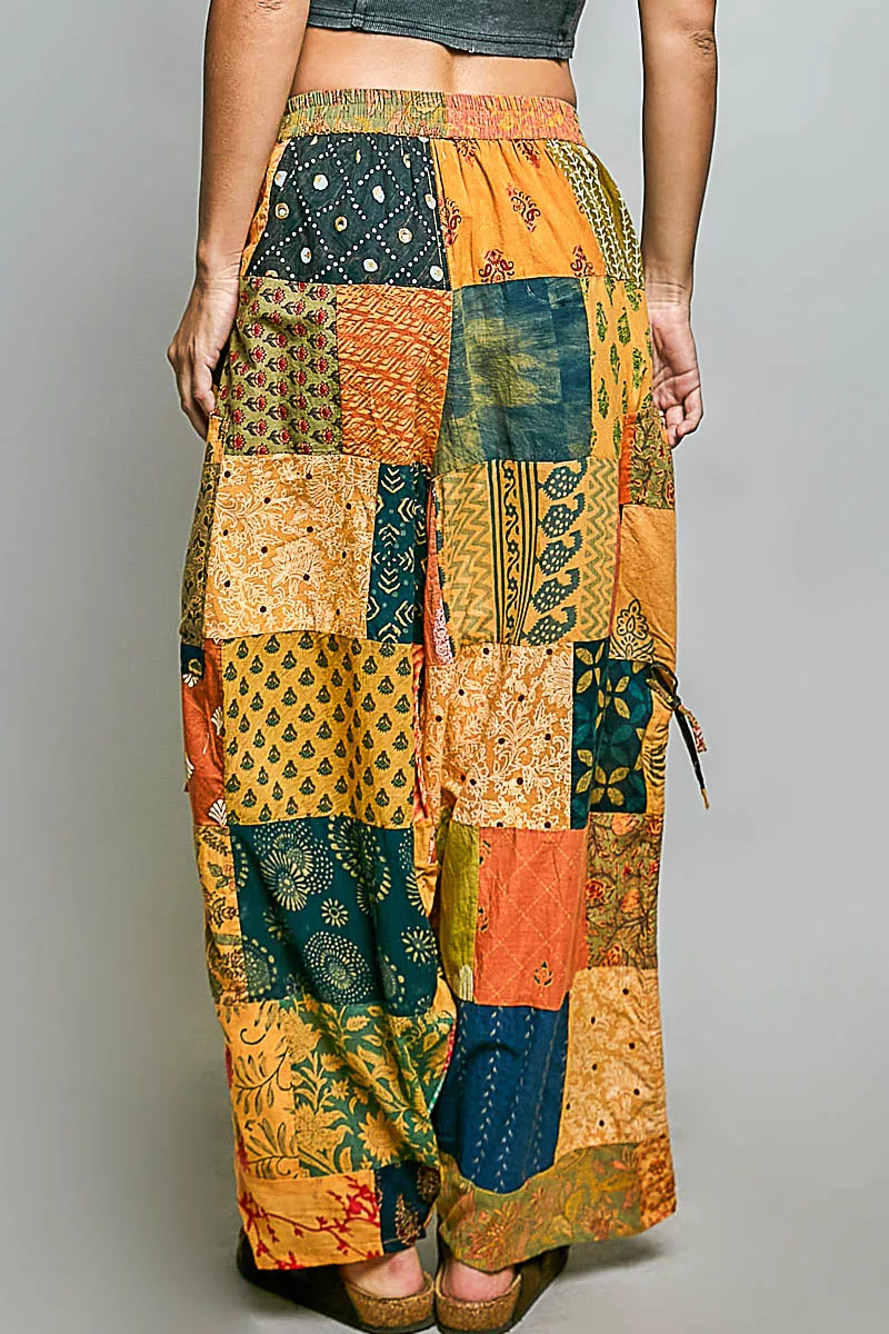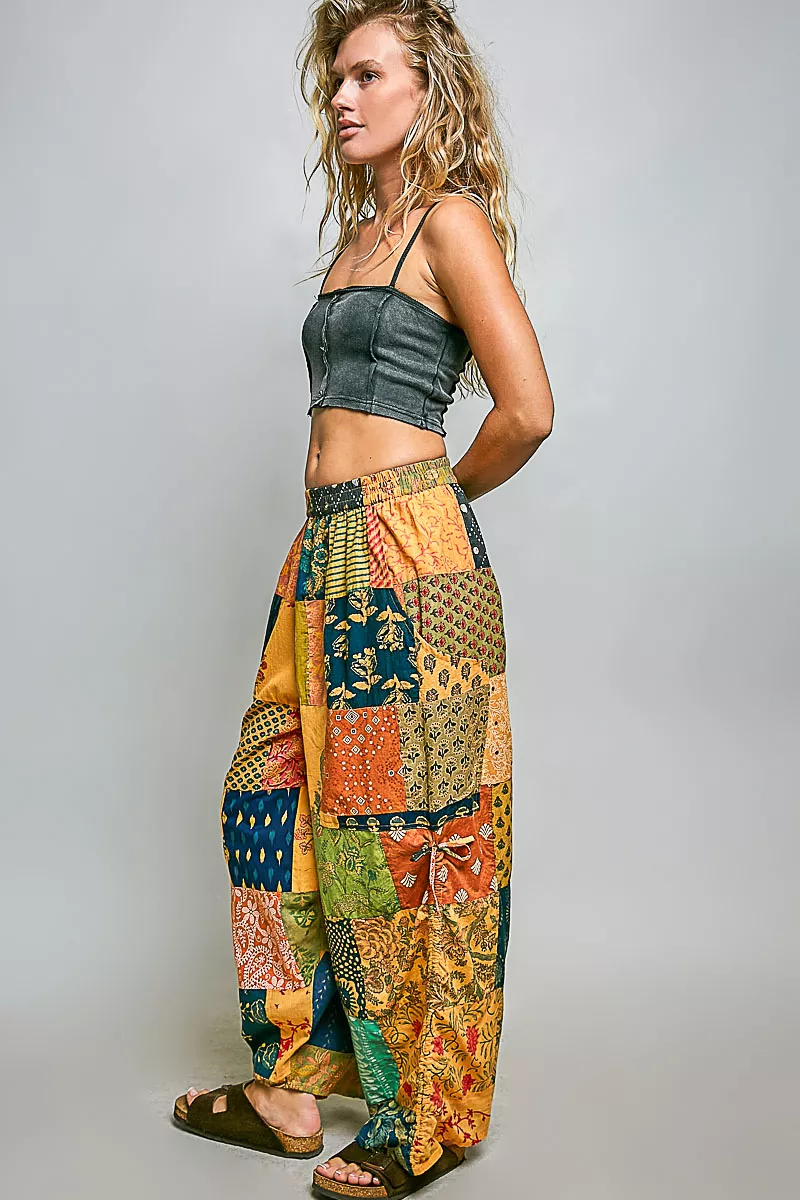 Wide-leg pants crafted from printed woven fabric, featuring varied patchwork construction and an adjustable side drawstring that allows subtle shirring for a customizable fit. This piece combines effortless comfort with a visually engaging design.
