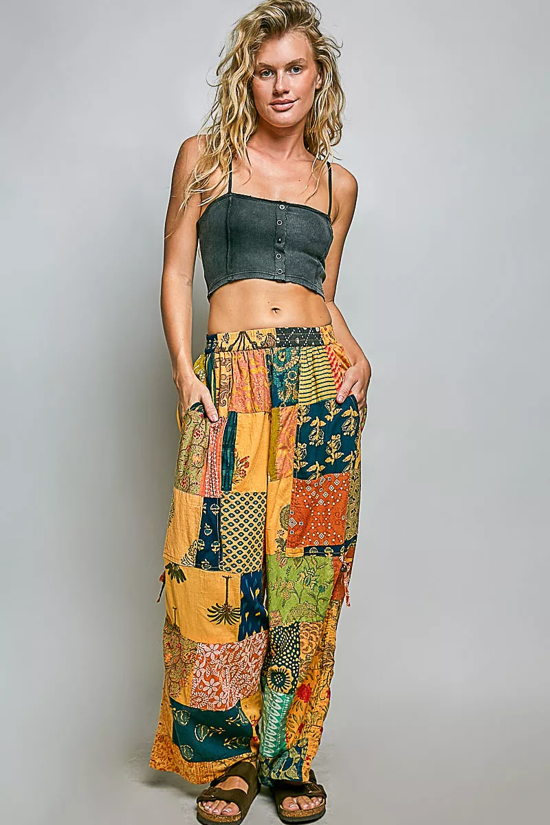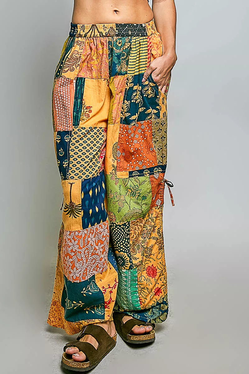 POL Printed Patchwork Wide Leg Pants with Adjustable Side Drawstring
