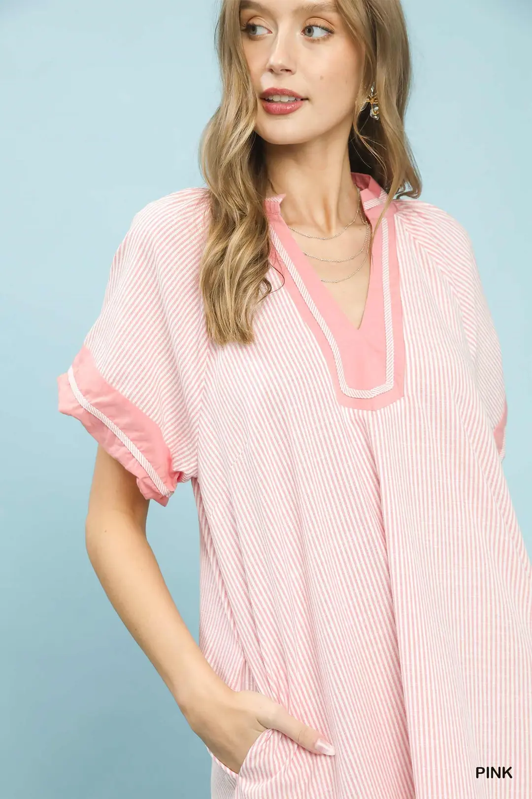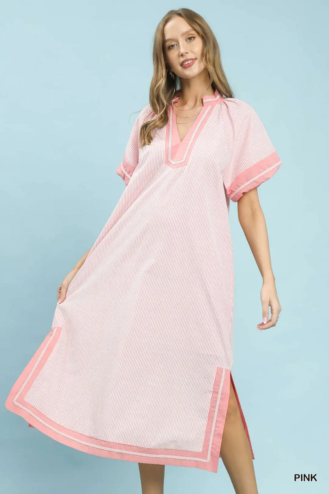 This timeless midi dress showcases a refined pinstripe pattern that brings a sleek, polished touch to any look. It features a flattering split V‑neck accented with bold contrast trim for a sharp, eye-catching detail, paired with relaxed short dolman sleeves for effortless comfort and flow. Designed with practical side pockets and fully lined for softness and coverage, the dress falls elegantly to midi length, balancing sophisticated style with everyday functionality. Ideal for casual gatherings, brunch, office-friendly looks, and warm-weather occasions.