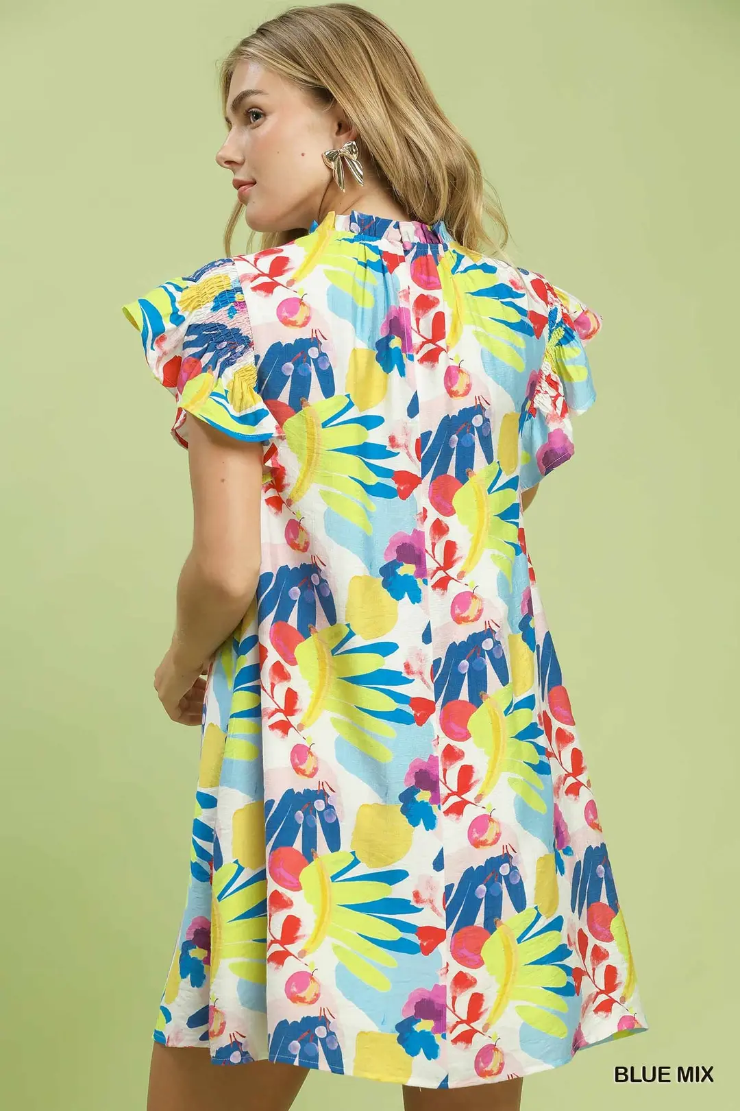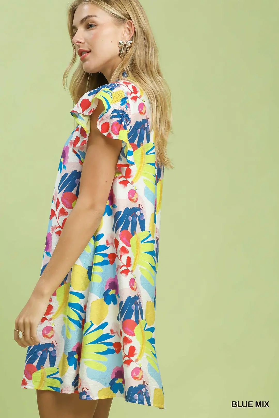 This charming mini dress features a fresh botanical print that brings a lively, natural touch to your wardrobe. Adorned with delicate ruffle details for a soft, romantic look, it offers a flattering, flowy fit that moves gracefully with you. Lightweight and feminine, it’s perfect for daytime outings, weekend brunches, vacations, and any casual occasion where you want to look effortlessly sweet and stylish.