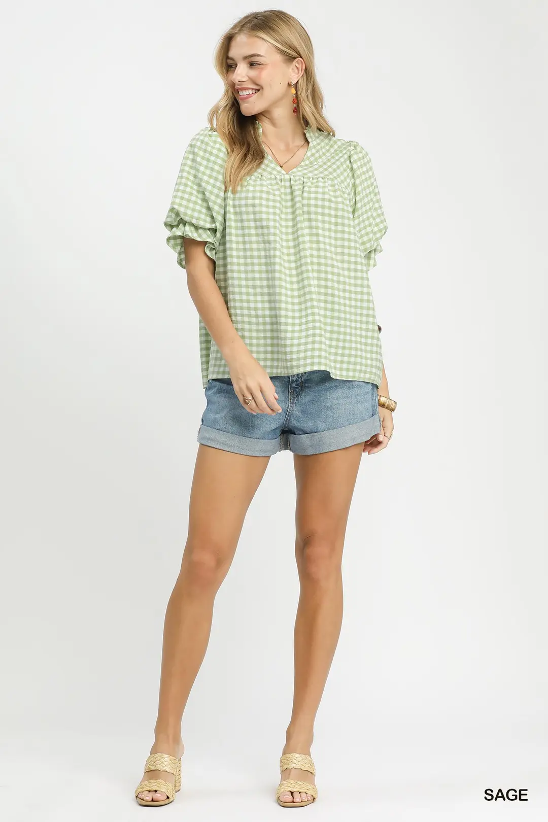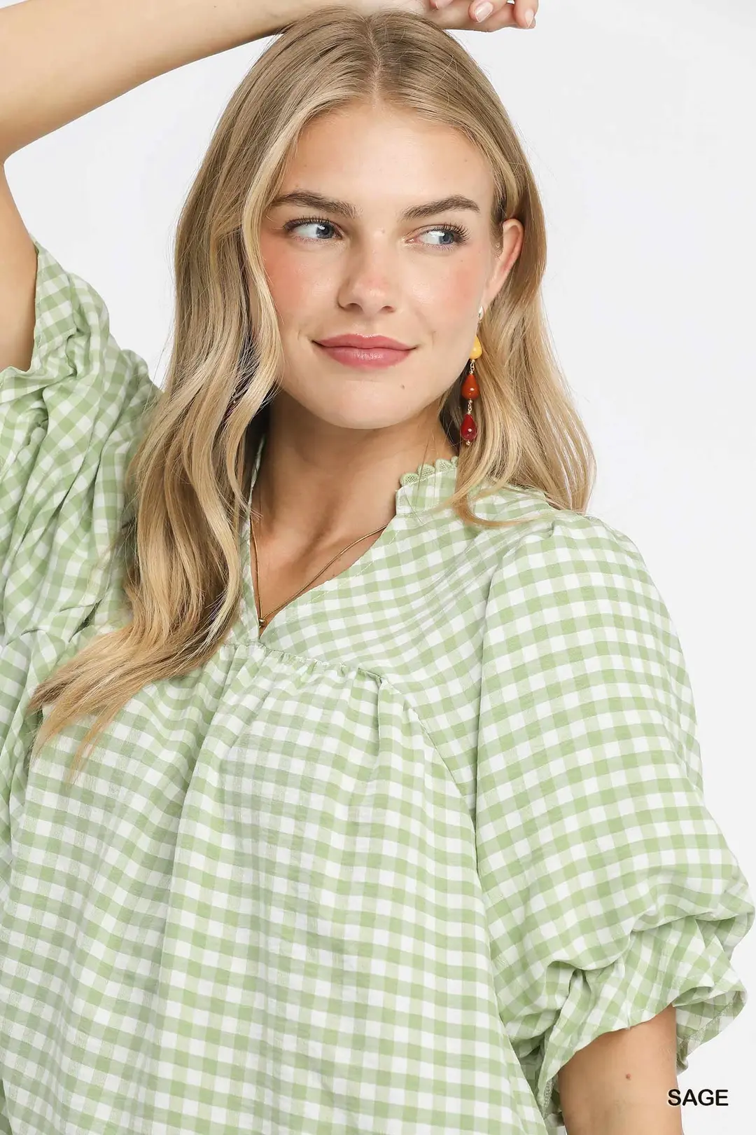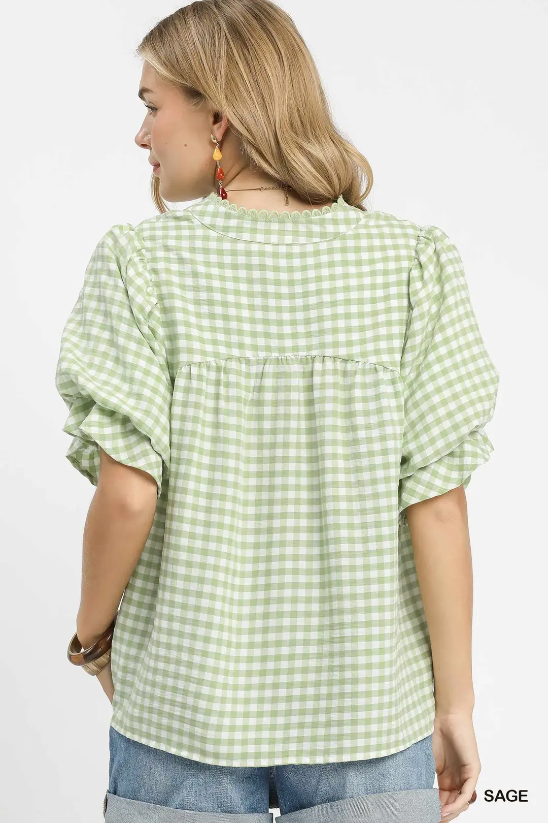 Umgee Gingham Puff Sleeve Babydoll Blouse