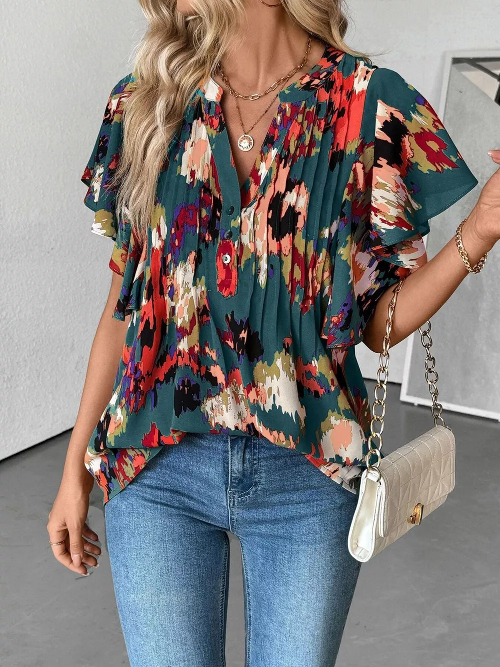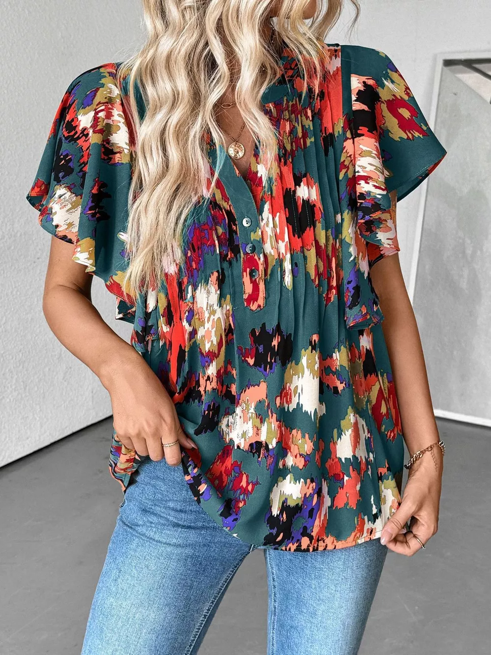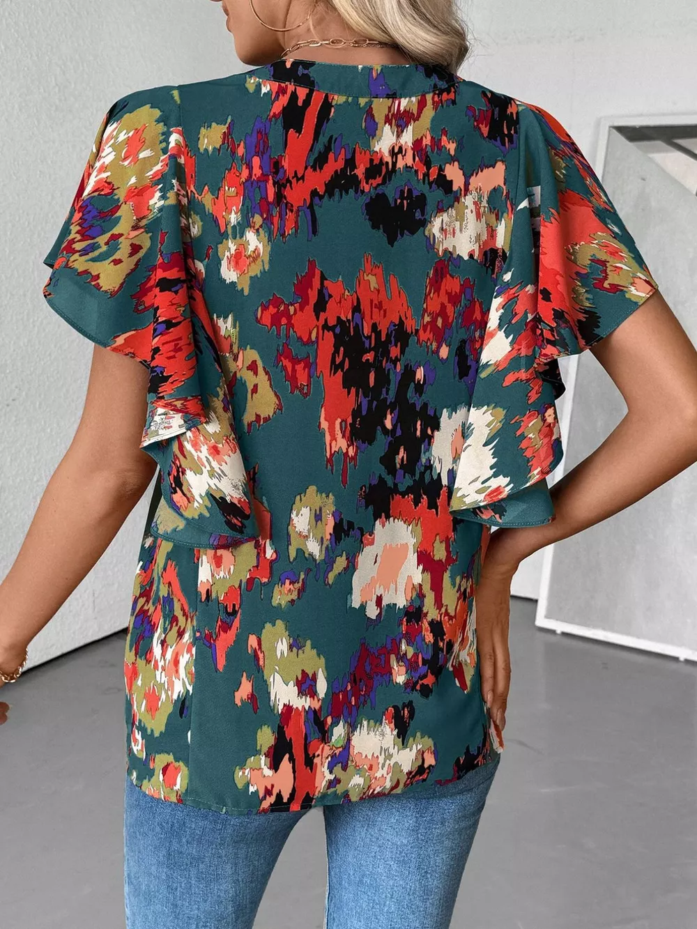 Abstract Print Ruffle Sleeve Blouse