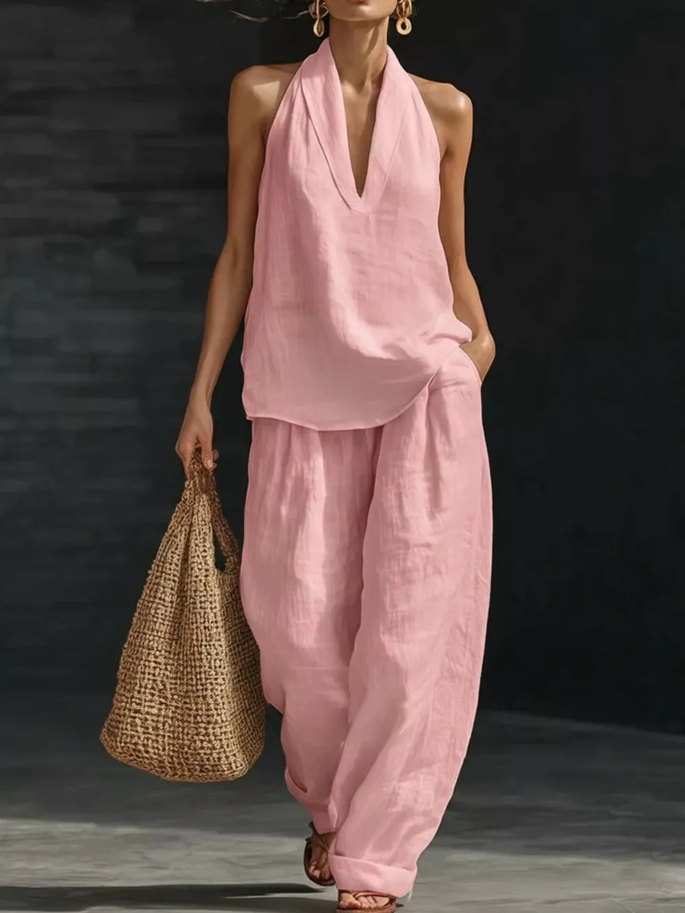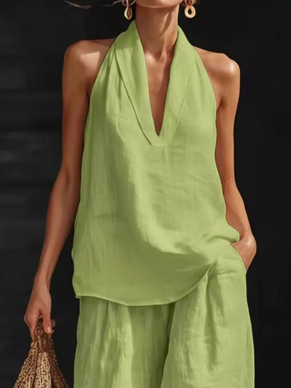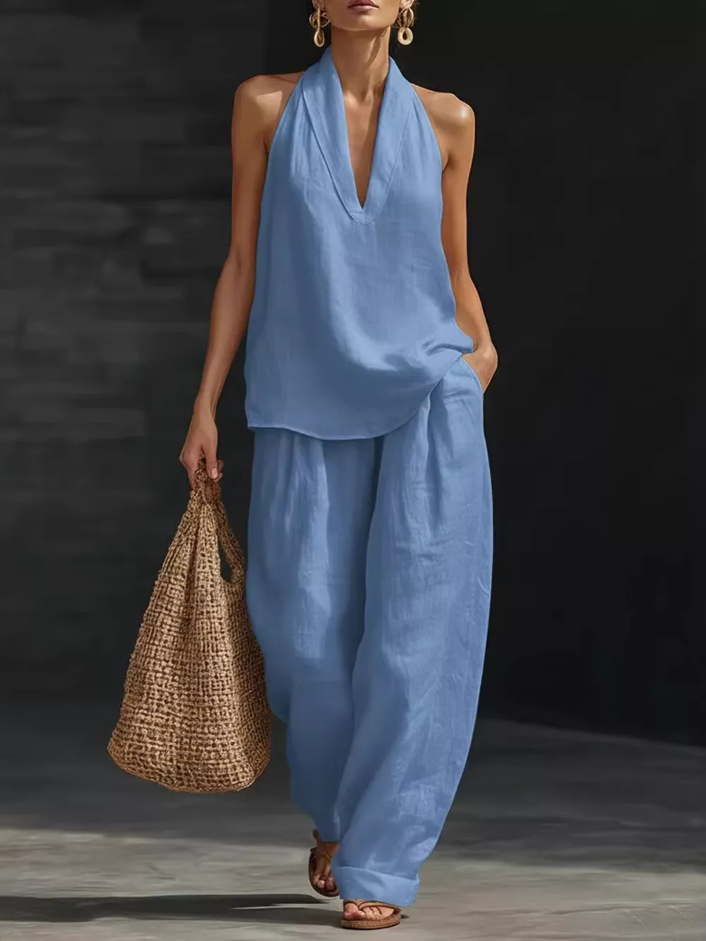 Full Size Halter Neck Top and Wide Leg Pants Set Plus Size