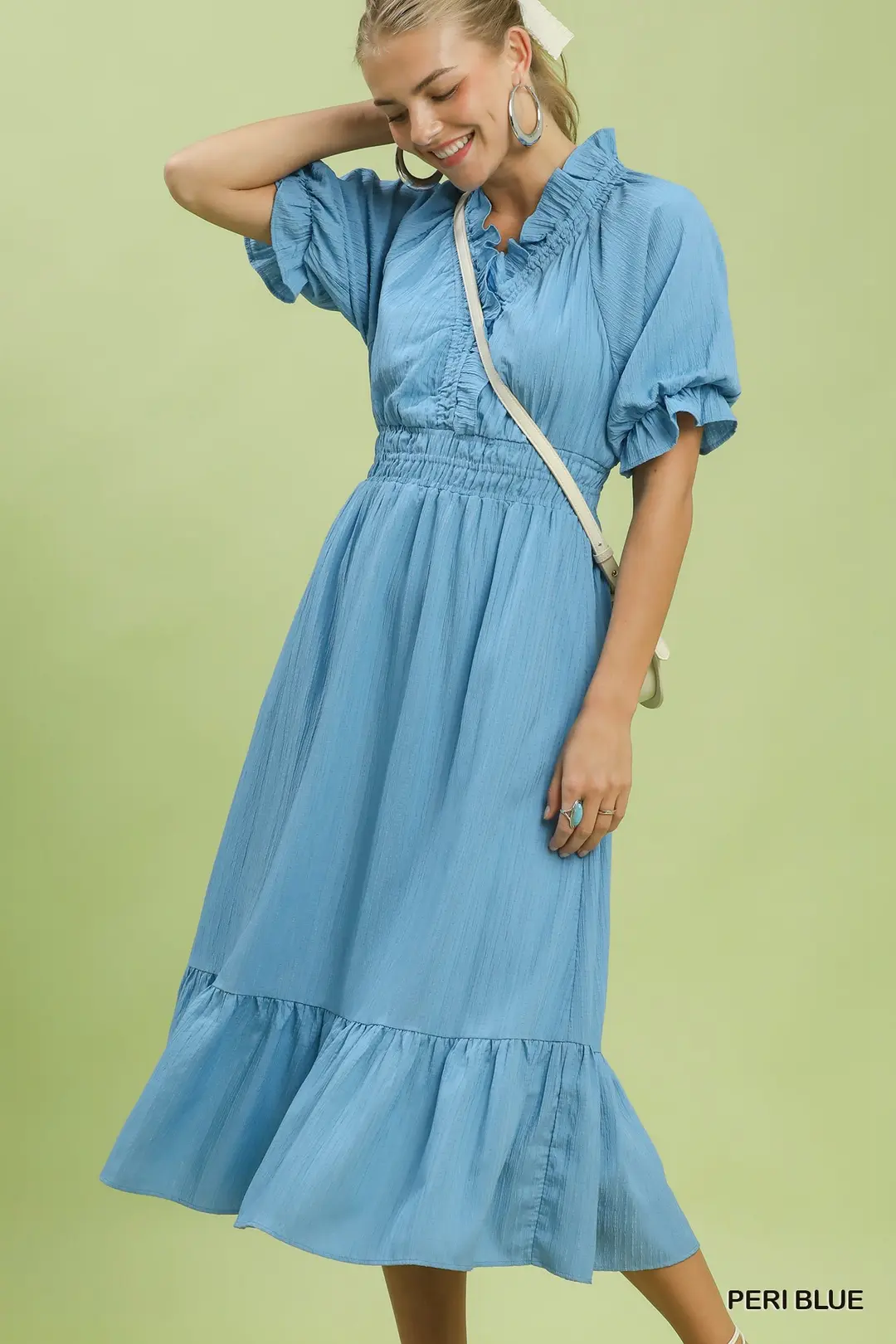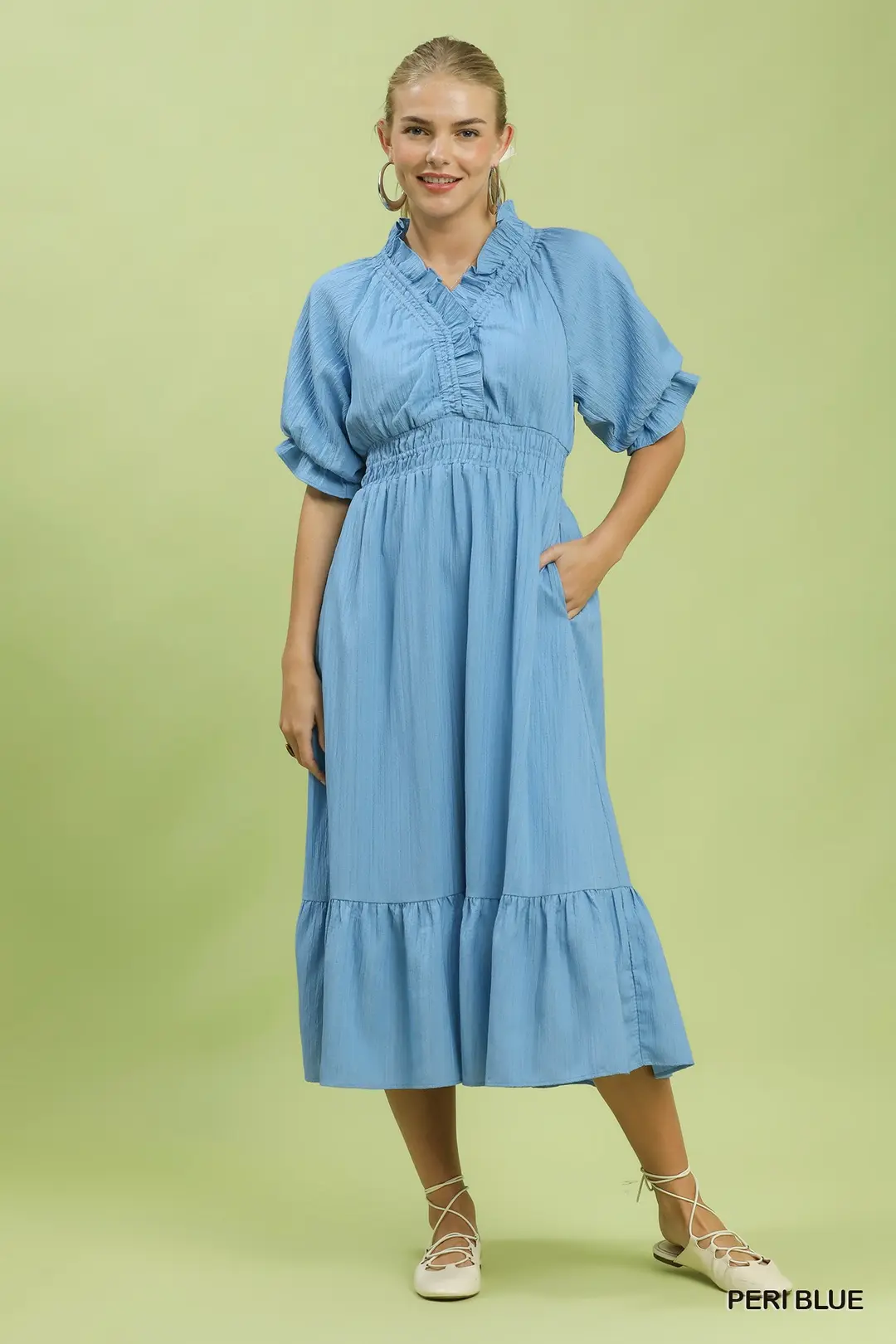 This feminine midi dress features a delicate ruffle-trimmed V-neckline that adds soft romantic detail to its elegant silhouette. Designed in a flattering midi length with a breezy, flowy fit, it offers both comfort and timeless style. The subtle ruffle accents enhance its gentle charm, making it a versatile piece for brunch, daytime events, vacation outings, and casual semi-formal occasions. Easy to dress up or down, it effortlessly combines grace with everyday wearability.