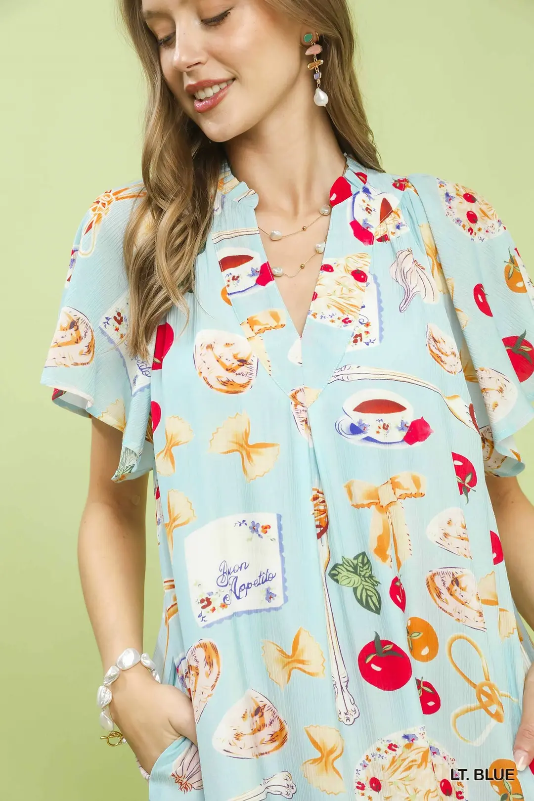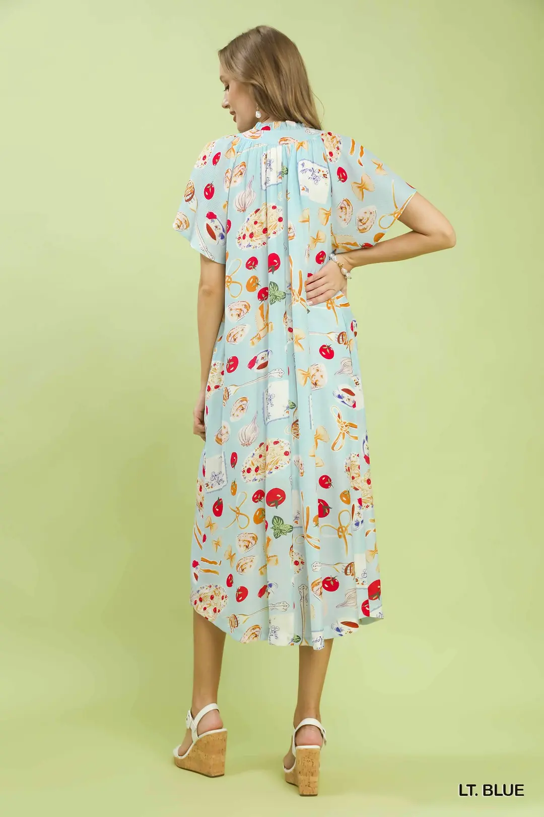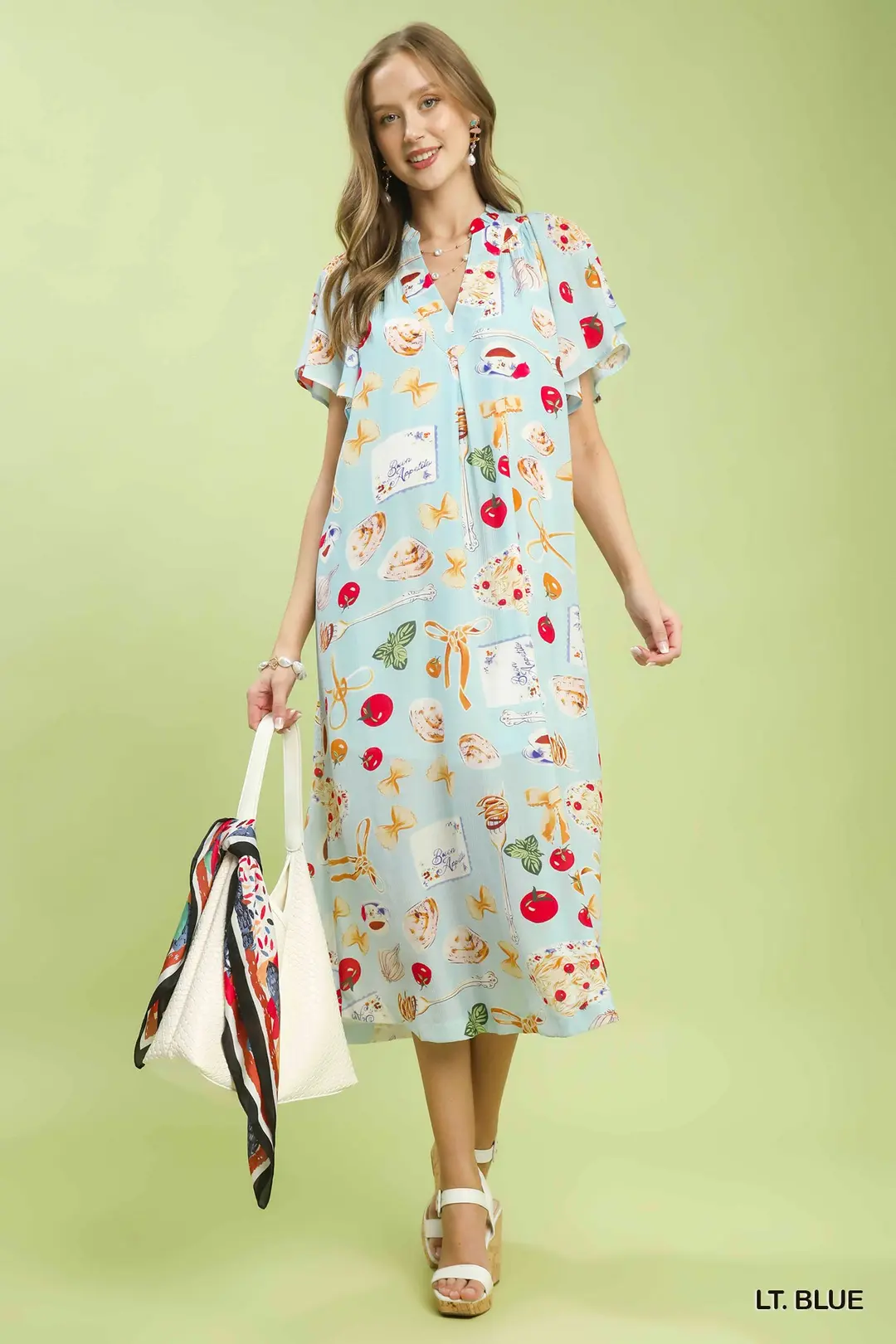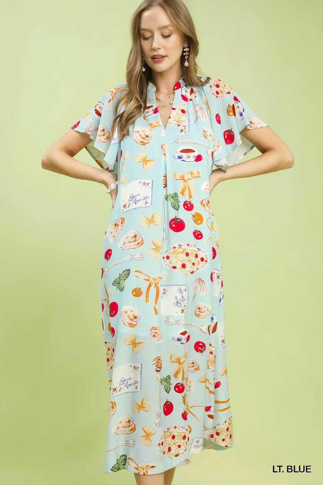 This midi dress features a charming whimsical print on a light blue background, making it a standout piece for any wardrobe. The flutter sleeves add a touch of elegance and femininity, while the midi length offers a flattering silhouette. Made from a lightweight and breathable fabric, this dress ensures comfort and ease of movement. The V-neckline enhances the overall appeal, making it suitable for both casual and semi-formal occasions. Perfect for spring and summer, this dress is a versatile choice that can be dressed up with heels or down with sandals. The unique print and stylish design make it a must-have for those who appreciate fashion-forward pieces.