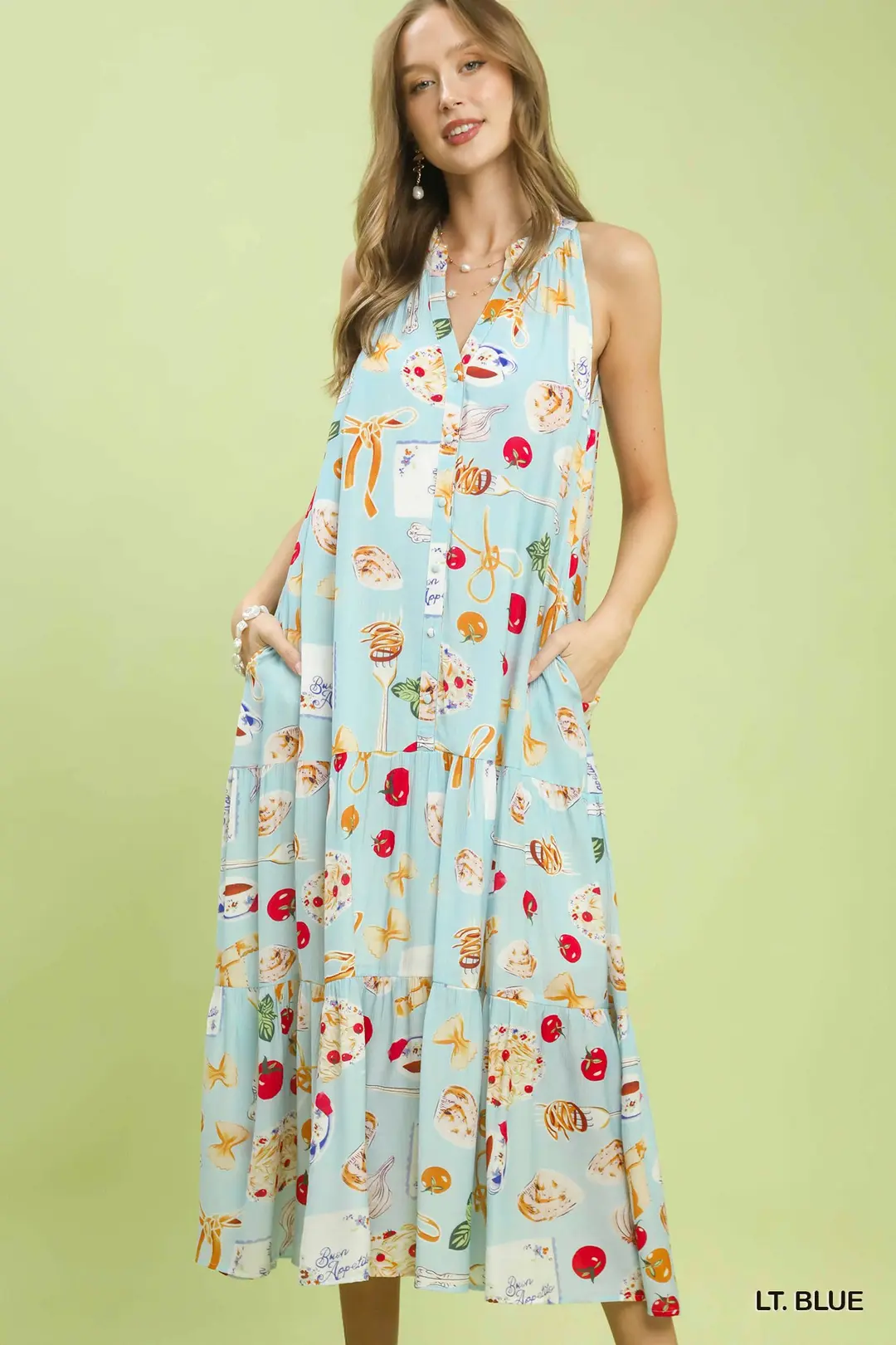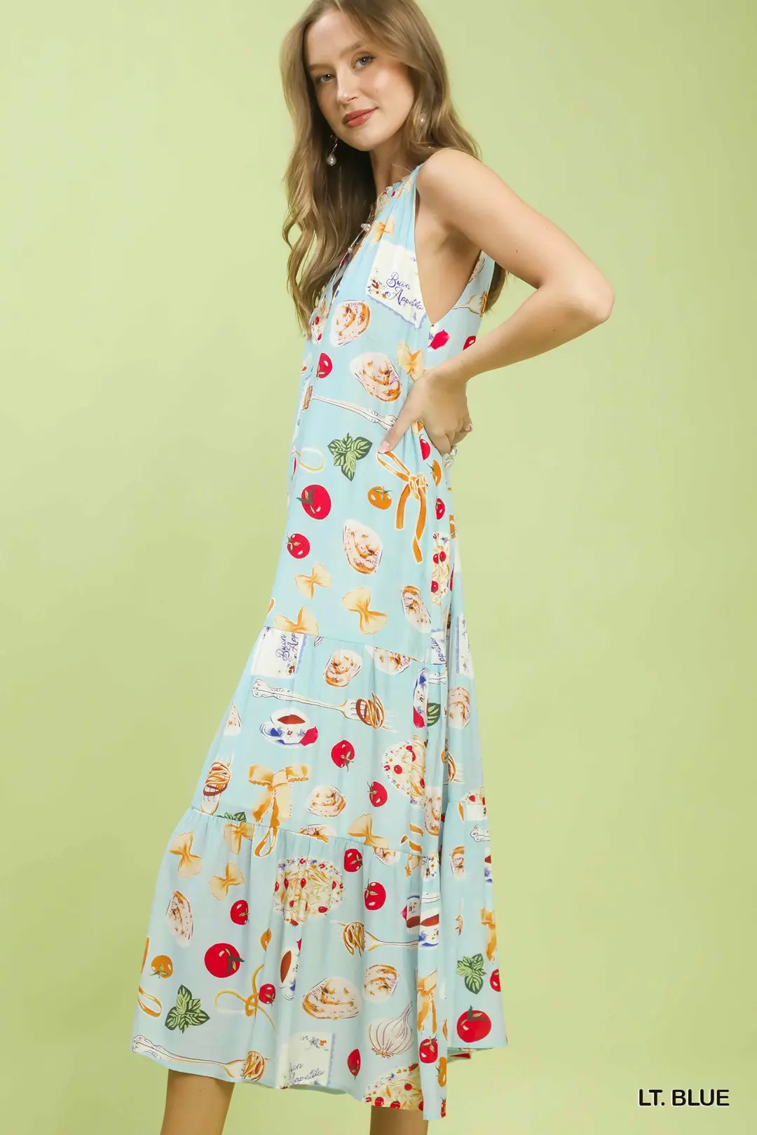 This eye-catching midi dress features a unique abstract print for a modern artistic vibe. Designed with a flattering halter V-neck with tie detail, it has a sleek sleeveless cut that’s perfect for warm weather. The flowy tiered skirt creates beautiful movement, while convenient side pockets add practicality. Fully lined for comfort and coverage, this dress blends contemporary style with feminine charm, ideal for vacations, brunch, parties and casual daytime events.