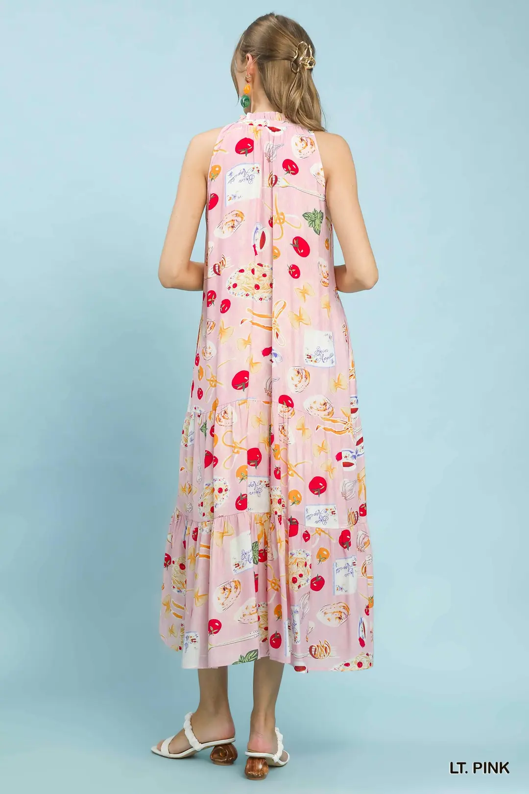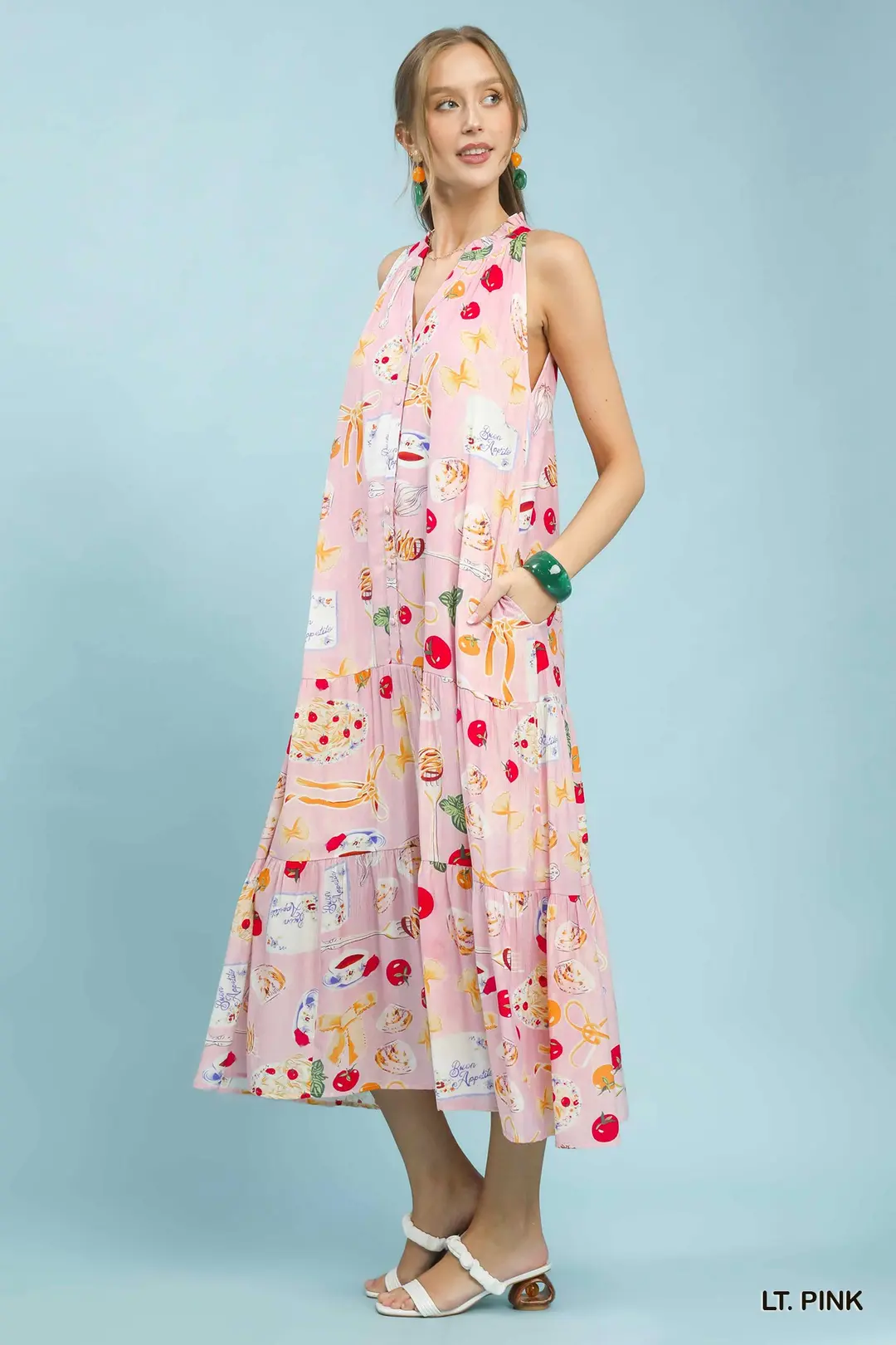 This eye-catching midi dress features a unique abstract print for a modern artistic vibe. Designed with a flattering halter V-neck with tie detail, it has a sleek sleeveless cut that’s perfect for warm weather. The flowy tiered skirt creates beautiful movement, while convenient side pockets add practicality. Fully lined for comfort and coverage, this dress blends contemporary style with feminine charm, ideal for vacations, brunch, parties and casual daytime events.