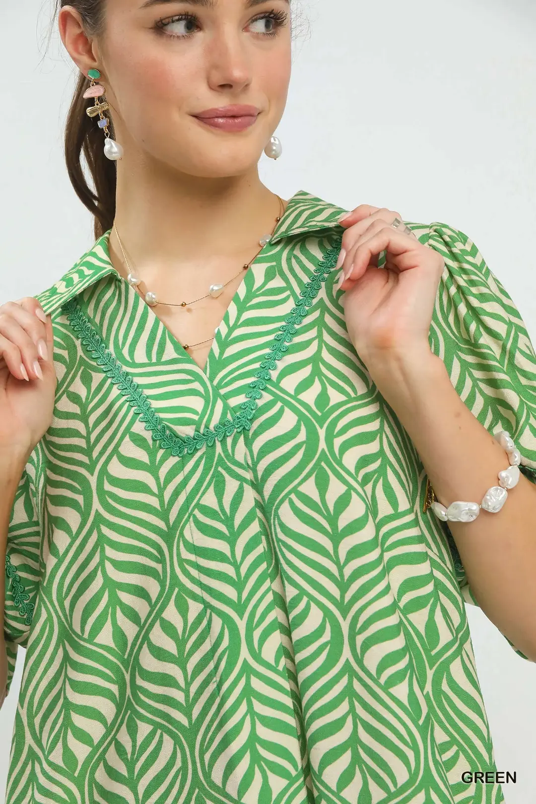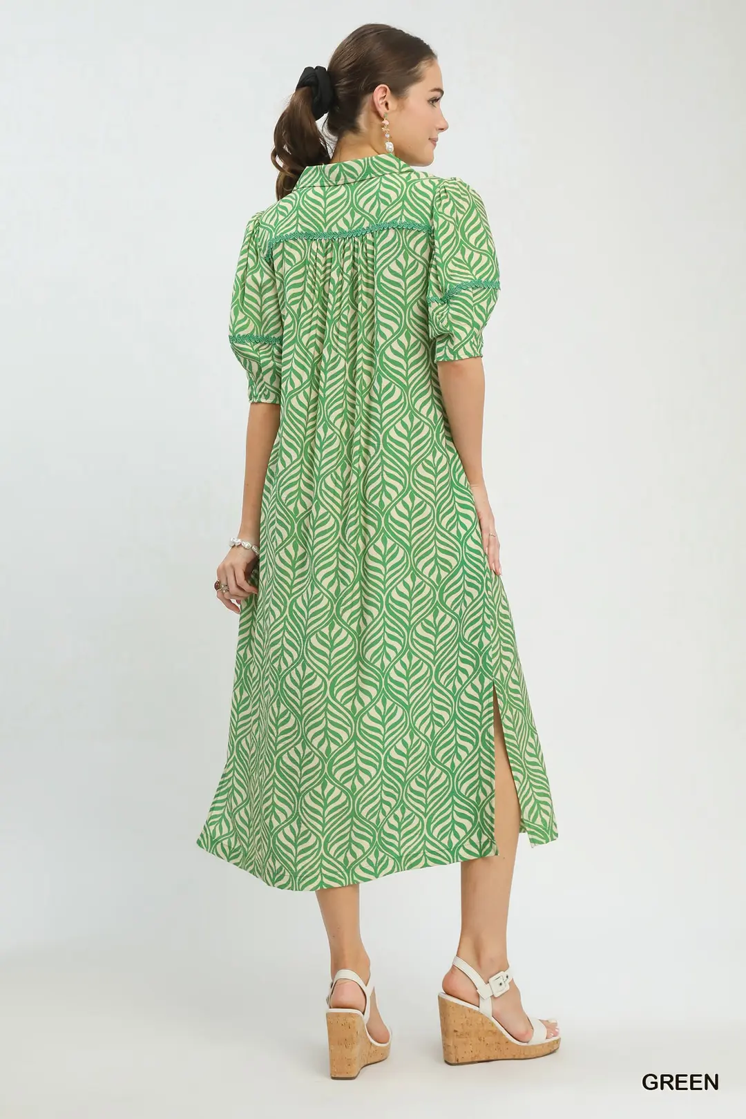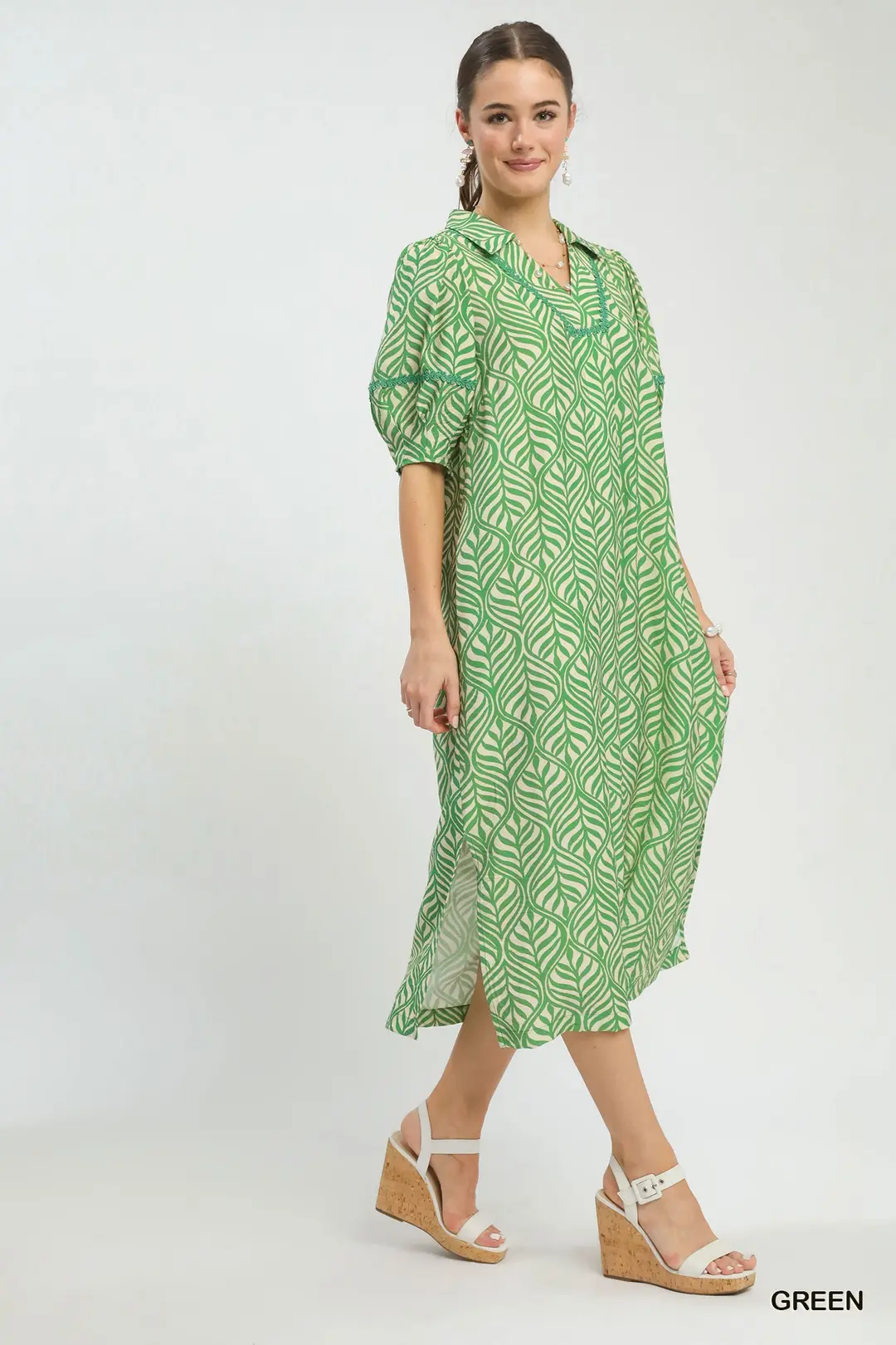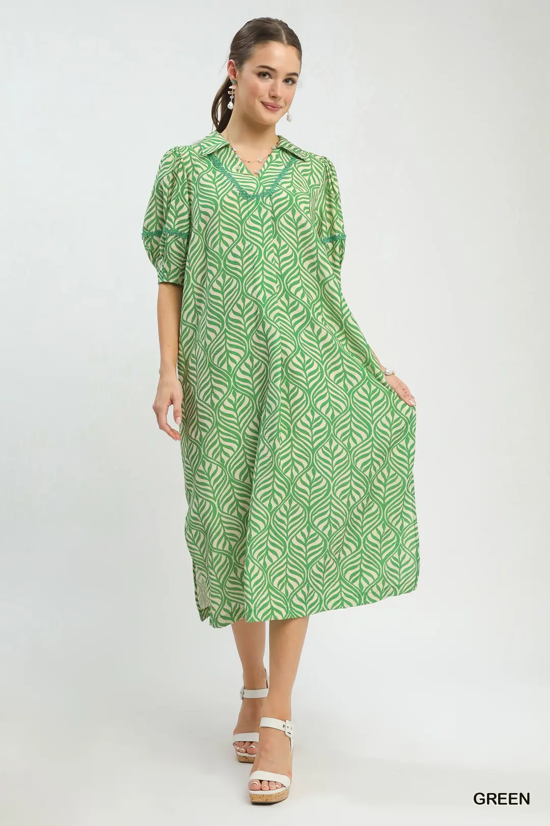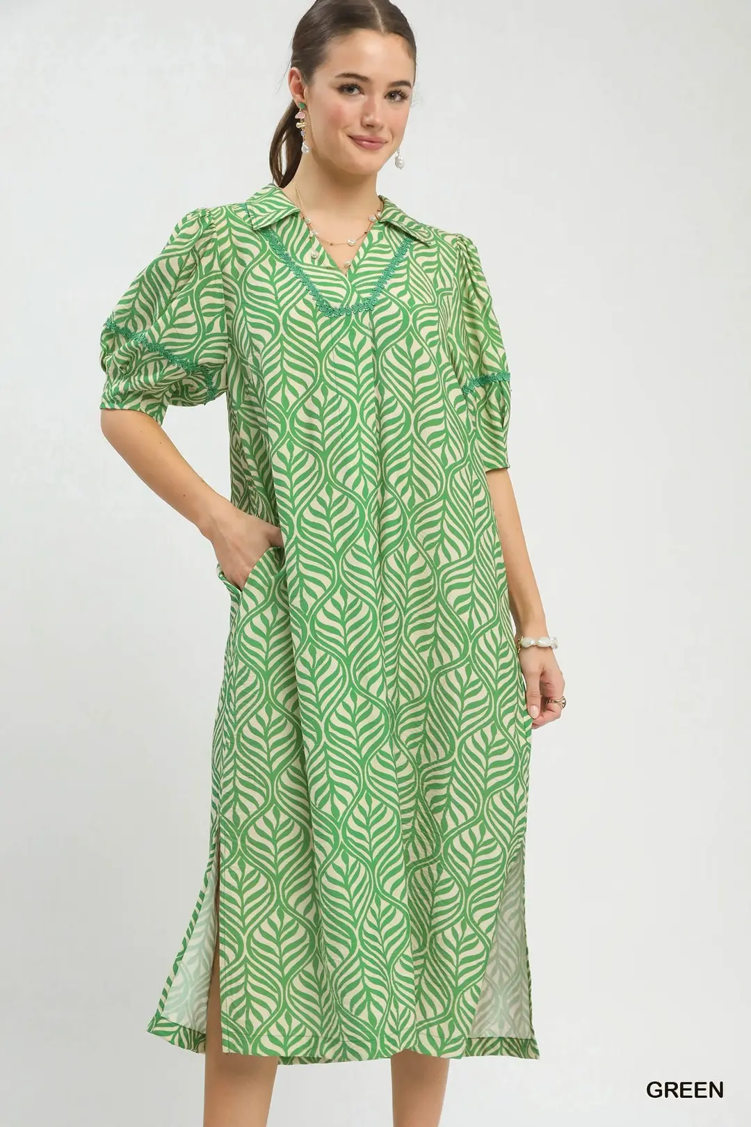 This boho-style midi dress is adorned with a beautiful allover leaf-inspired print, bringing a fresh natural charm to your wardrobe. It features a flattering split V-neck and cute short puff sleeves for a soft, romantic look. Designed with practical side pockets and an unlined, lightweight construction for breathable comfort, this flowy midi dress is perfect for casual outings, vacations, brunch dates and everyday warm-weather wear.