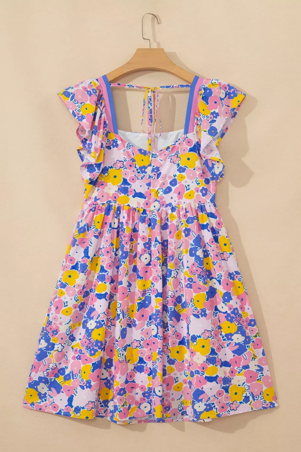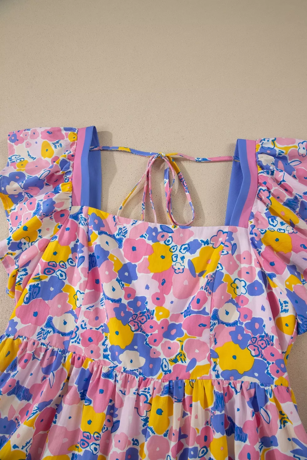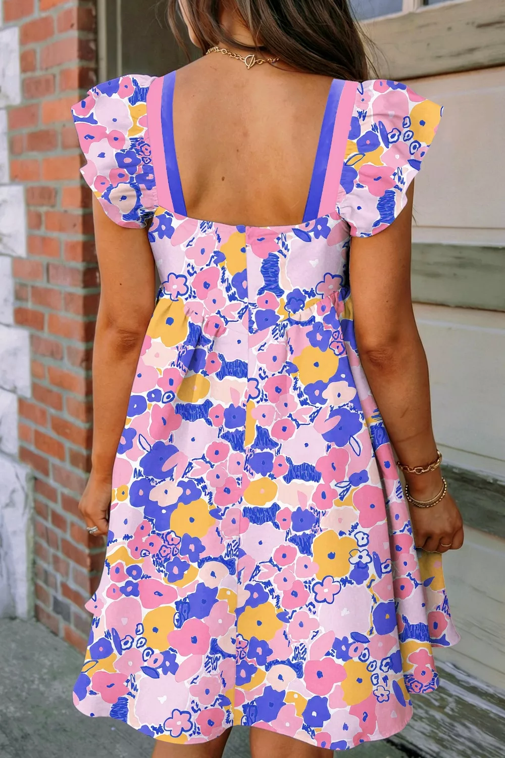 Floral Print Flutter Sleeve Striped Trim Square Neck Loose Mini Dress