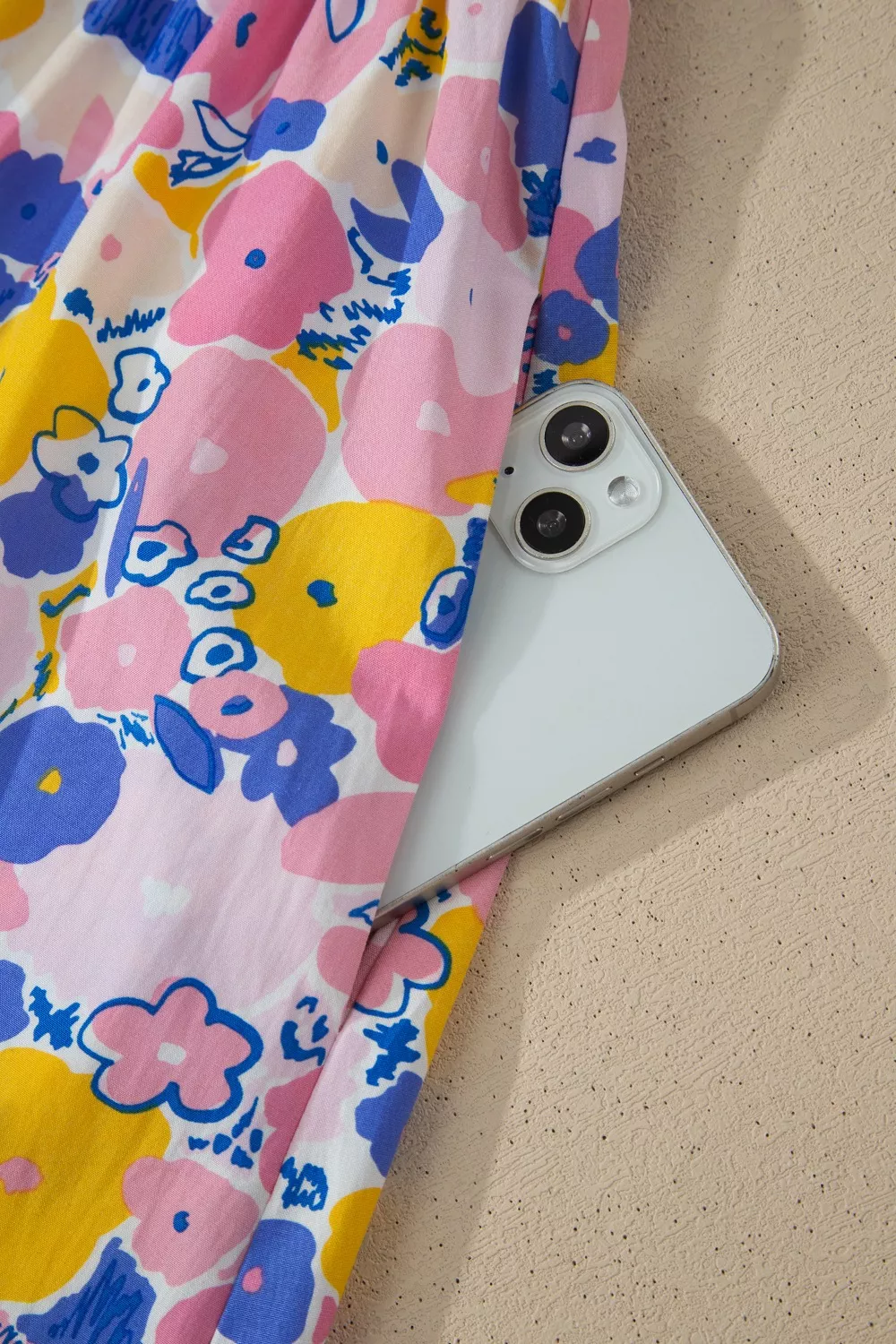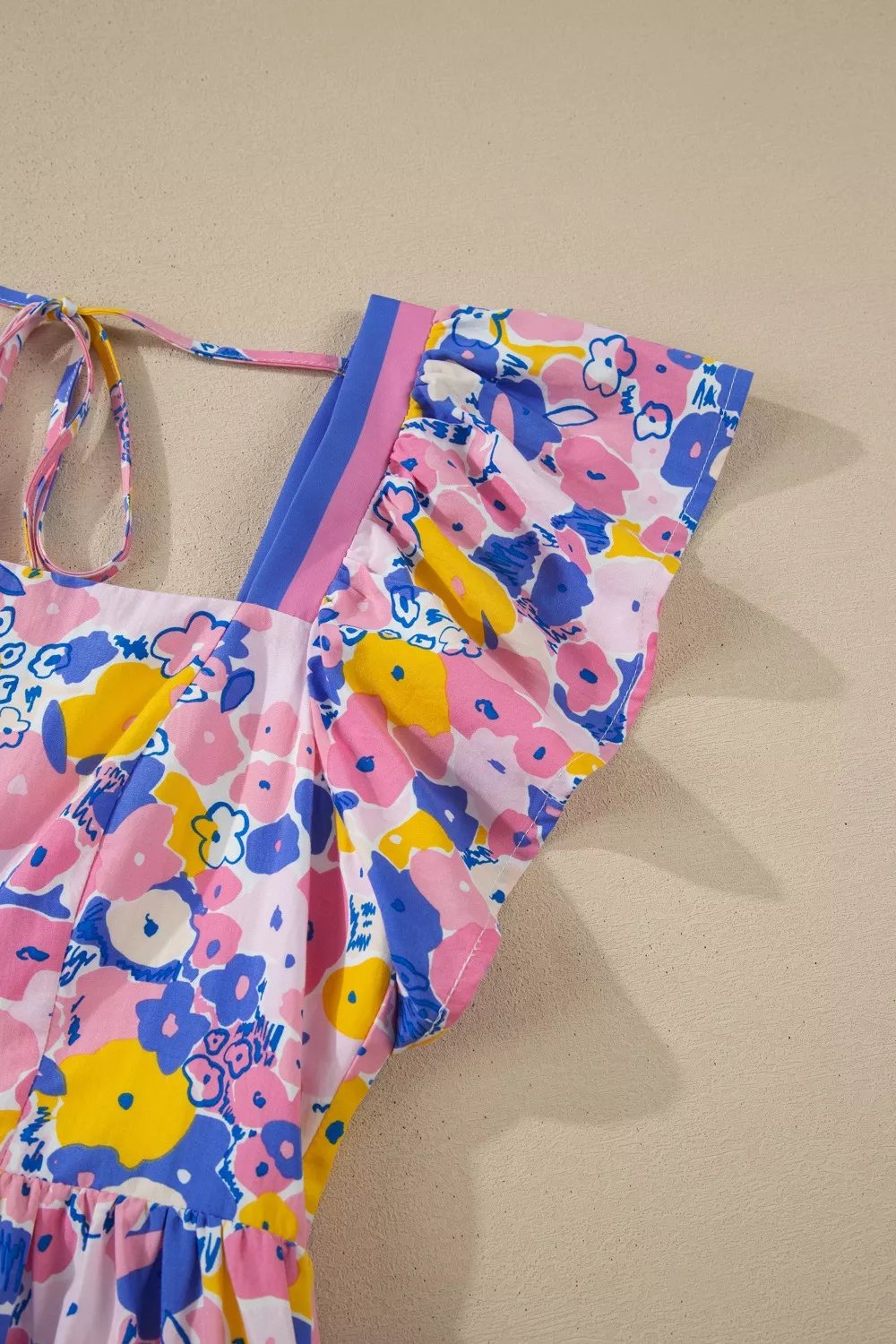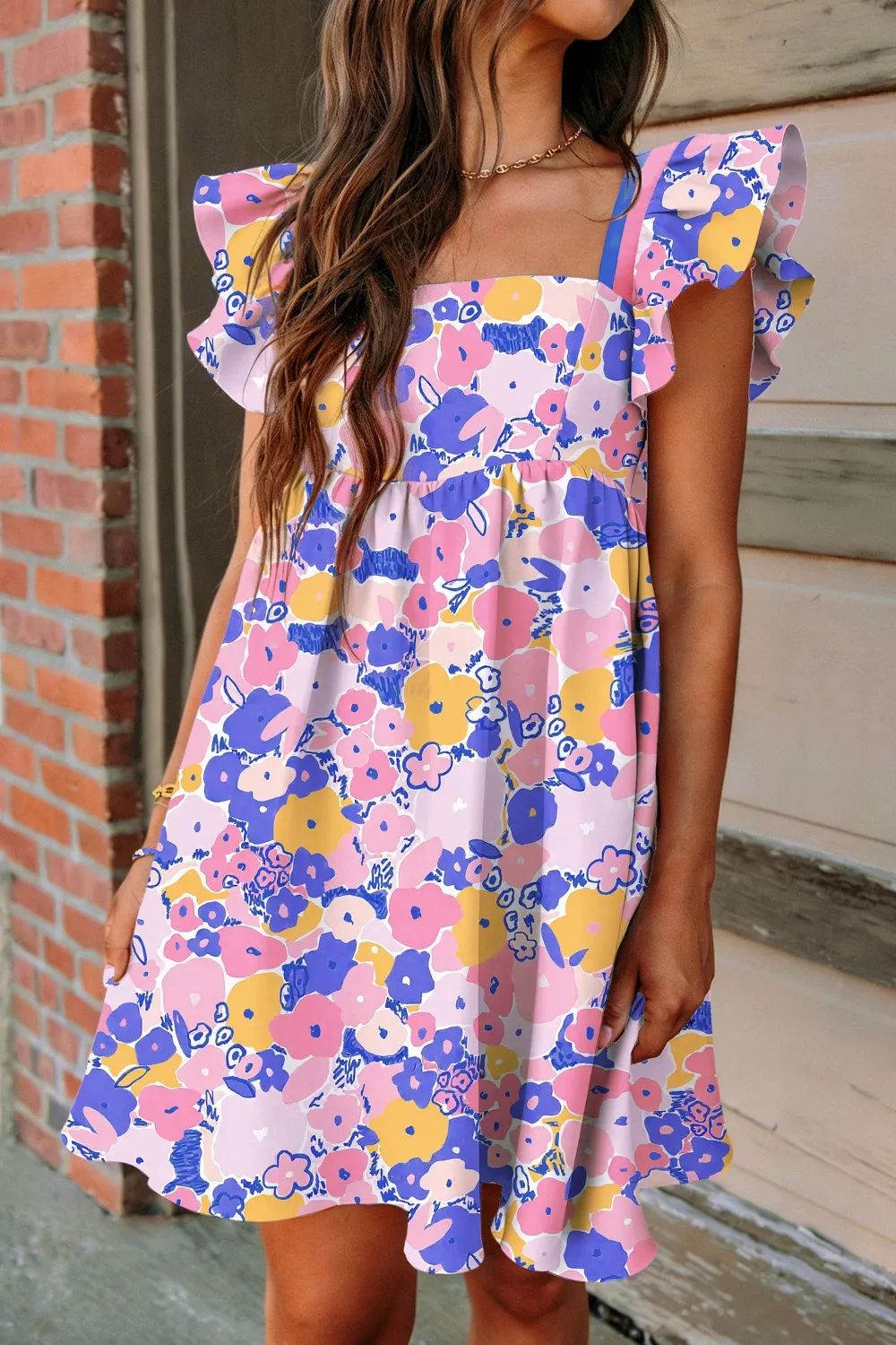 Floral Print Flutter Sleeve Striped Trim Square Neck Loose Mini Dress
