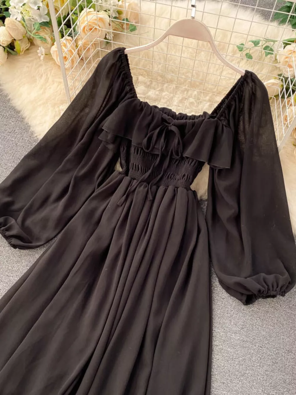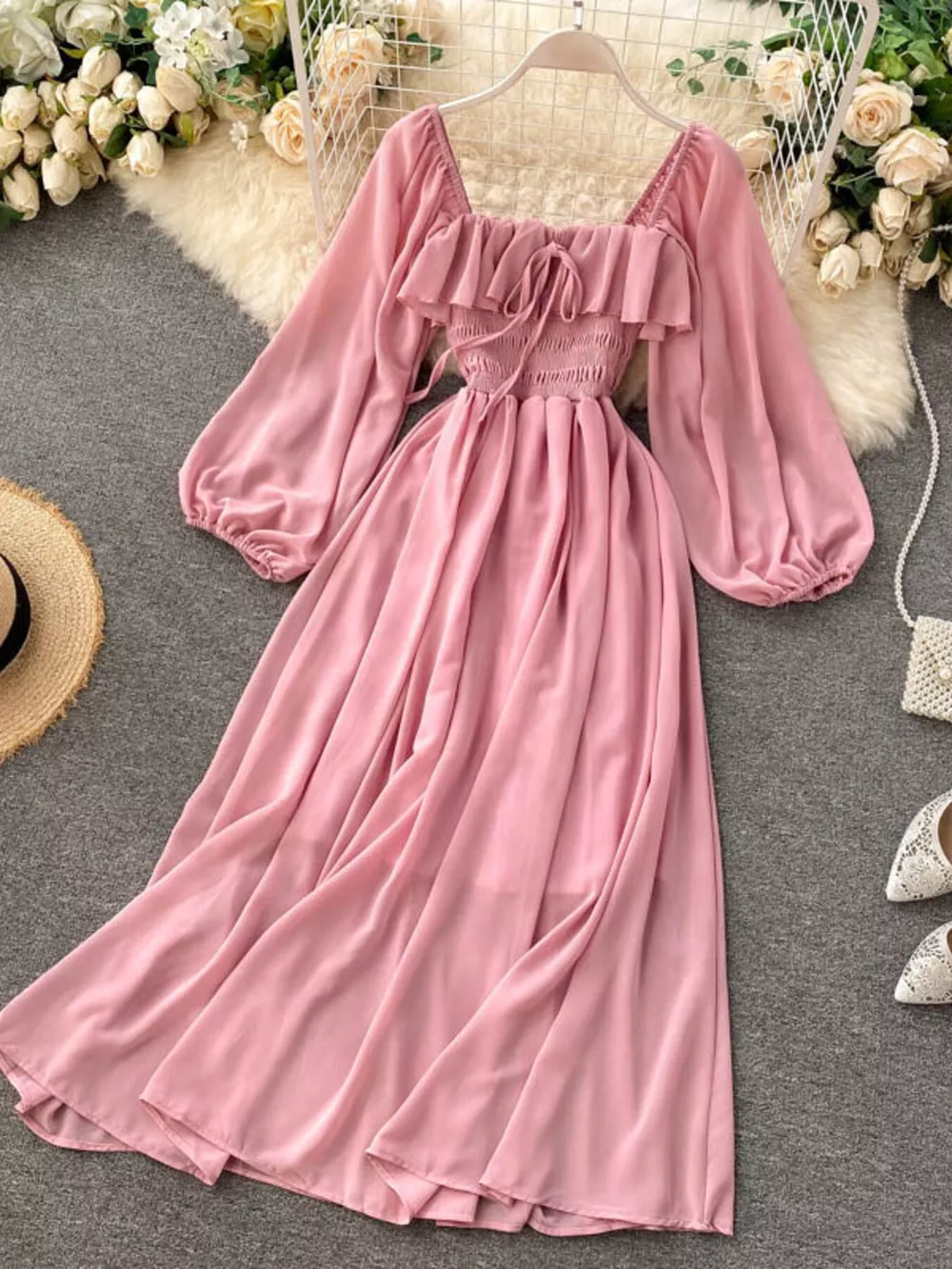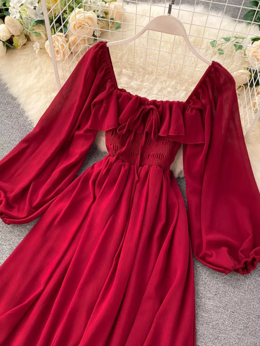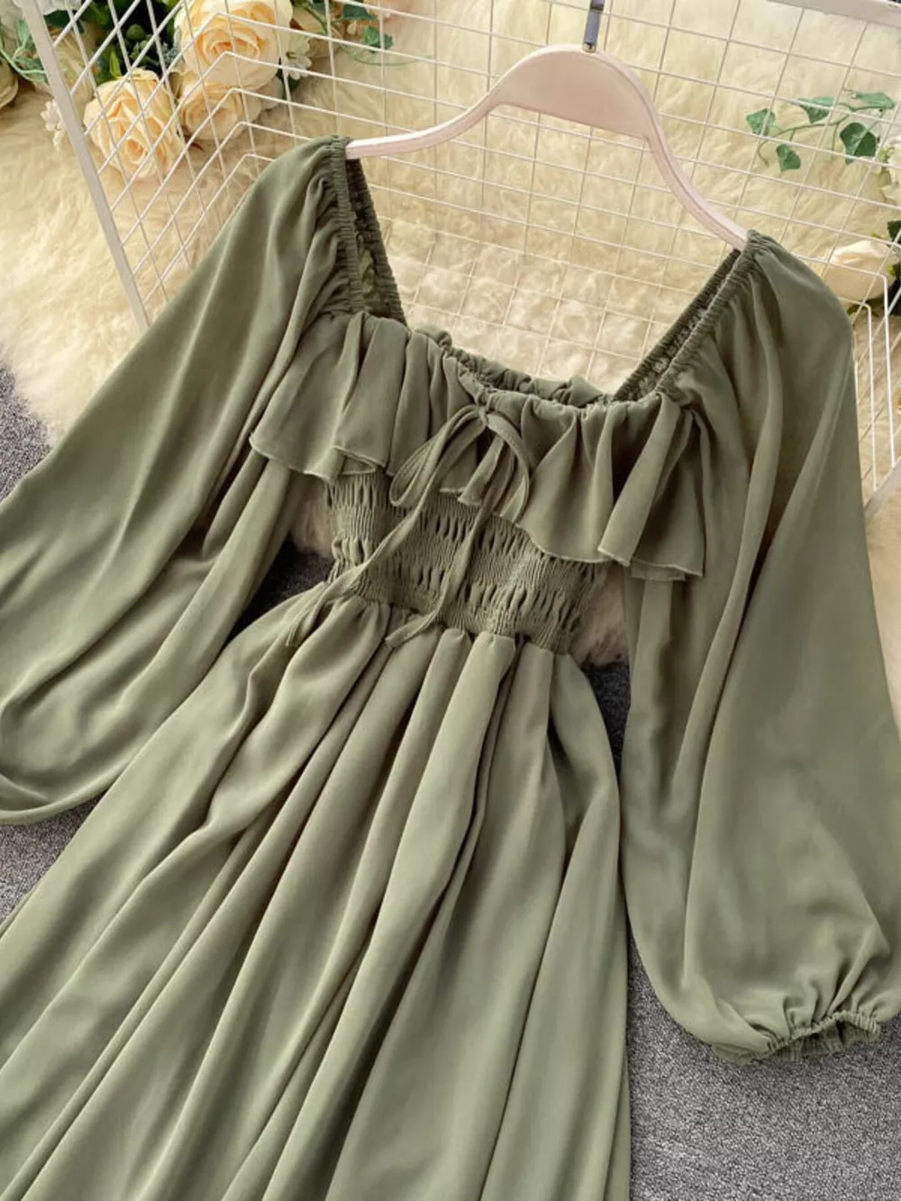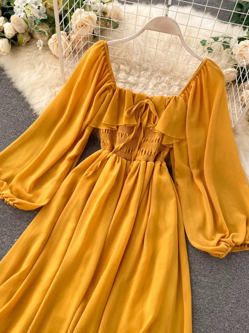 Ruffle Square Neck Balloon Sleeve A-Line Dress