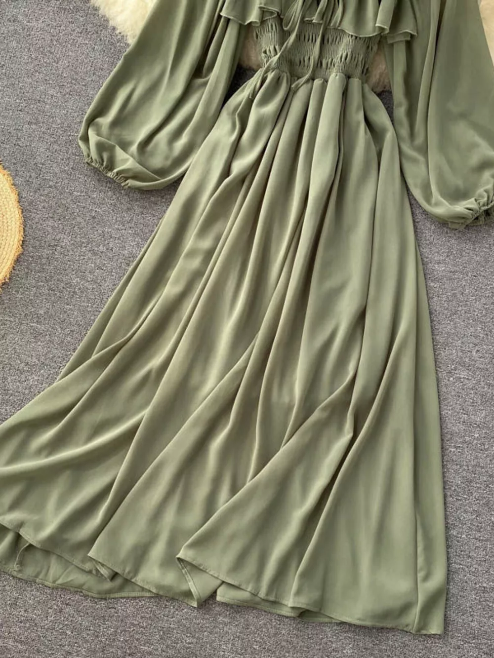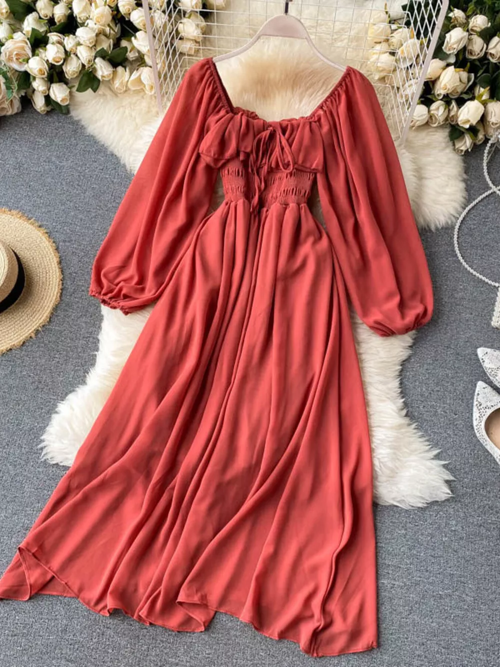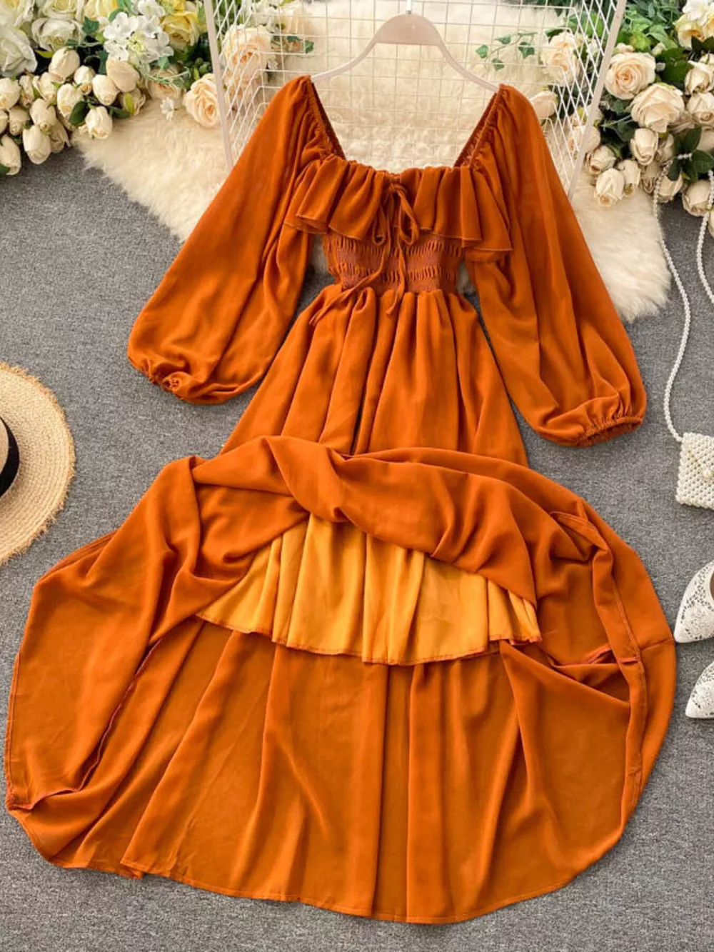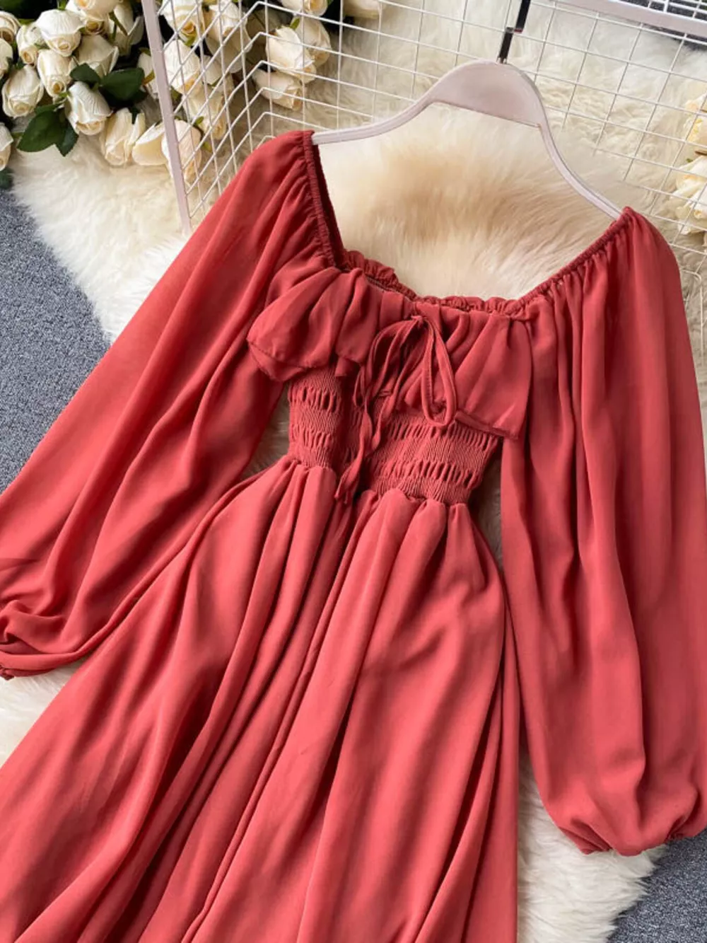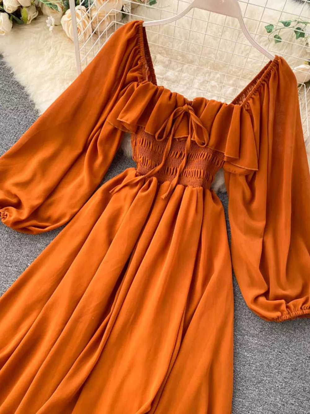 Ruffle Square Neck Balloon Sleeve A-Line Dress
