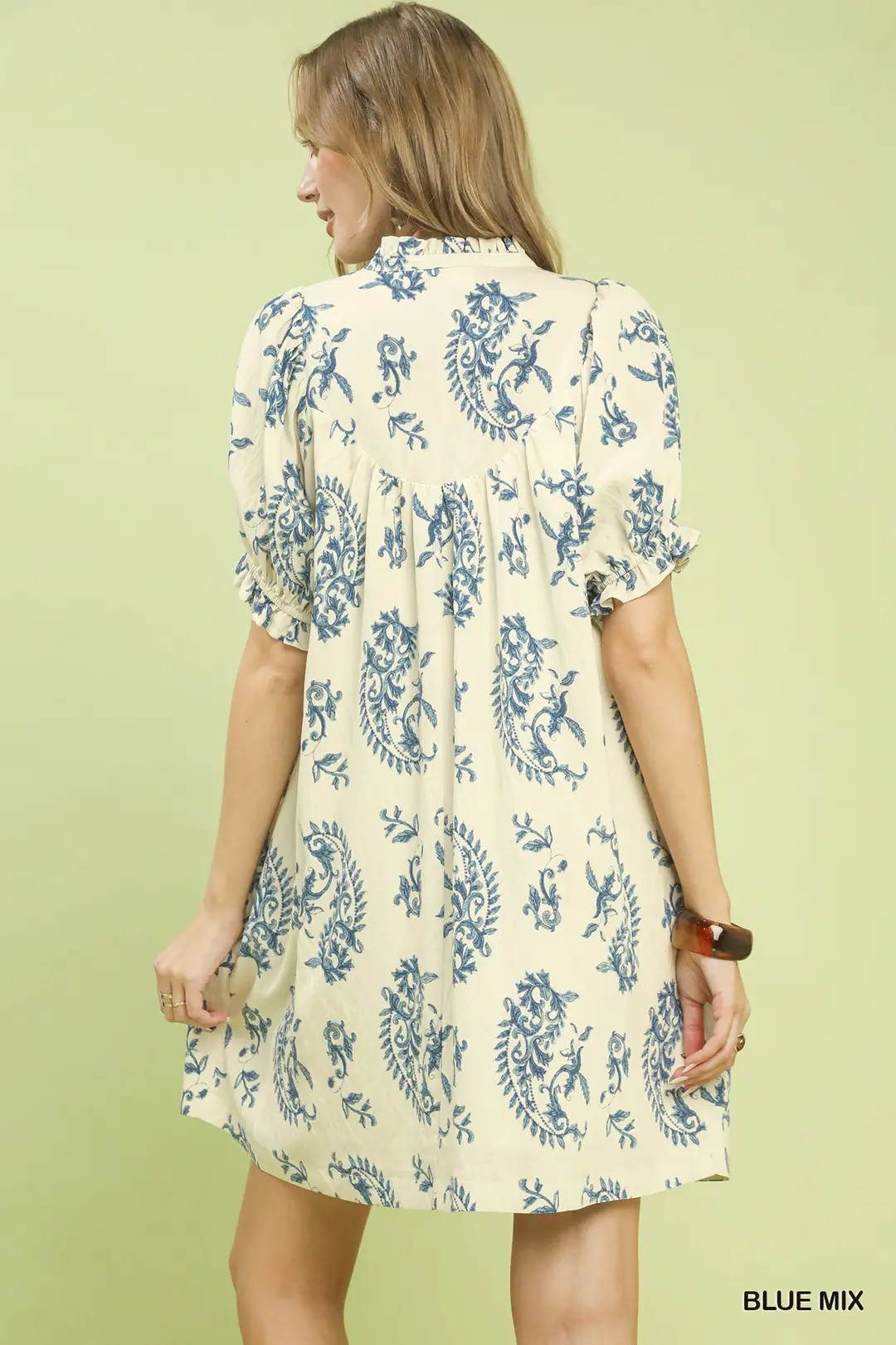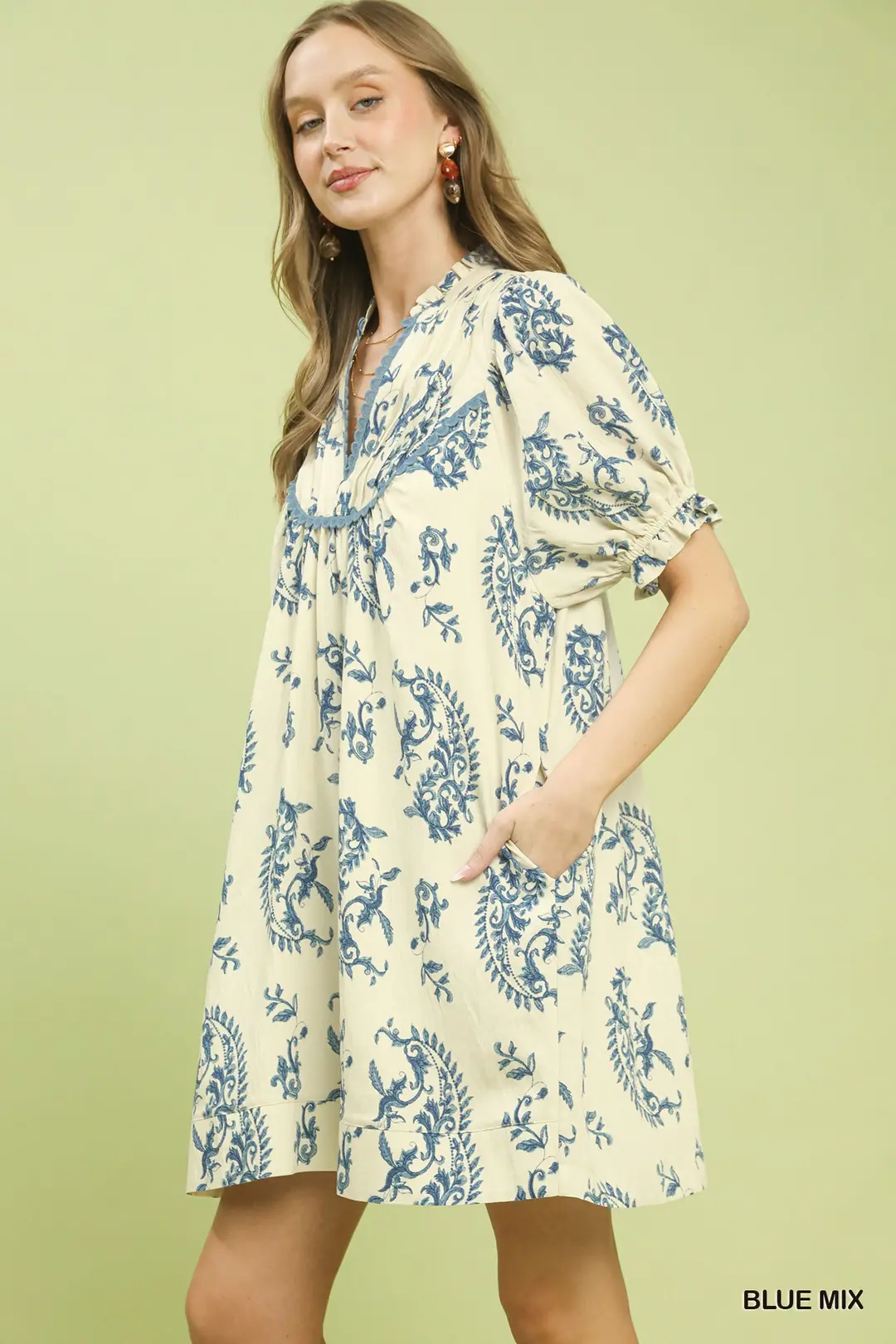 This dress features an allover paisley-inspired print that brings a bohemian and elegant touch to your wardrobe. It is designed with a split V-neck adorned with delicate scalloped trim, paired with short sleeves finished with elastic cuffs for a comfortable and gentle fit. Exquisite lace trim details add subtle romantic and vintage-inspired accents throughout. With its flowy silhouette and unlined lightweight construction, this dress is breathable and perfect for warm-weather gatherings, brunch dates, vacations, and casual daytime occasions.