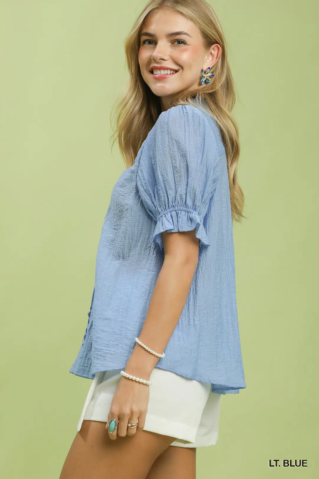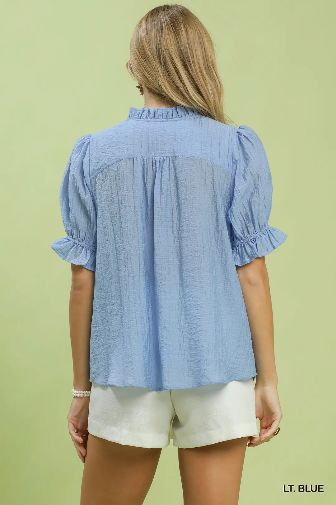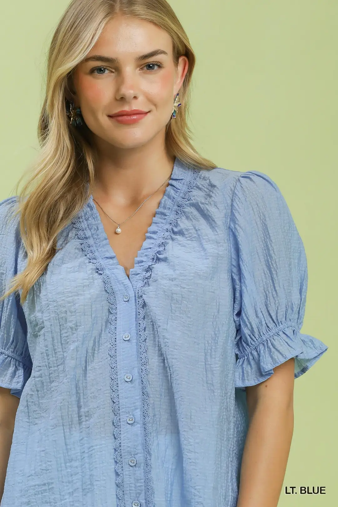Elevate your casual collection with this textured button-front top, designed with romantic feminine details and soft everyday comfort. It features a delicate ruffled V-neckline trimmed with crochet lace for vintage-inspired charm, paired with a full button-front placket for easy wear and adjustable styling. Voluminous puff sleeves are finished with ruffle cuffs to add gentle dimension and flow. Cut in a relaxed boxy silhouette and completed with a subtle hi-low hem, this fully lined piece delivers a smooth, polished fit and all-day wearability. Blending unique textured fabric with sweet boho accents, it pairs effortlessly with jeans, shorts and skirts for brunch, daily outings, weekend gatherings and seasonal casual styling.