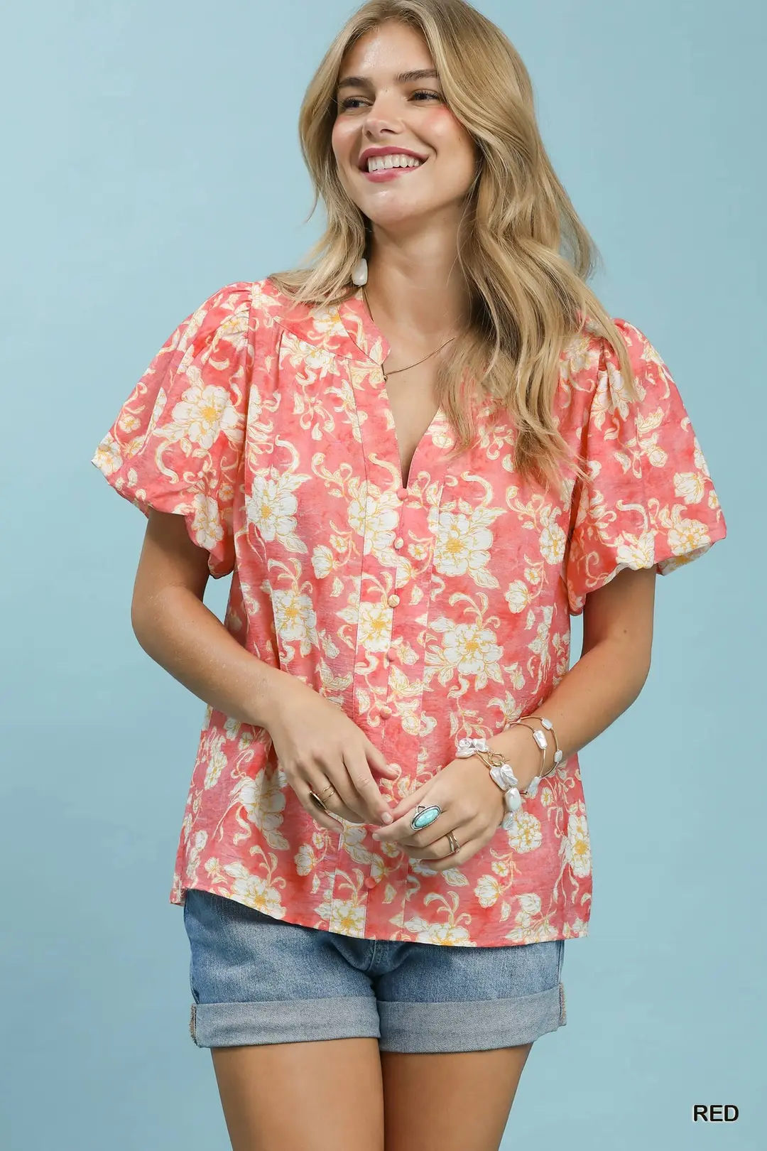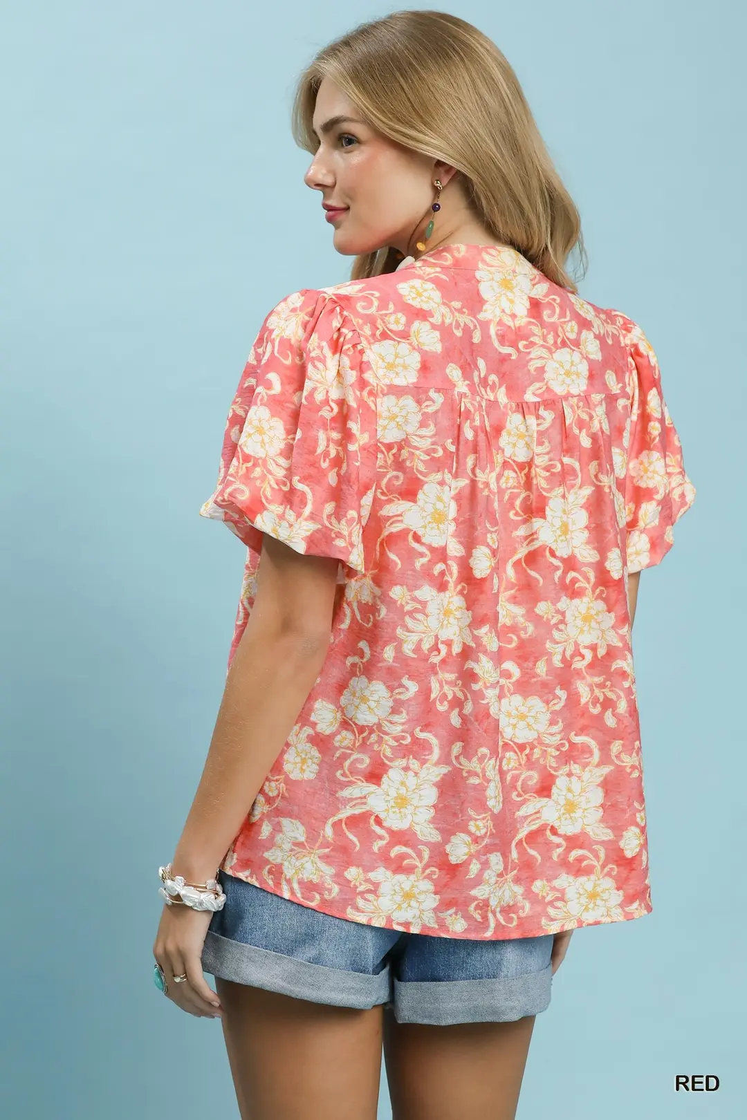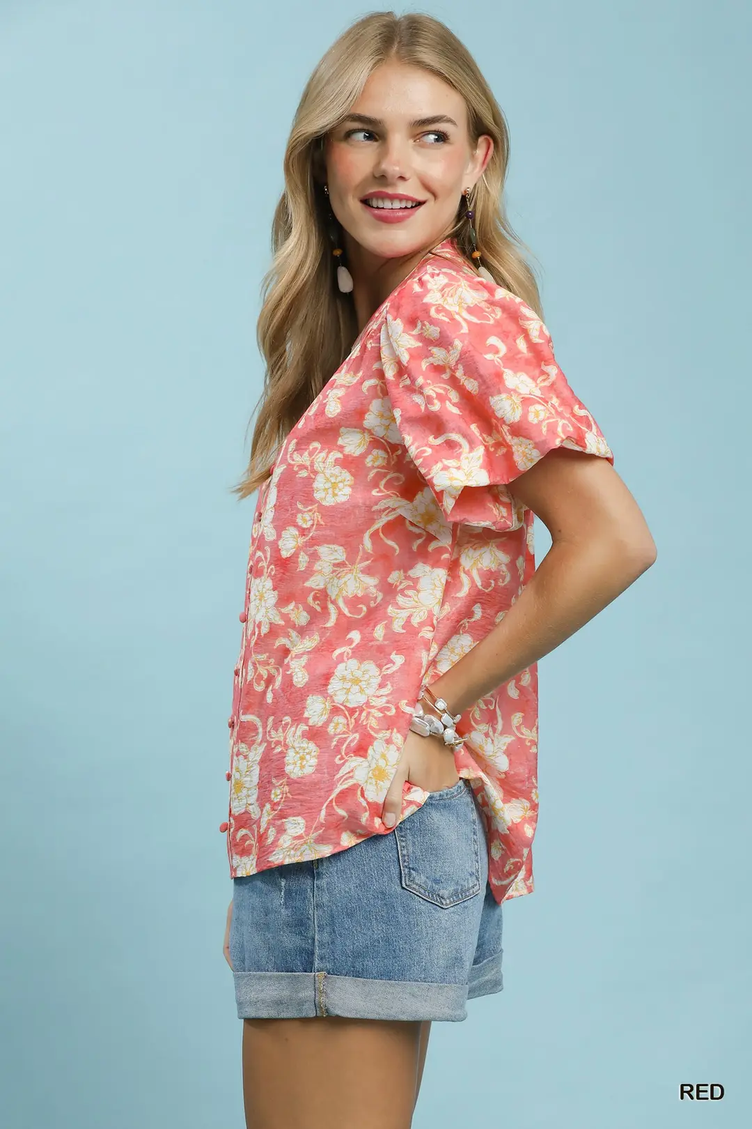 This charming floral button-front top blends sweet romantic style with effortless everyday comfort. It features a stylish split V-neckline and a full button-front placket for easy wear and customizable coverage. Lightweight flutter sleeves bring soft movement and breezy warmth-weather appeal, with lined sleeves for a smooth, refined finish. Designed in a relaxed boxy silhouette and accented by a subtle hi-low hem, it offers a laid-back, flattering fit with added flowy dimension. Versatile and easy to dress up or down, it pairs perfectly with jeans, shorts and casual bottoms, ideal for daily outings, brunch dates, weekend trips and casual seasonal wear.